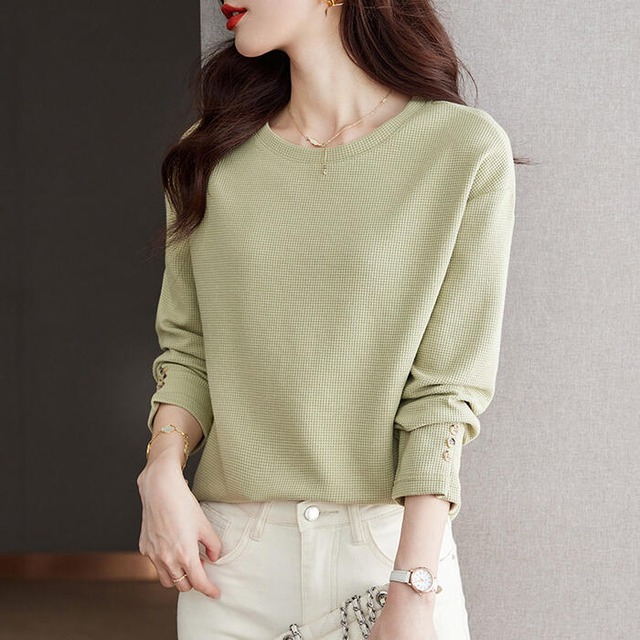 大きいサイズ 体型カバー トップス Tシャツ カットソー ロンT プルオーバー クルーネック ワッフル サーマル エレガント レディース 大人 可愛い きれいめ カジュアル フェミニン 長袖 シンプル インナー グリーン 緑 春 秋 冬 20代 30代 40代 50代