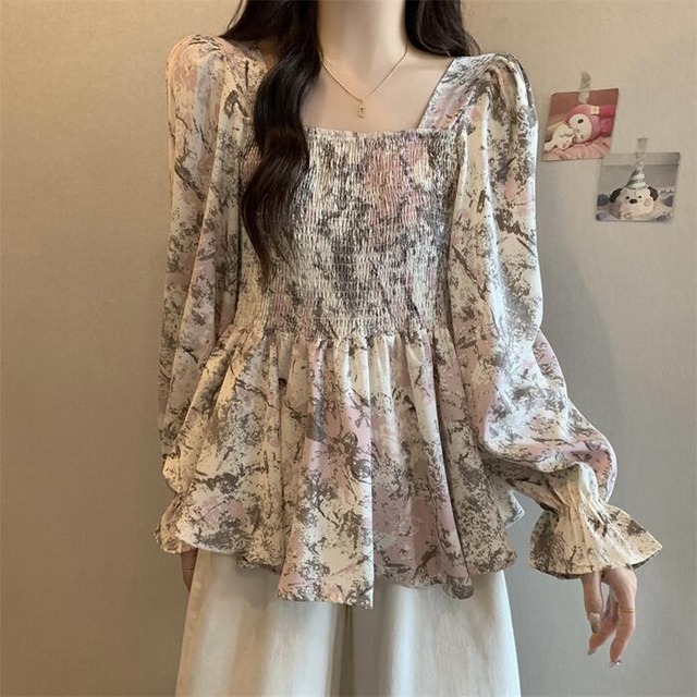 全2色 大きいサイズ 体型カバー トップス ブラウス カットソー シャツ プルオーバー スクエアネック プリント シャーリング エレガント レディース 大人 可愛い きれいめ カジュアル フェミニン 長袖 花柄 おしゃれ クラシカル ブルー 青 ピンク 春 秋 冬 20代 30代 40代 50代