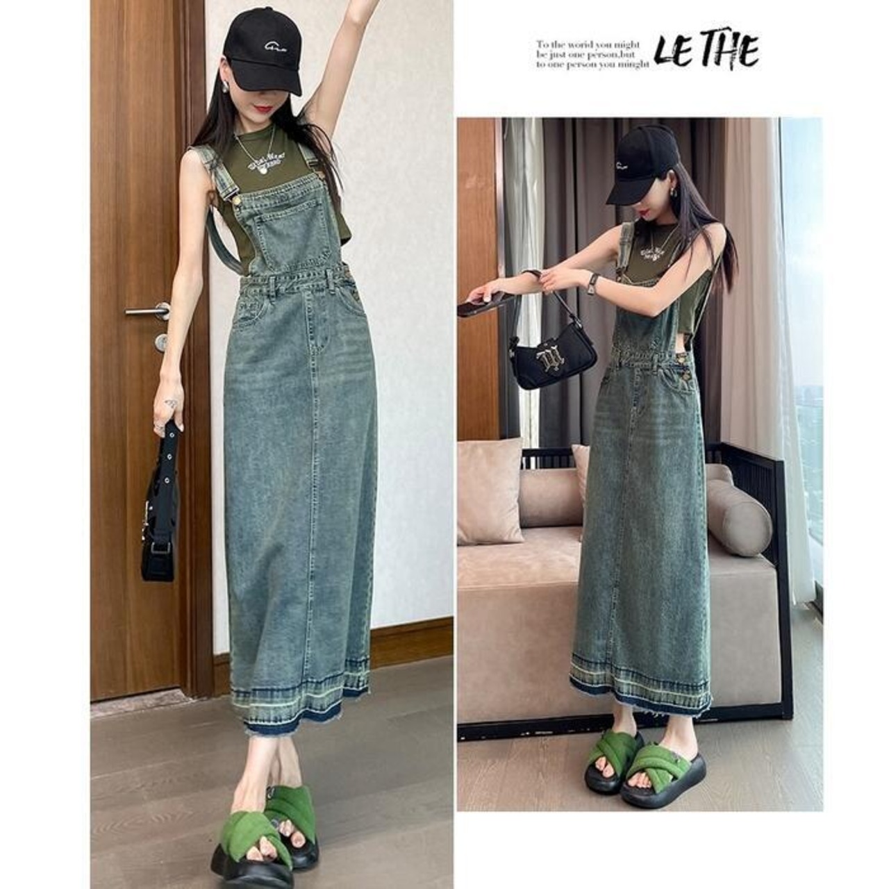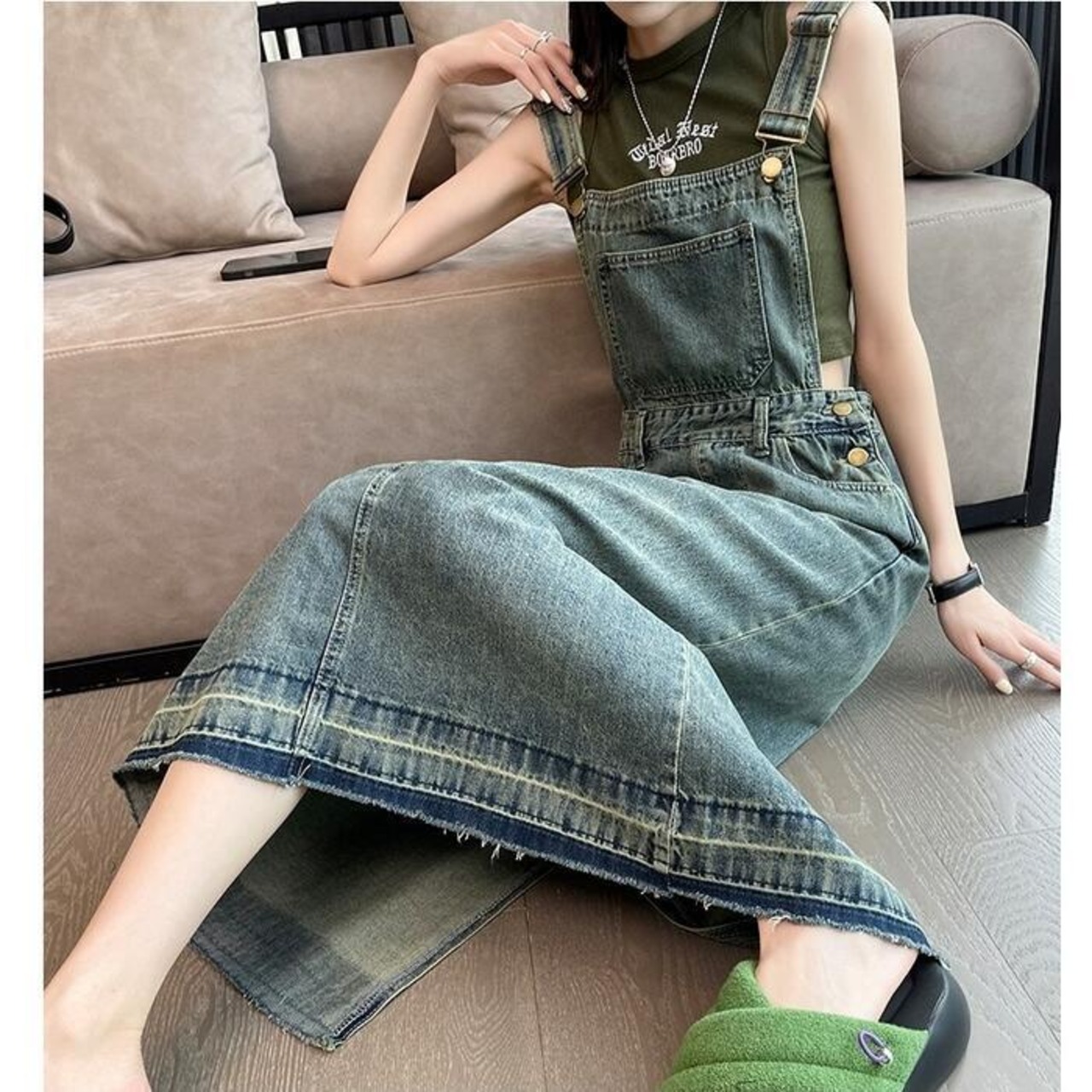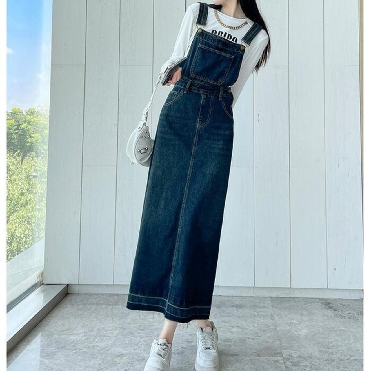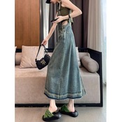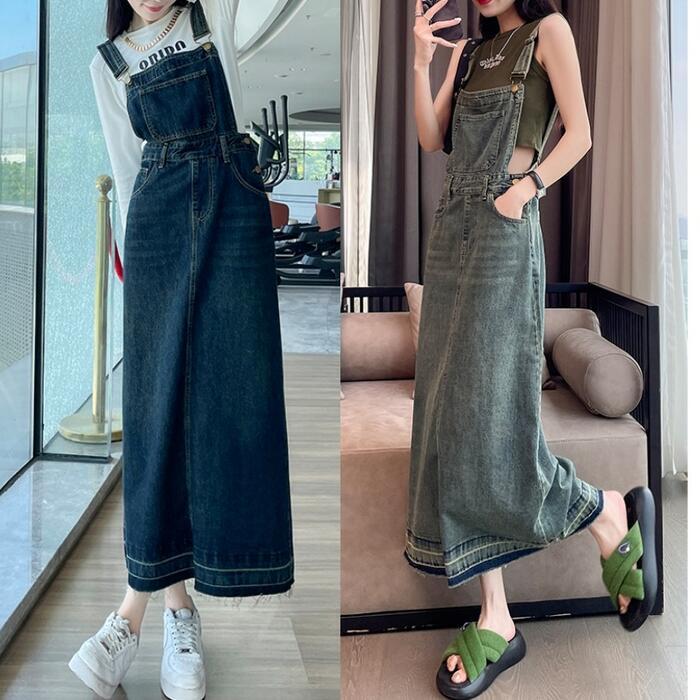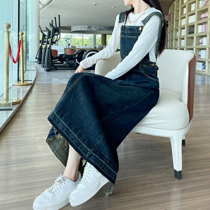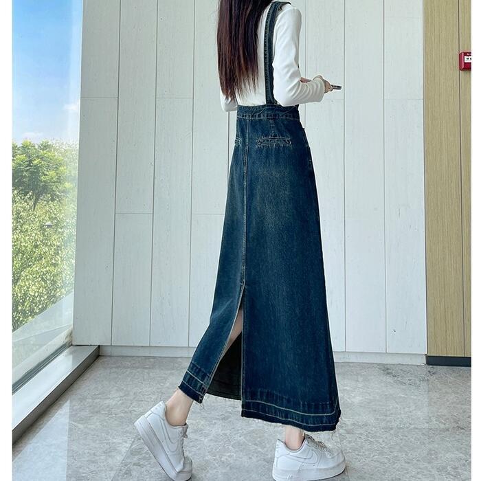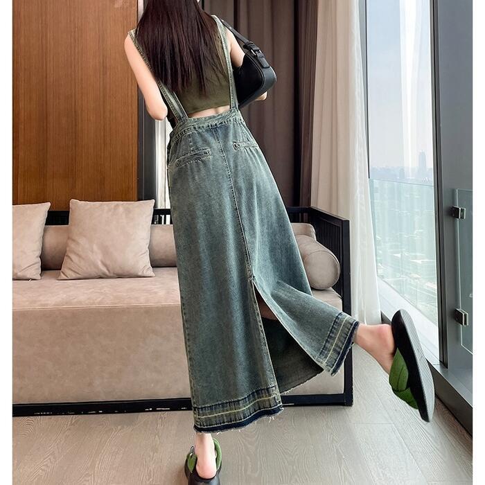 落ち着いたフレアなシルエットのデニムサロペットスカート。