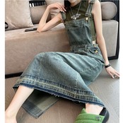全2色 大きいサイズ 体型カバー オールシーズン おしゃれ ワンピース ジャンパースカート ボトムス スカート サロペットスカート デニム レディース きれいめ カジュアル ミモレ丈 台形スカート 大人 可愛い ハイウエスト シンプル フェミニン ヴィンテージ ブルー 青 ネイビー 春 夏 秋 冬 20代 30代 40代 50代