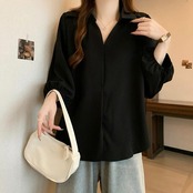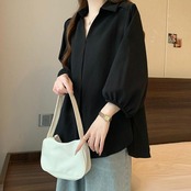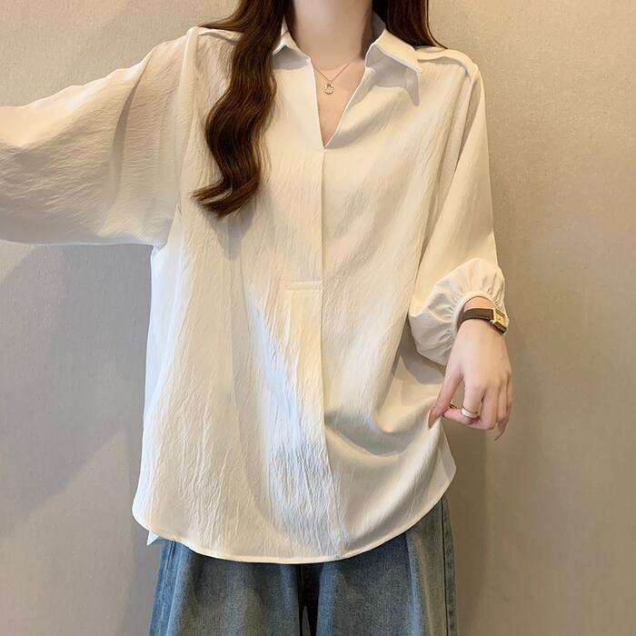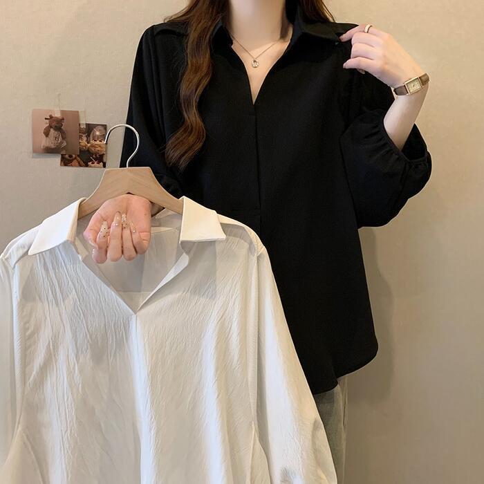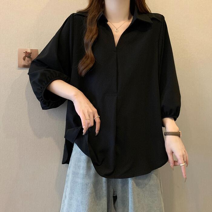 全2色 大きいサイズ 体型カバー トップス シャツ ブラウス スキッパー Vネック エレガント レディース 大人 可愛い 七分袖 パフスリーブ きれいめ カジュアル フェミニン ナチュラル シンプル シワ加工 ベージュ ブラック 黒 ゆったり 春 秋 夏 20代 30代 40代 50代