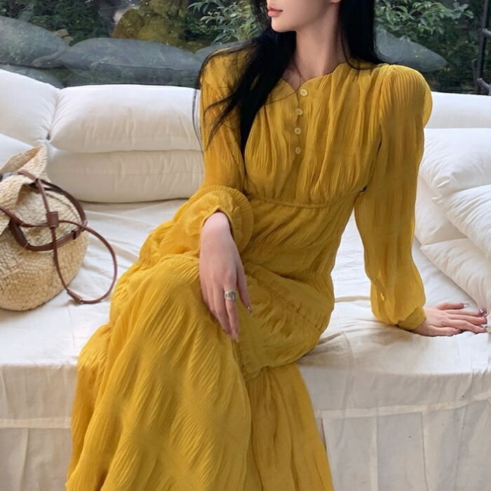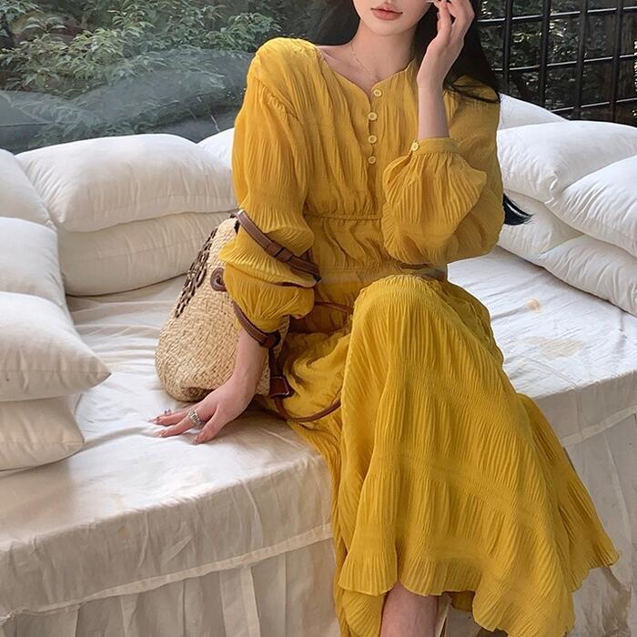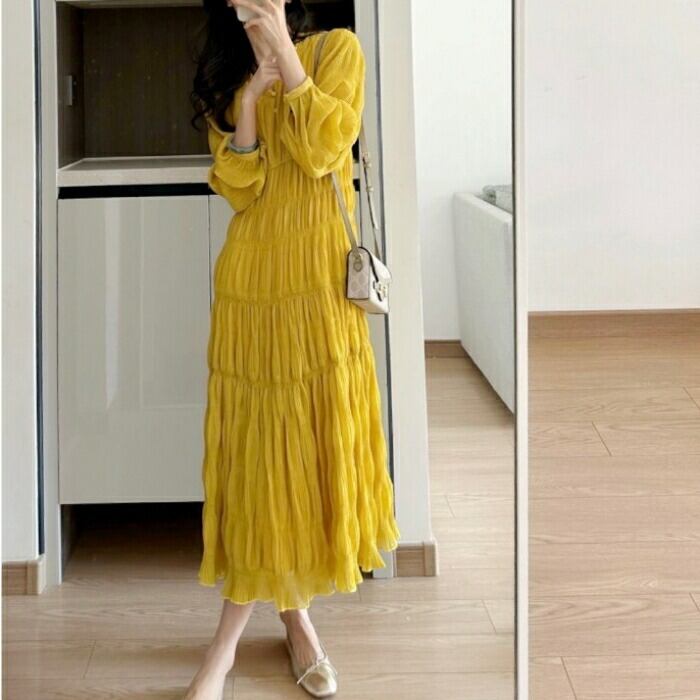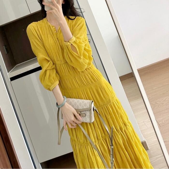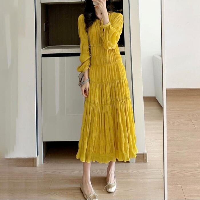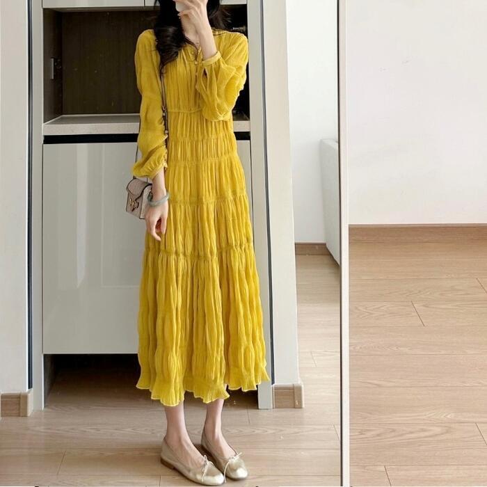 大きいサイズ 体型カバー ワンピース ドレス ティアード シワ加工 リンクル ロングワンピ レディース エレガント きれいめ カジュアル ミモレ丈 大人 可愛い Aライン シンプル 長袖 ゆったり フェミニン おしゃれ イエロー 春 夏 秋 20代 30代 40代 50代
