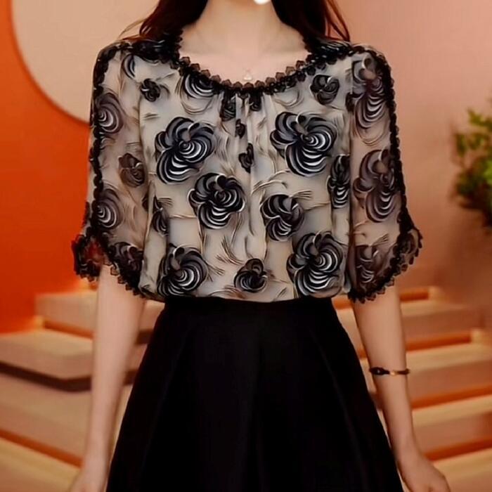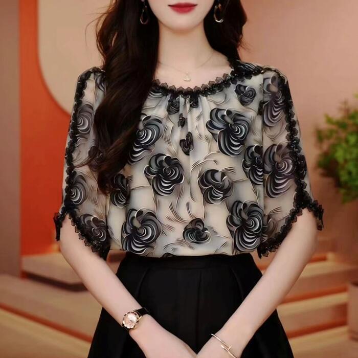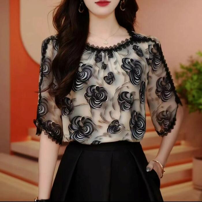 シックなフラワープリント柄がエレガントなシフォンブラウス。