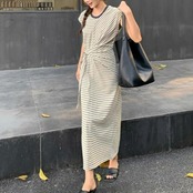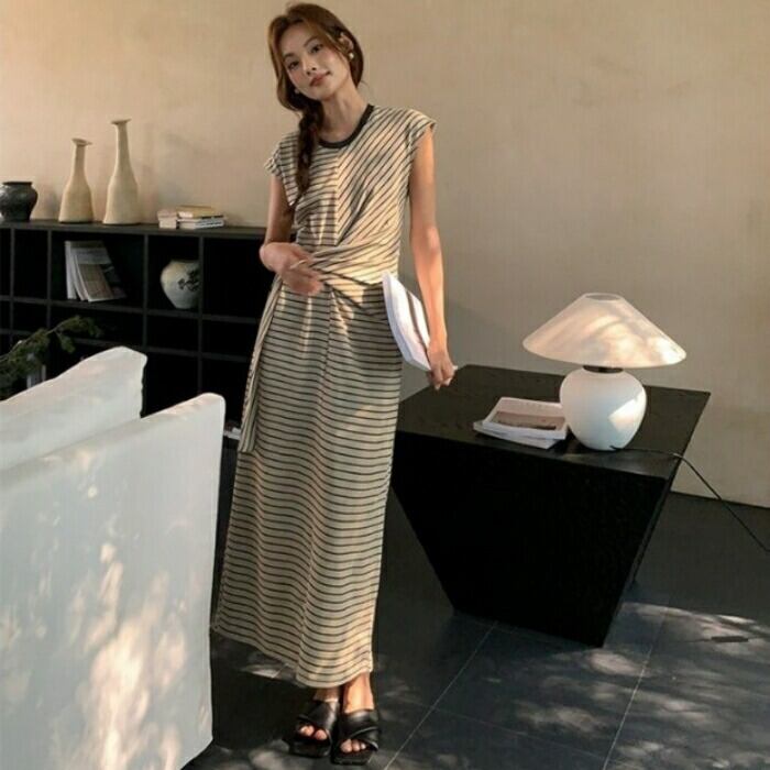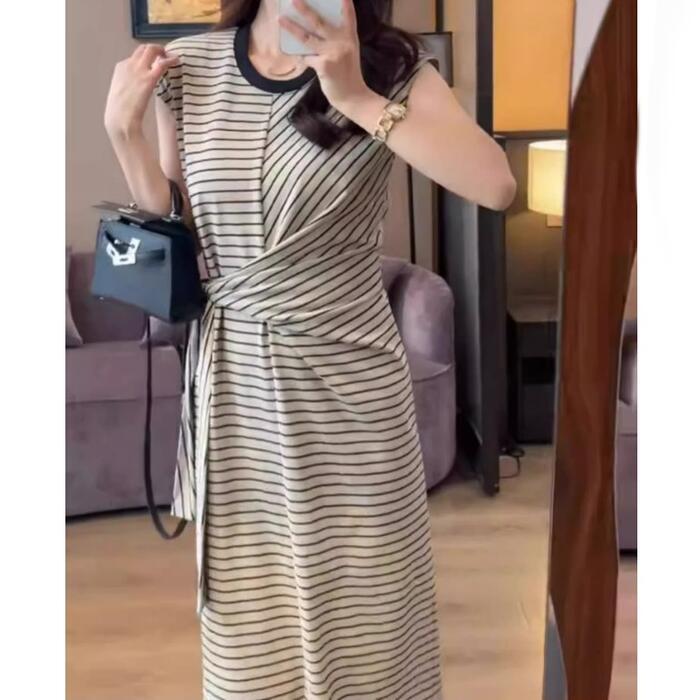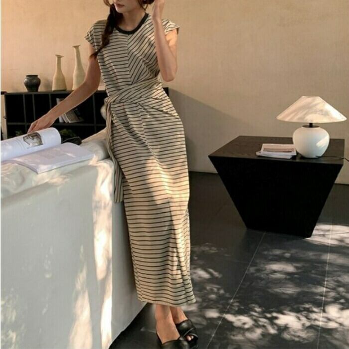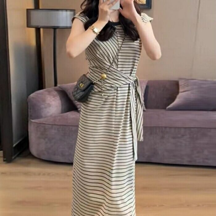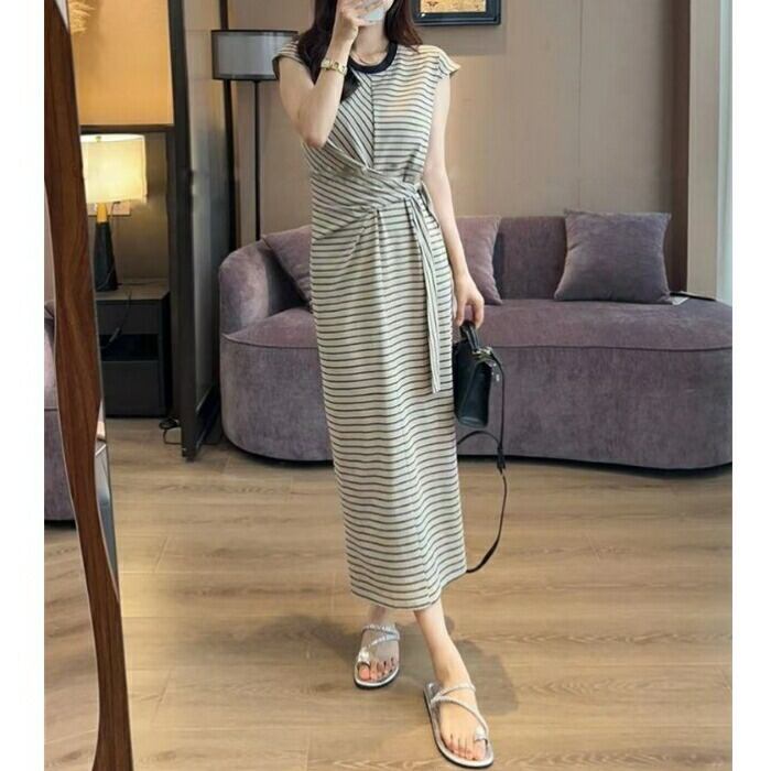 大きいサイズ 体型カバー ワンピース ドレス ボーダー Tシャツワンピ レディース エレガント きれいめ カジュアル ロング丈 大人 可愛い シンプル 半袖 ウエストリボン フェミニン ナチュラル おしゃれ リラックス フレンチスリーブ ベージュ 春 夏 秋 20代 30代 40代 50代