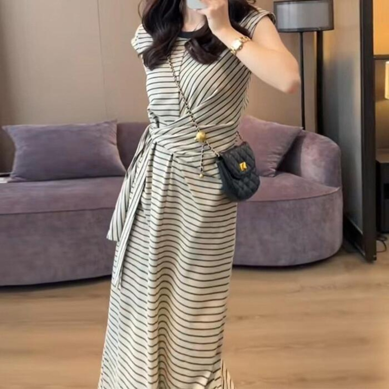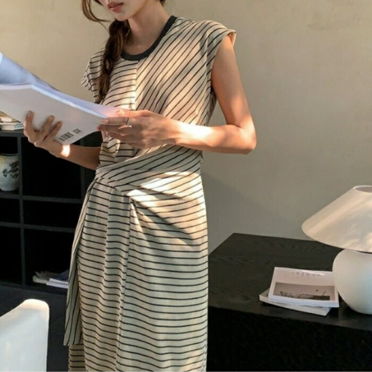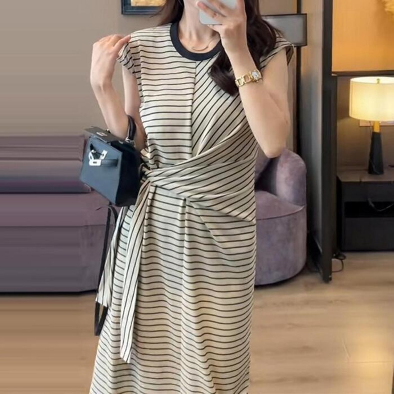 ウエストのタイデザインがアクセントになったボーダーワンピース。