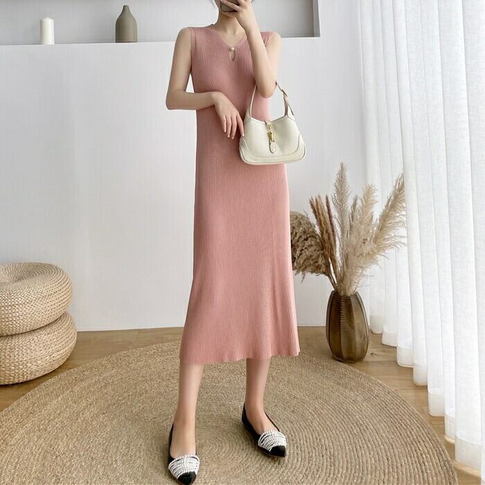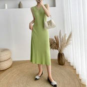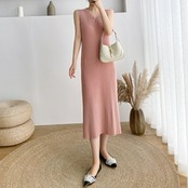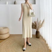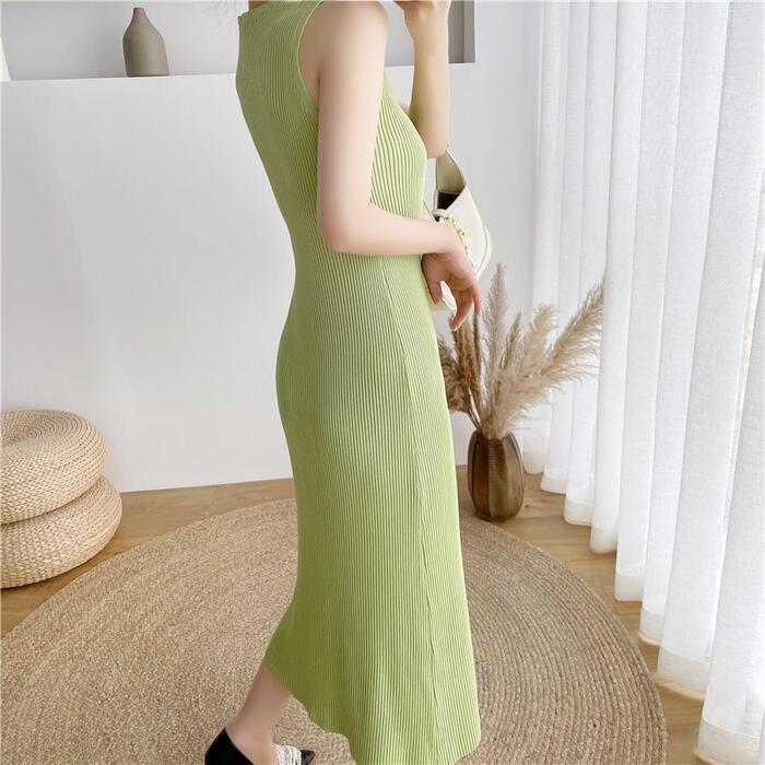 伸縮性のあるリブニットのノースリーブワンピース。