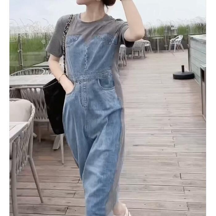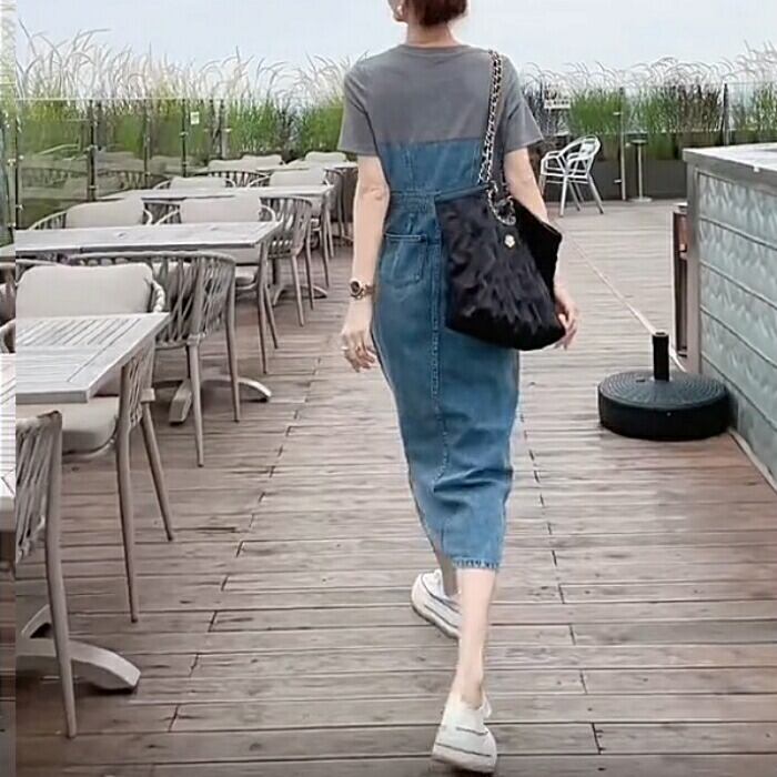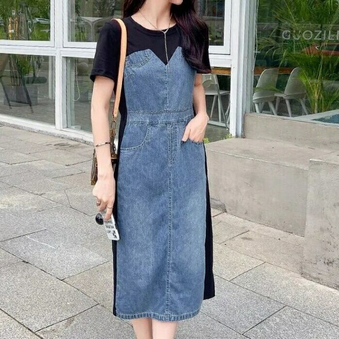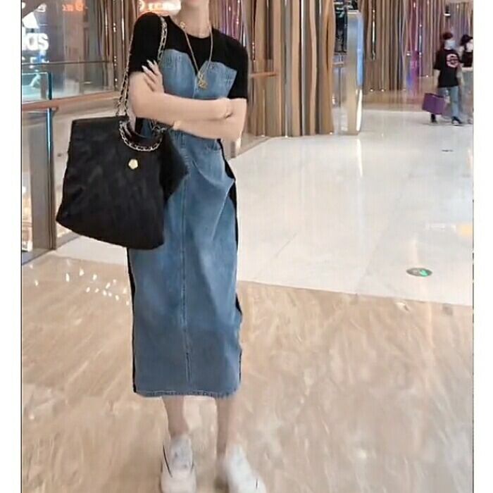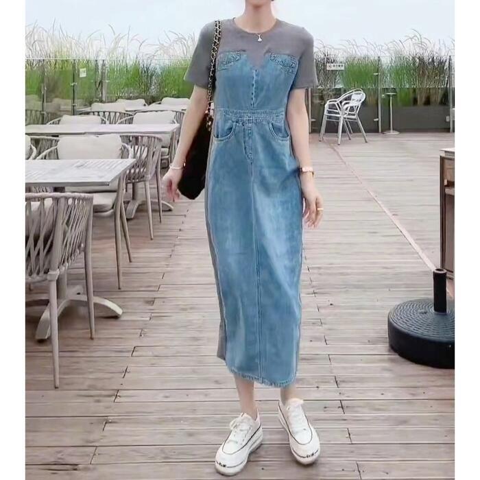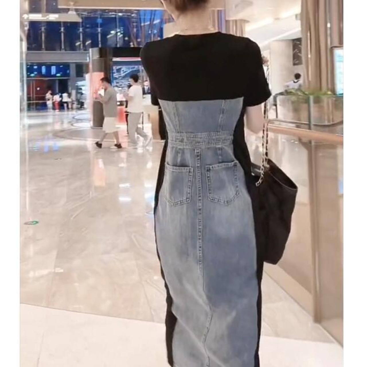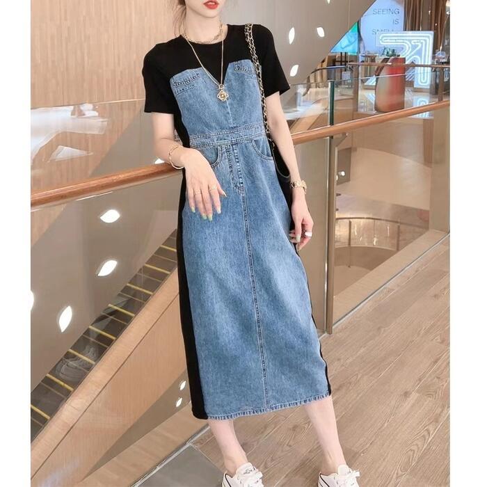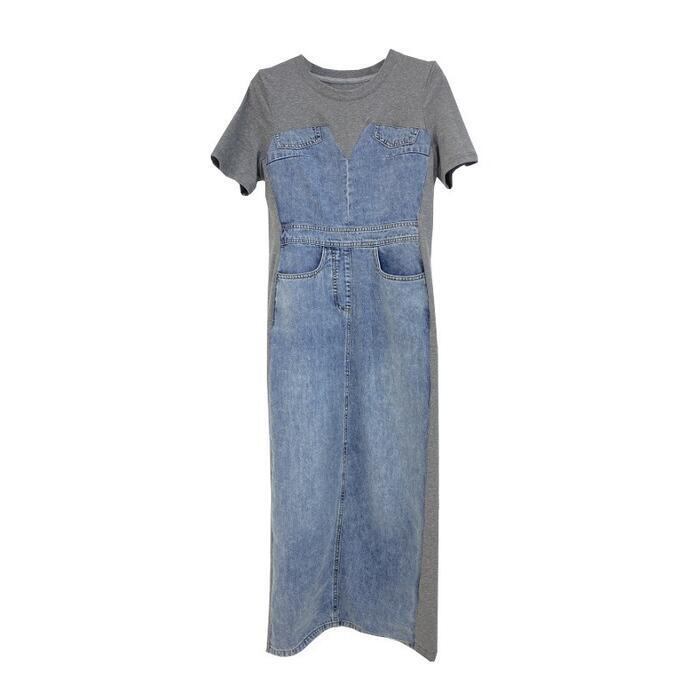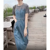全2色 大きいサイズ 体型カバー フェミニン おしゃれ ワンピース ドレス フェイクレイヤード 袖あり Tシャツ デニム ドッキング レディース エレガント きれいめ カジュアル ミモレ丈 大人 可愛い 半袖 異素材ミックス シンプル グレー 春 夏 秋 20代 30代 40代 50代