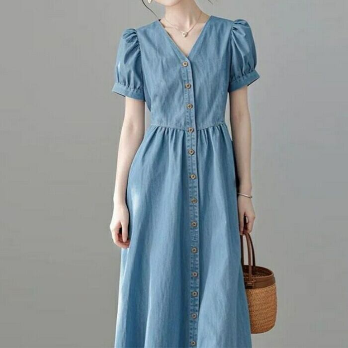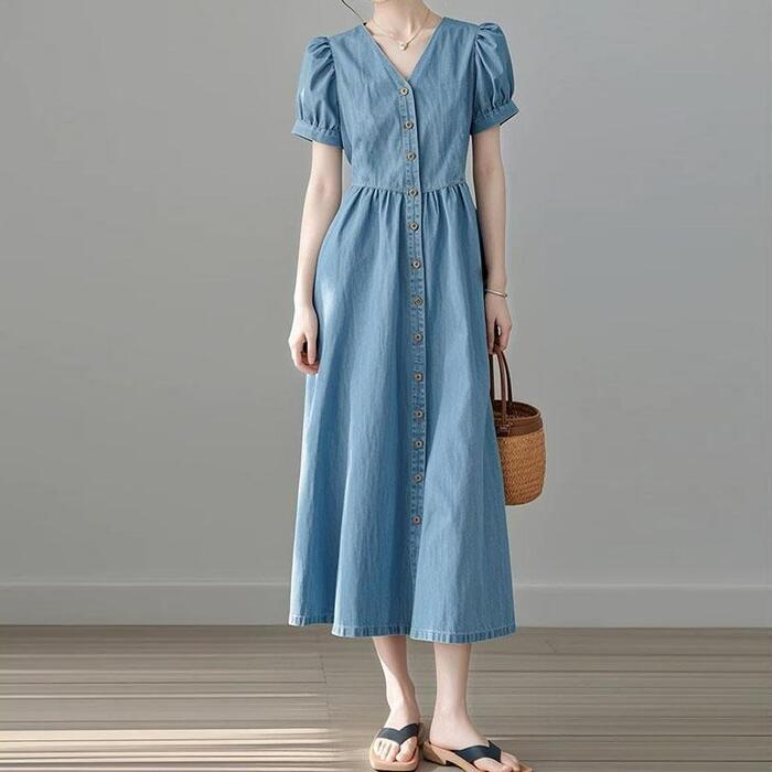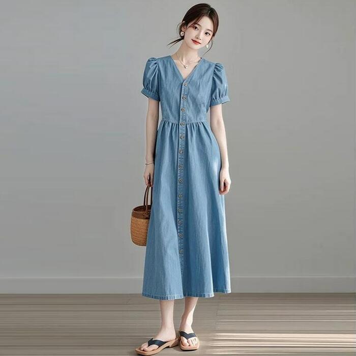大きいサイズ 体型カバー ワンピース ドレス 袖あり デニム シャツワンピ パフスリーブ レディース エレガント きれいめ カジュアル ミモレ丈 大人 可愛い 半袖 シンプル Vネック Aライン フェミニン おしゃれ ブルー 青 春 夏 秋 20代 30代 40代 50代