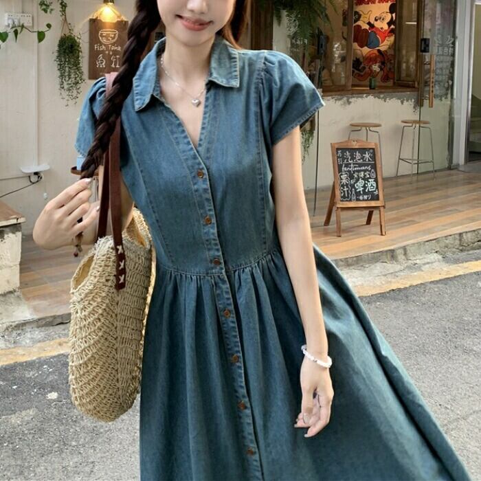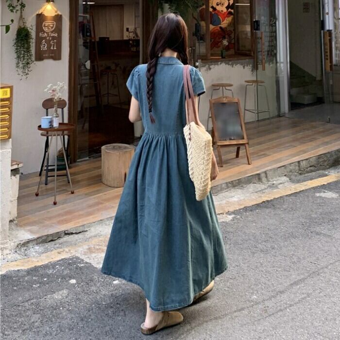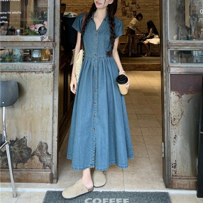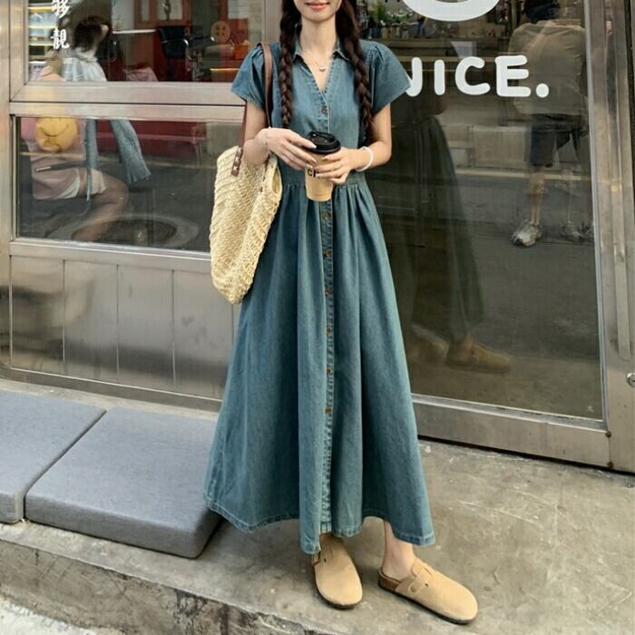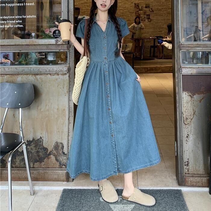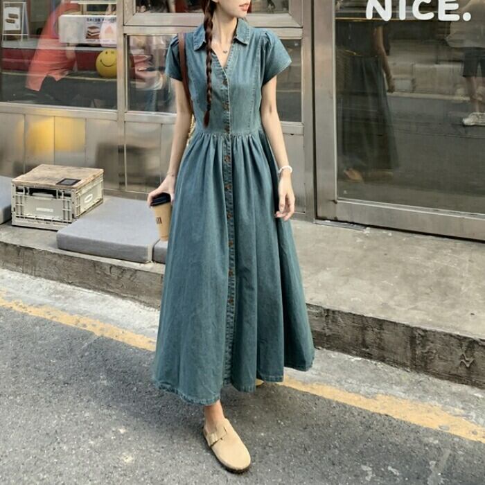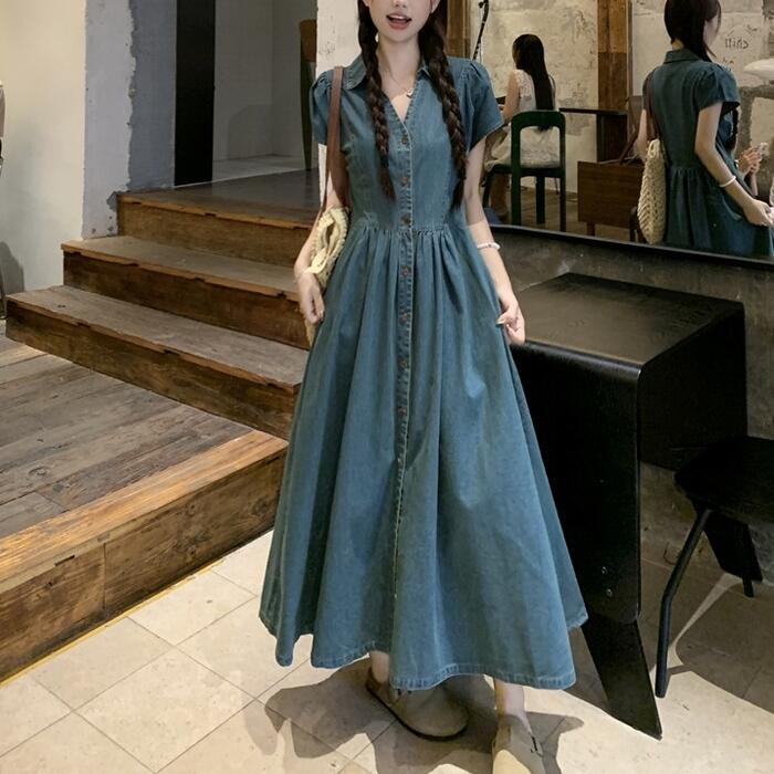 大きいサイズ 体型カバー デニム ワンピース ドレス 袖あり 襟付き レディース エレガント きれいめ カジュアル ロング丈 大人 可愛い 半袖 ハイウエスト シンプル Aライン Vネック フェミニン おしゃれ 青 ブルー 春 夏 秋 20代 30代 40代 50代