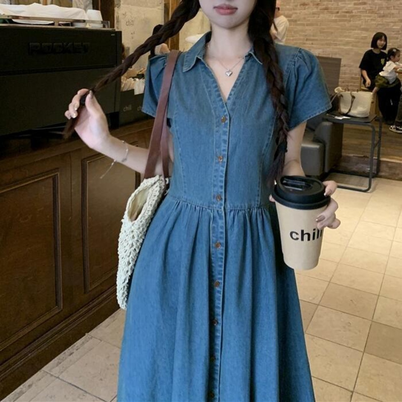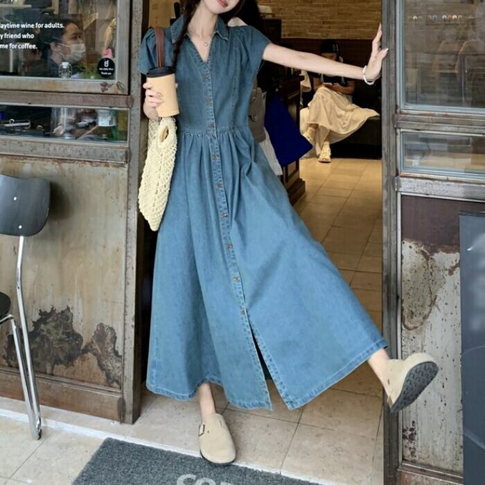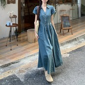 襟付きVネックが女性らしいロングデニムワンピース。