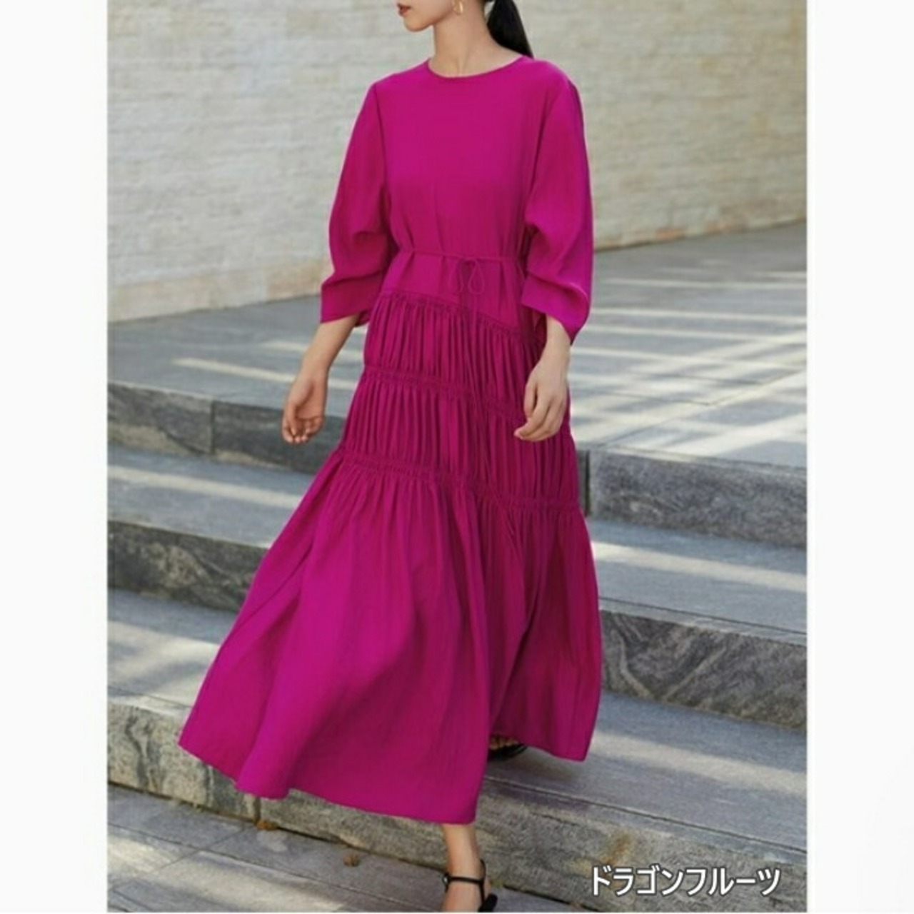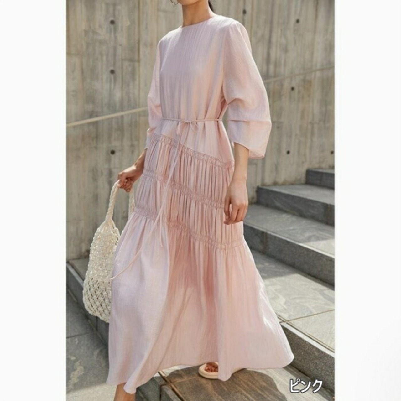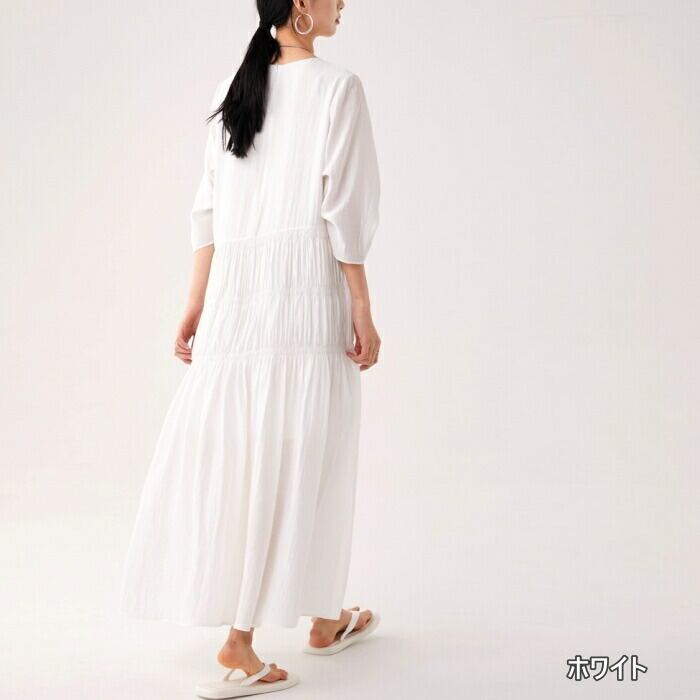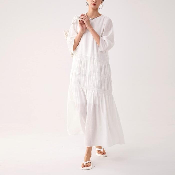 お腹周りのギャザー切り替えがポイントになったワンピース。