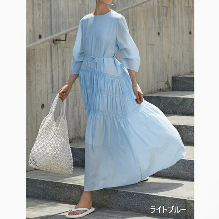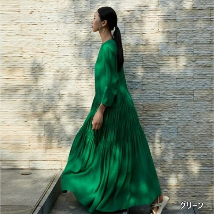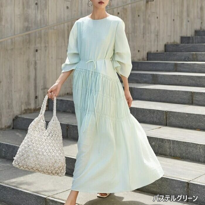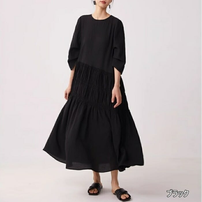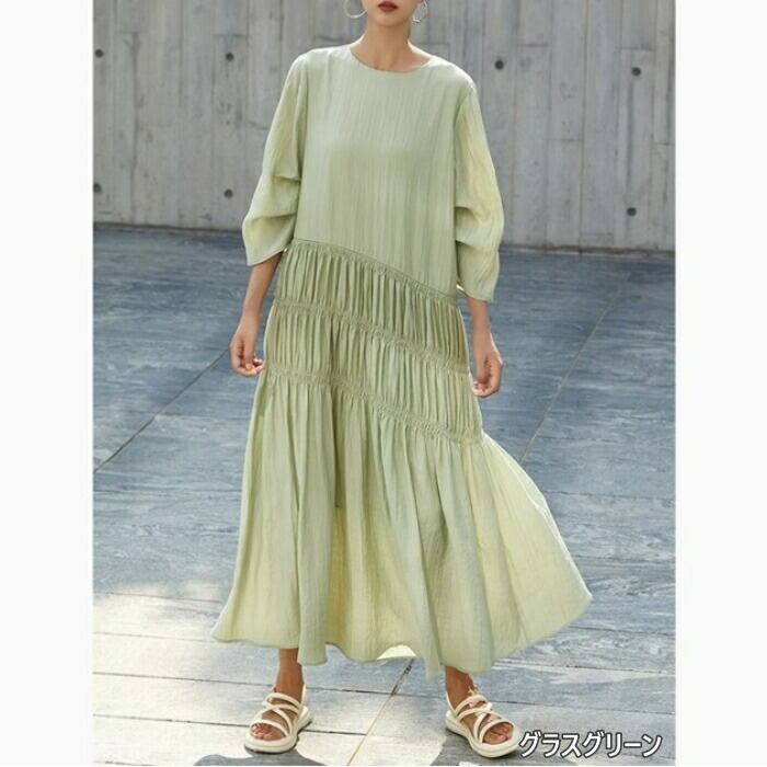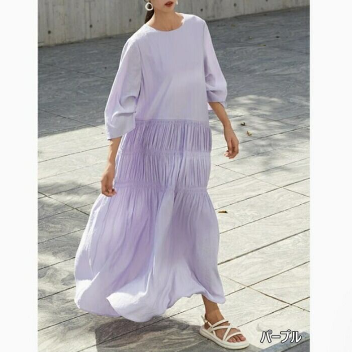 全9色 大きいサイズ 体型カバー ゆったり シンプル ワンピース ドレス ギャザー 袖あり レディース エレガント きれいめ カジュアル ロング丈 大人 可愛い 七分袖 Aライン フェミニン おしゃれ ブルー 青 グリーン 緑 ピンク ホワイト 白 パープル ブラック 黒 春 夏 秋 20代 30代 40代 50代