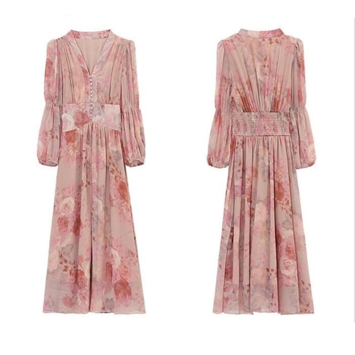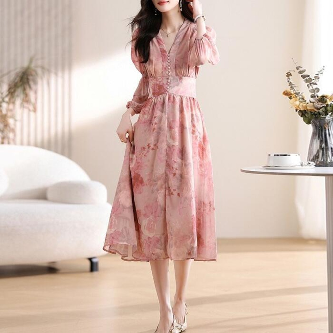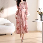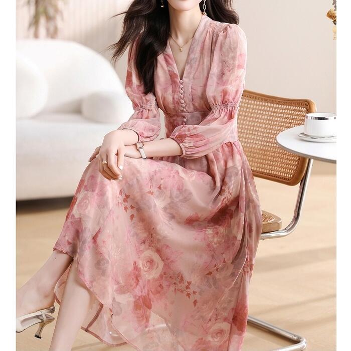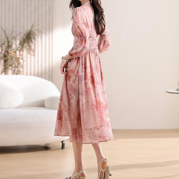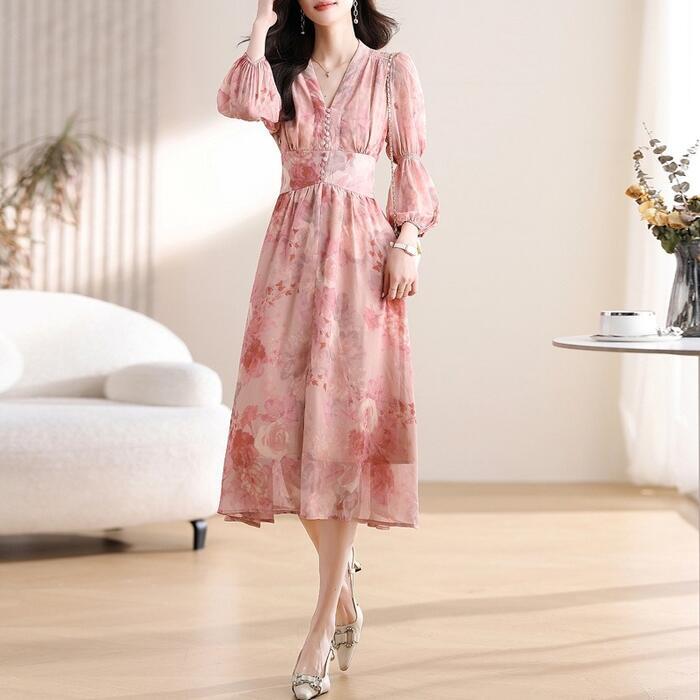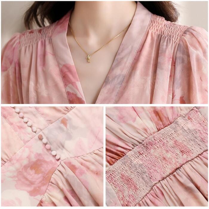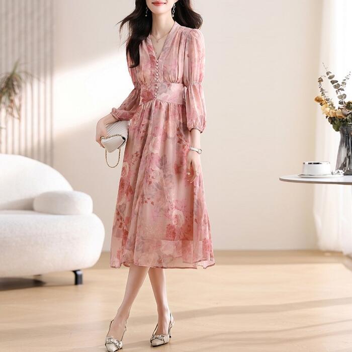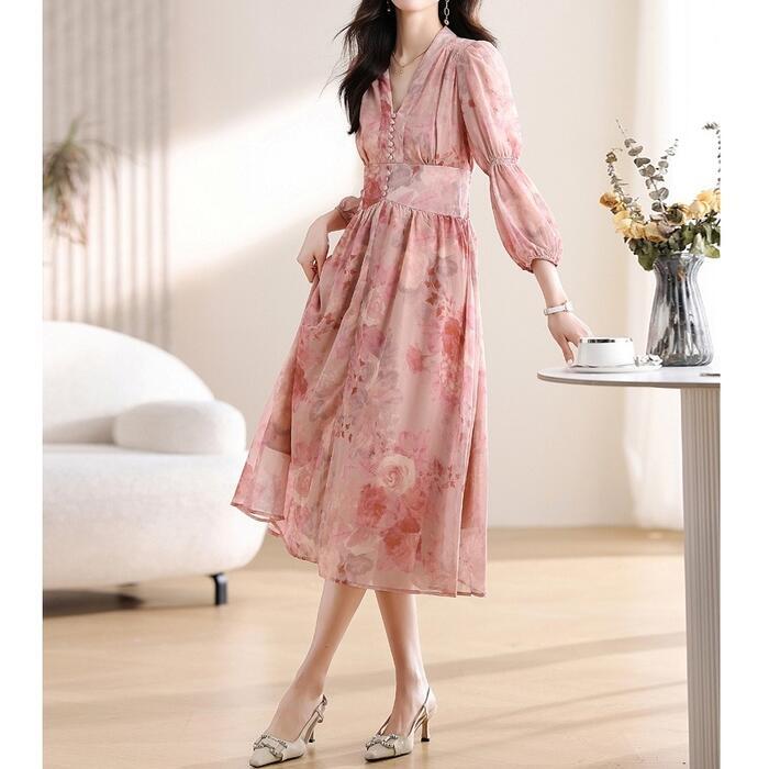 大きいサイズ 体型カバー ワンピース ドレス 袖あり フラワー 花柄 レディース エレガント きれいめ カジュアル ミモレ丈 シフォン 大人 可愛い 七分袖 Aライン フェミニン おしゃれ Vネック パフスリーブ ハイウエスト ピンク 春 夏 秋 20代 30代 40代 50代