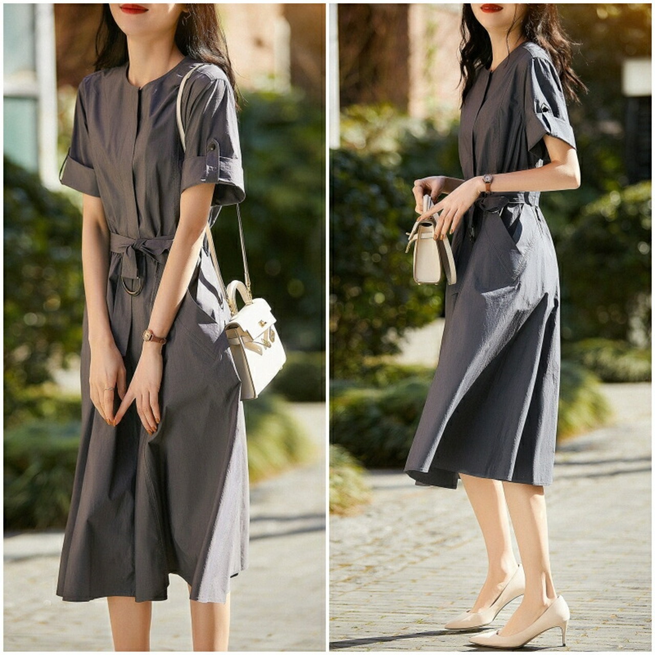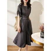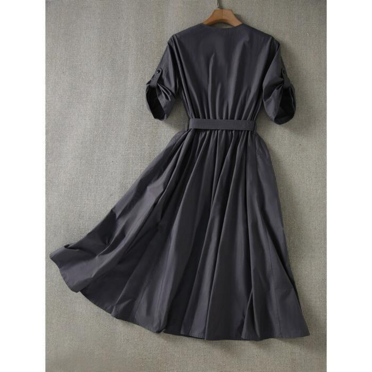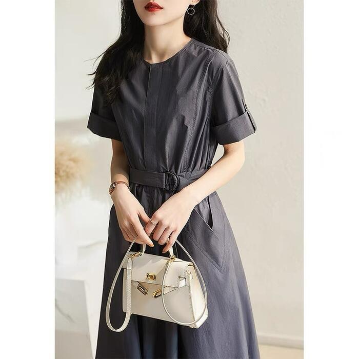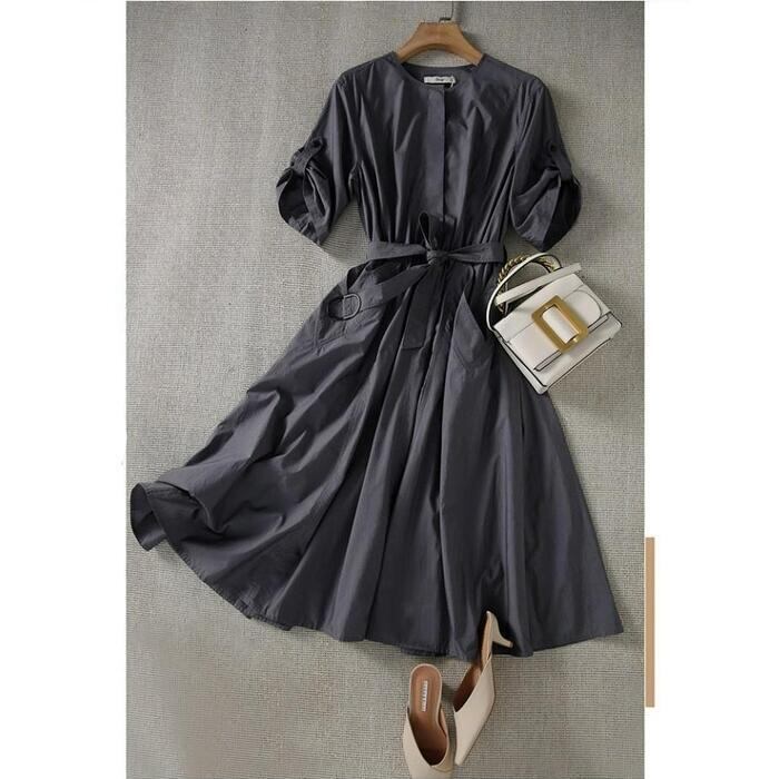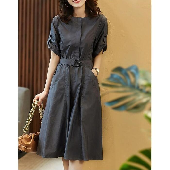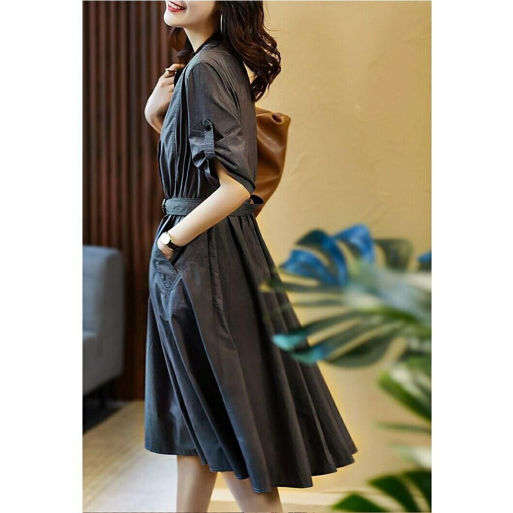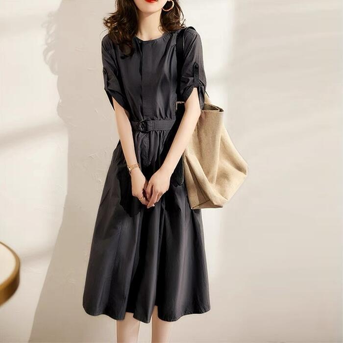 大きいサイズ 体型カバー ワンピース ドレス シャツワンピ 袖あり プルオーバー レディース エレガント きれいめ カジュアル ミモレ丈 大人 可愛い 半袖 ウエストベルト シンプル フェミニン おしゃれ 通勤 オフィス グレー 春 夏 秋 20代 30代 40代 50代