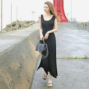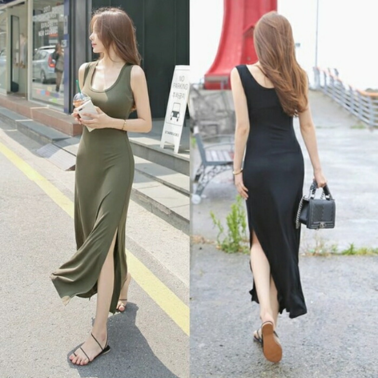 全2色 大きいサイズ 体型カバー ワンピース ドレス タンクワンピ レディース エレガント きれいめ カジュアル ノースリーブ ロング丈 ロングスカート 大人 可愛い タイト フェミニン おしゃれ シンプル スレンダー スリット 無地 グリーン 緑 ブラック 黒 春 夏 秋 20代 30代 40代 50代