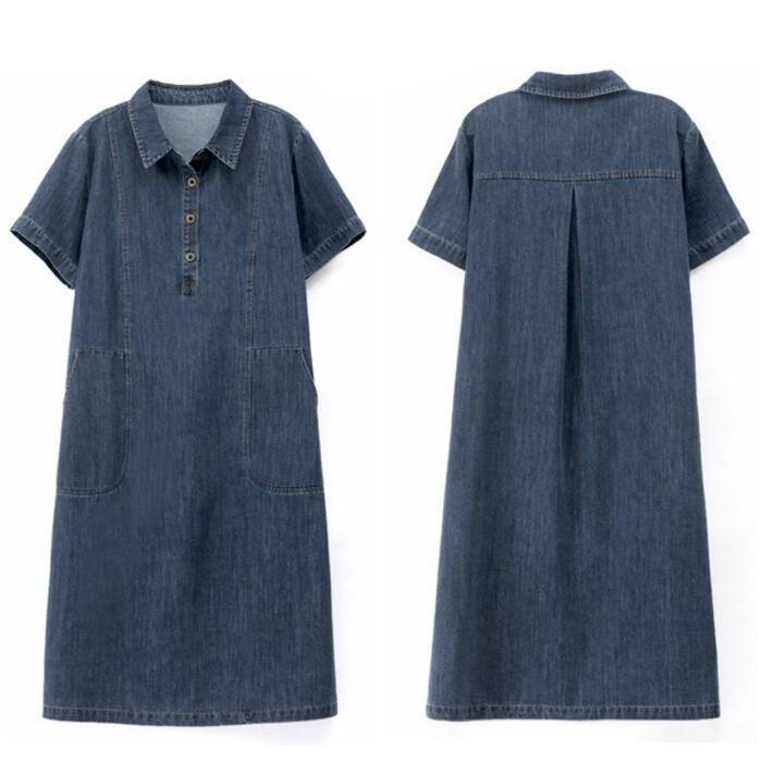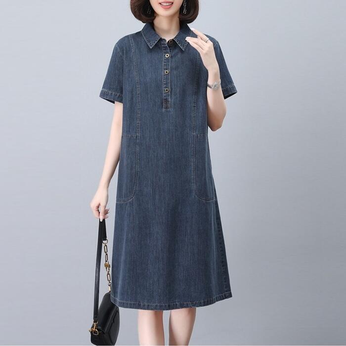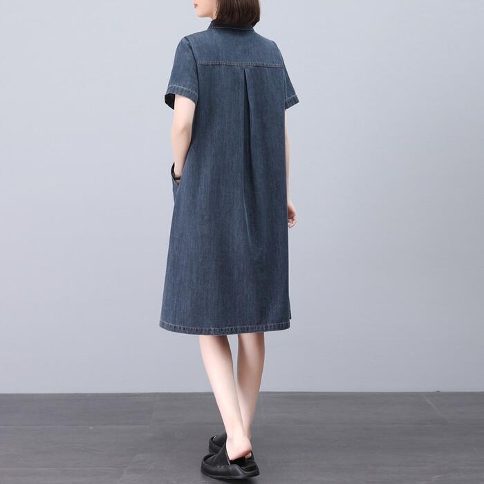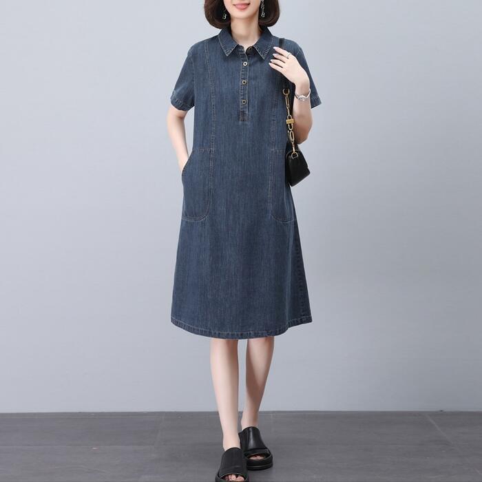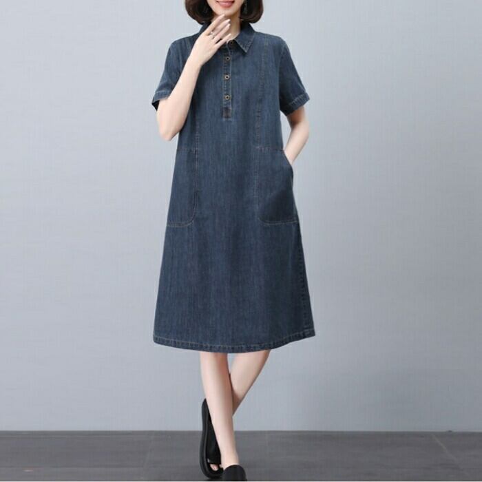 大きいサイズ 体型カバー ナチュラル ワンピース ドレス デニム ワンピ プルオーバー レディース エレガント きれいめ カジュアル 半袖 ひざ丈 ミディ丈 大人 可愛い ゆったり フェミニン おしゃれ シンプル 襟付き 楽ちん リラックス ブルー 青 春 夏 秋 20代 30代 40代 50代
