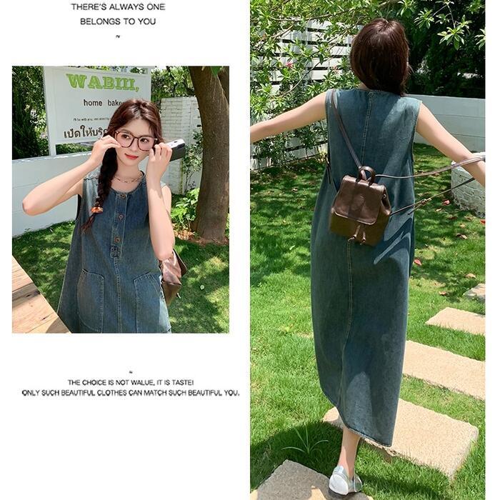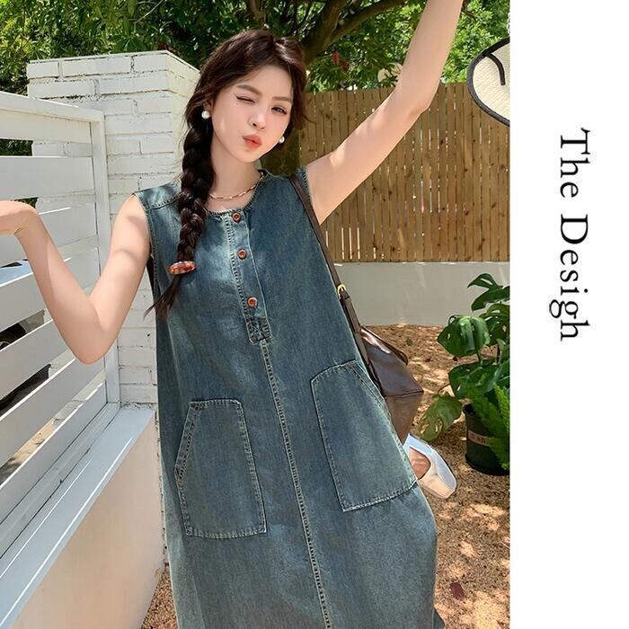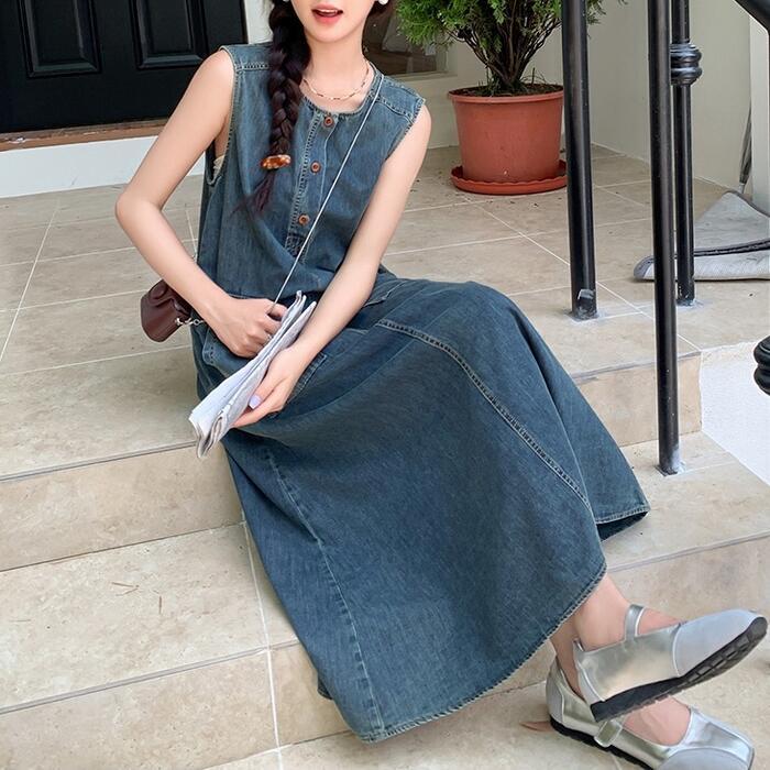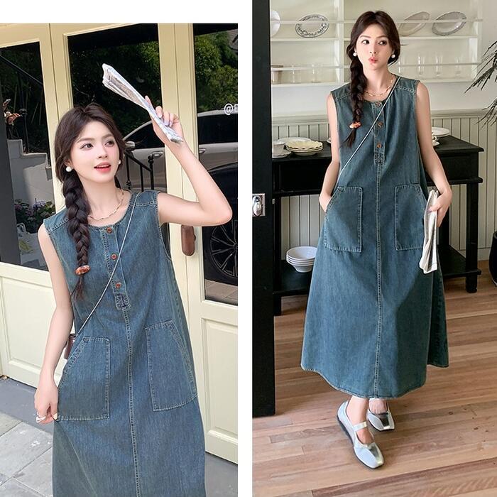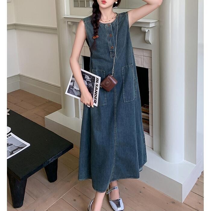 大きいサイズ 体型カバー ナチュラル ワンピース ドレス デニム ワンピ プルオーバー レディース エレガント きれいめ カジュアル ノースリーブ ロング丈 ロングワンピ 大人 可愛い ゆったり フェミニン おしゃれ シンプル Aライン 楽ちん リラックス ブルー 青 春 夏 秋 20代 30代 40代 50代