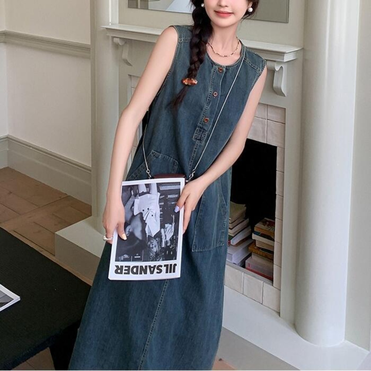 大人かわいいノースリーブデニムワンピース。