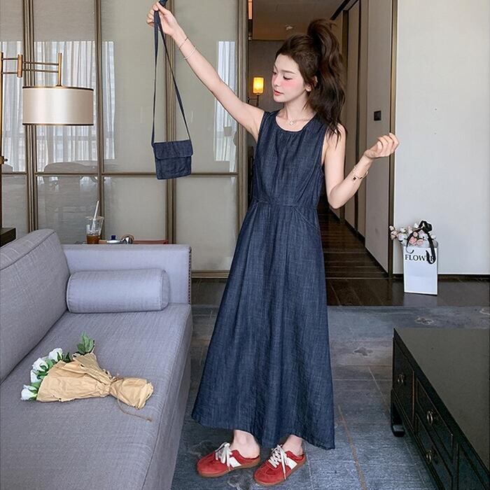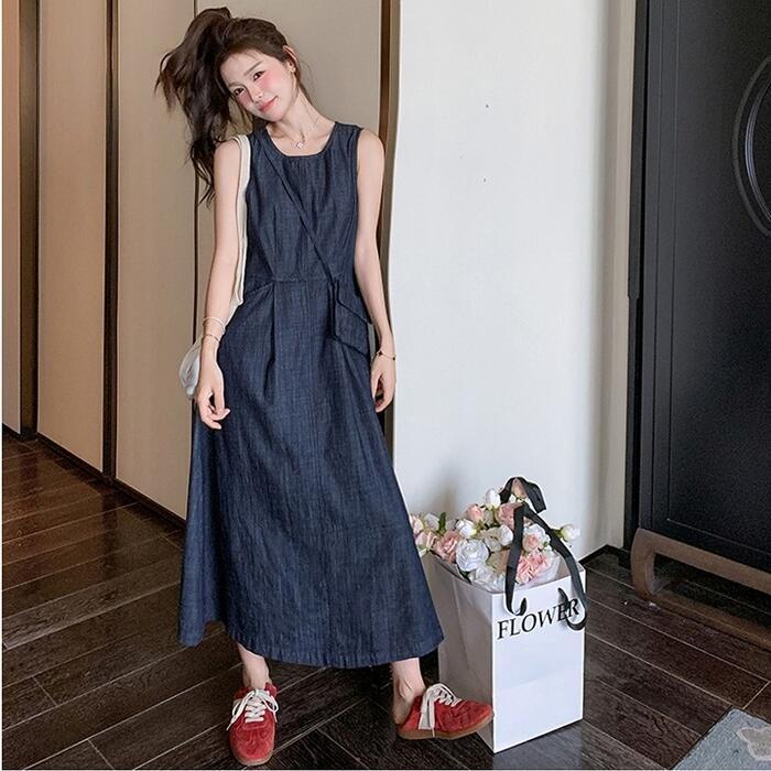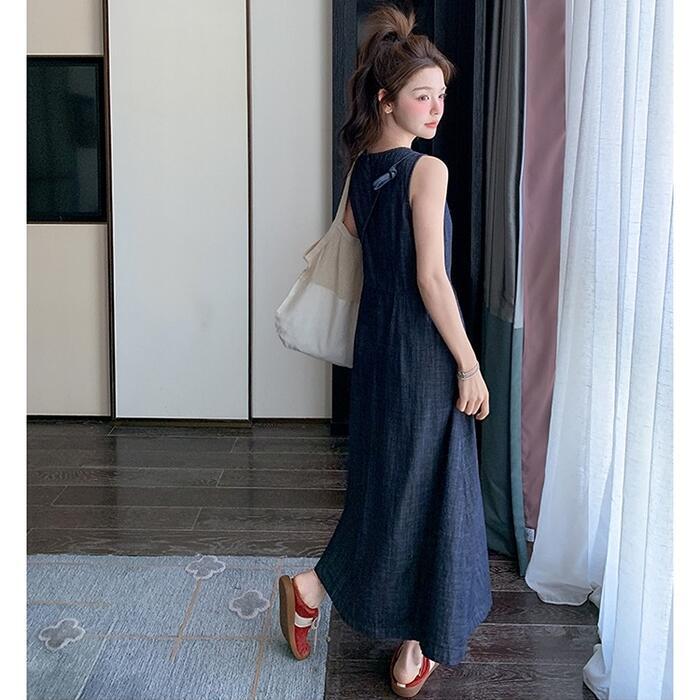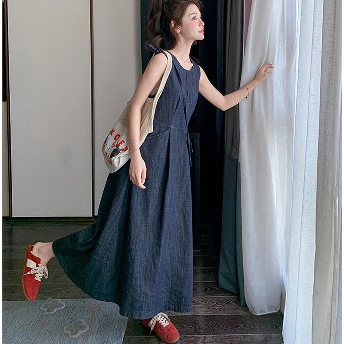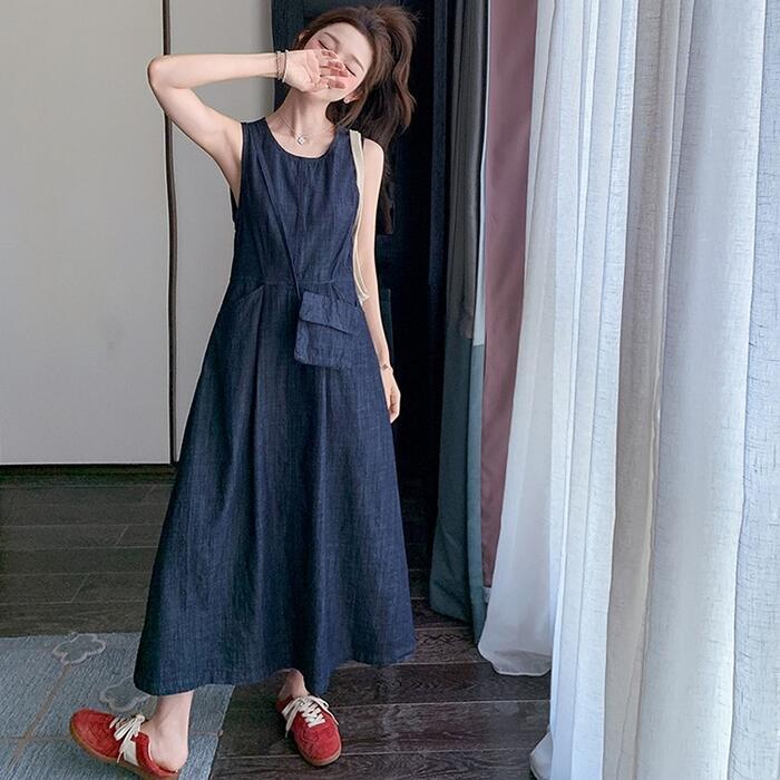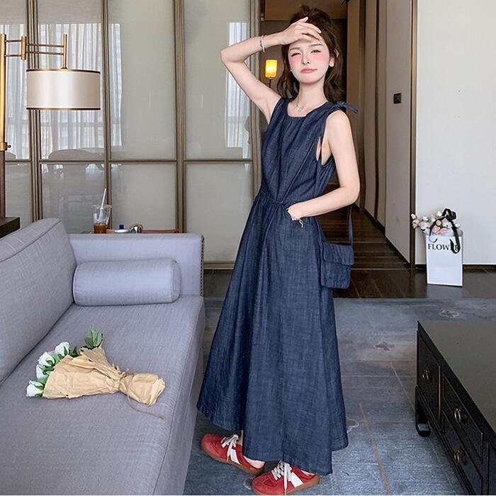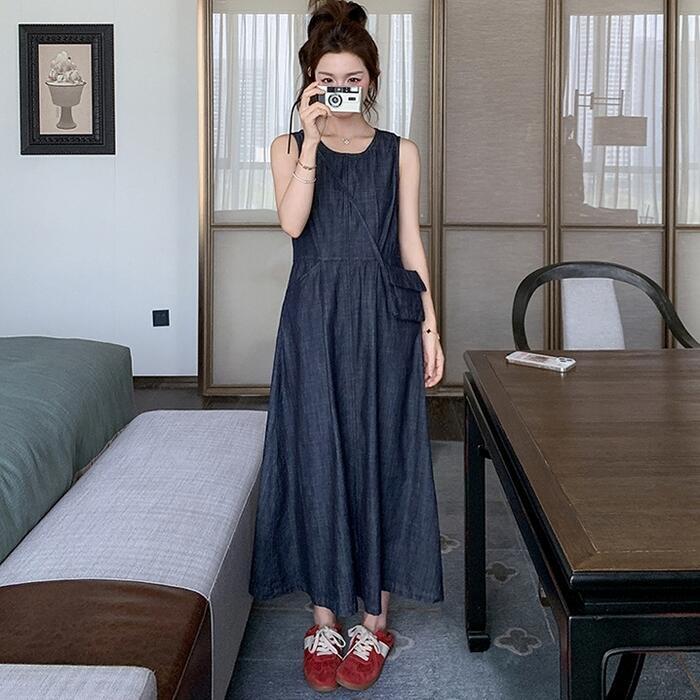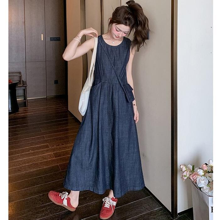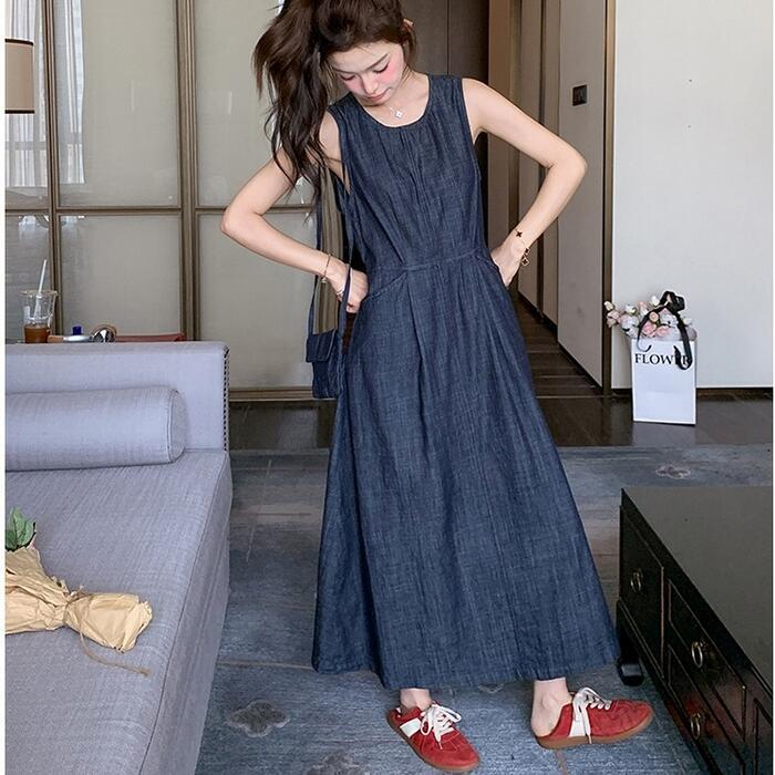 大きいサイズ 体型カバー ナチュラル ワンピース ドレス デニム ワンピ レディース エレガント きれいめ カジュアル ノースリーブ ロング丈 大人 可愛い フェミニン おしゃれ シンプル Aライン ハイウエスト ゆったり リラックス 楽ちん ブルー 青 春 夏 秋 20代 30代 40代 50代