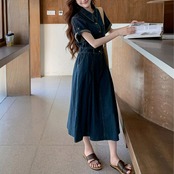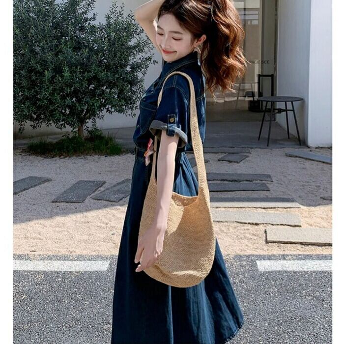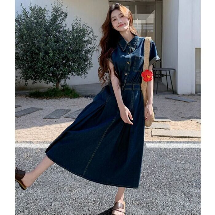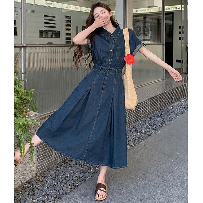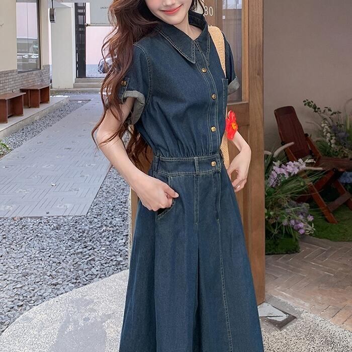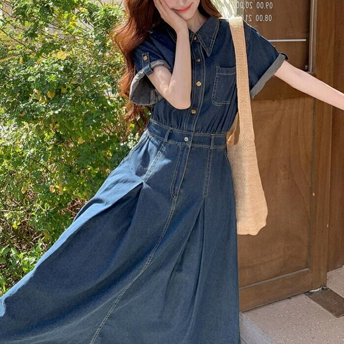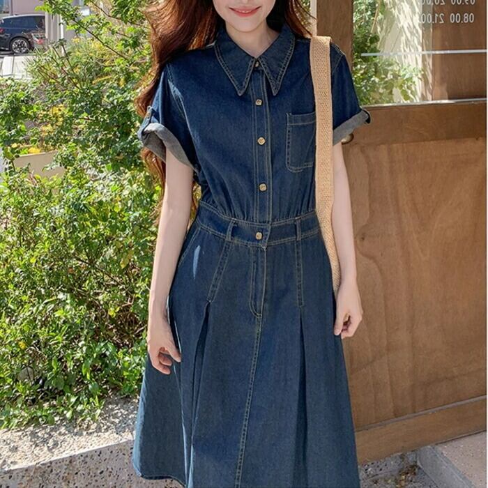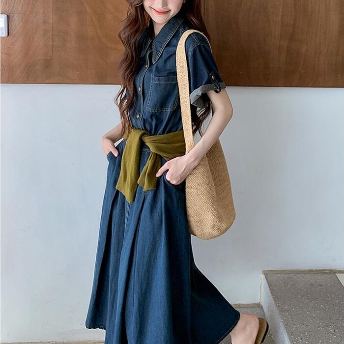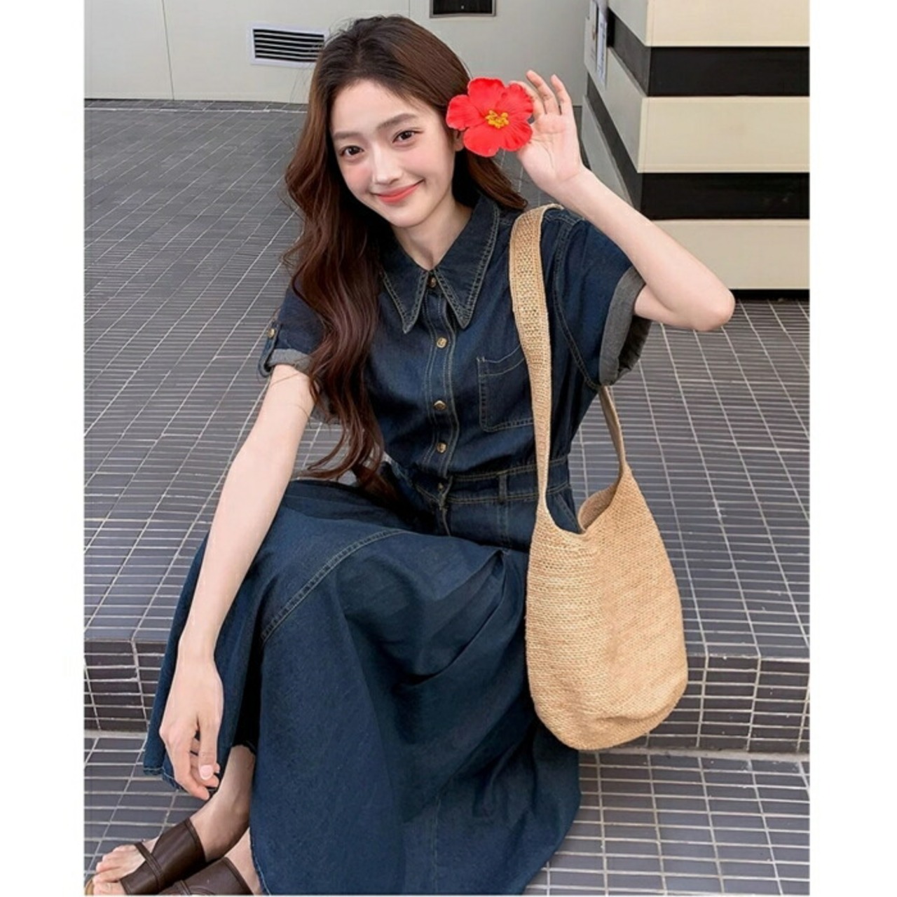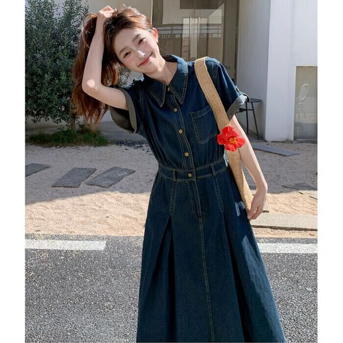 大きいサイズ 体型カバー ナチュラル ワンピース ドレス デニム ワンピ レディース エレガント きれいめ カジュアル シャツワンピ ロング丈 半袖 大人 可愛い フェミニン おしゃれ シンプル Aライン ハイウエスト 楽ちん ブルー 青 春 夏 秋 20代 30代 40代 50代