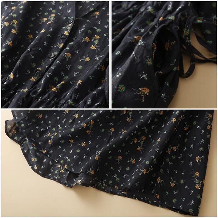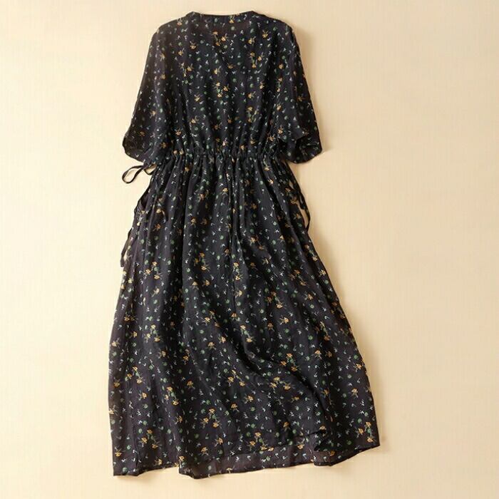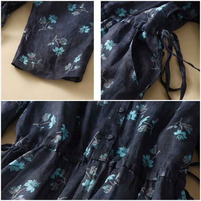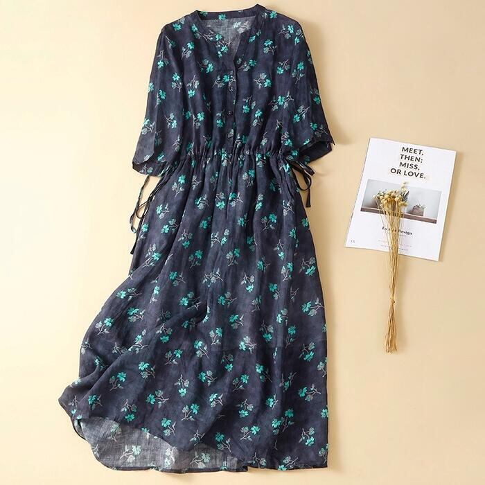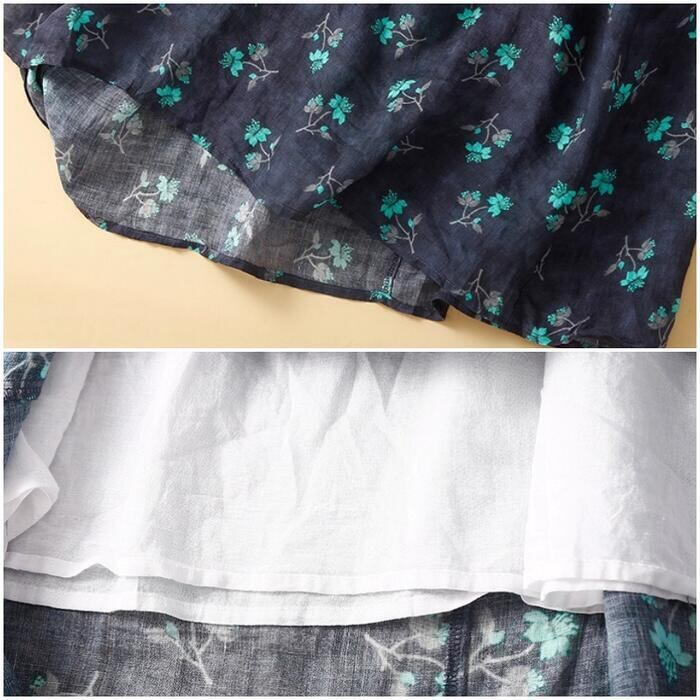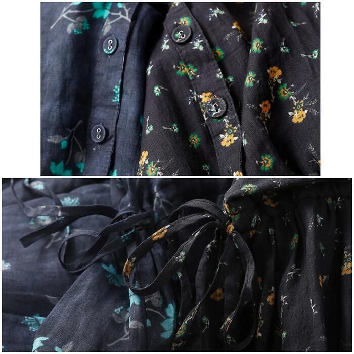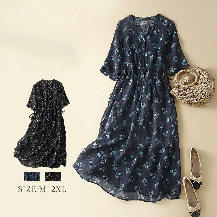 全2色 大きいサイズ 体型カバー ナチュラル フェミニン ワンピース ドレス 花柄 フラワー 小花 ワンピ 綿麻 コットン リネン レディース エレガント きれいめ カジュアル シャツワンピ ミモレ丈 ドロスト 半袖 大人 可愛い おしゃれ Aライン ゆったり 楽ちん ブルー 青 春 夏 秋 20代 30代 40代 50代