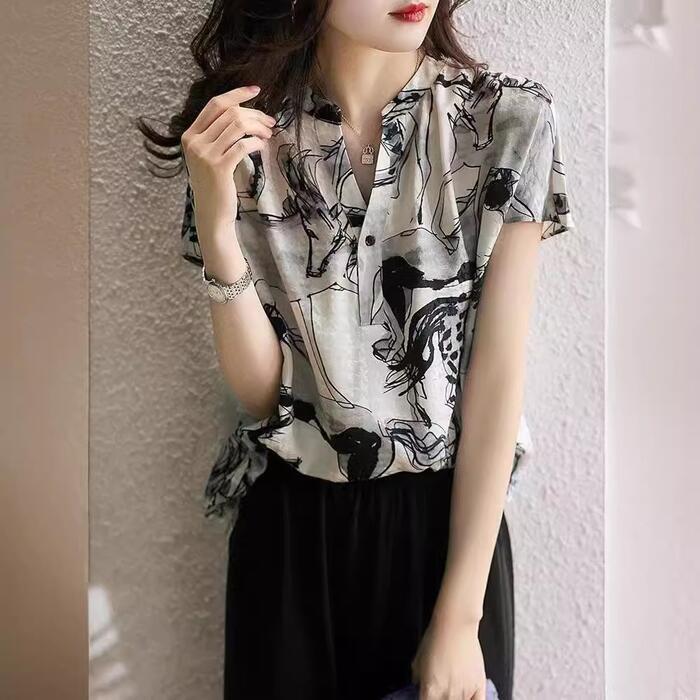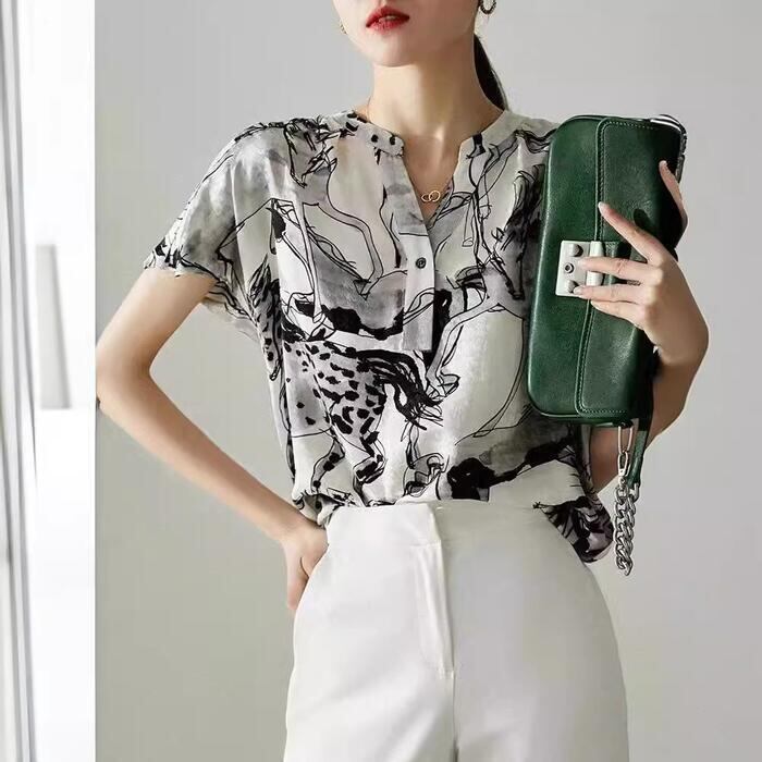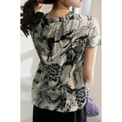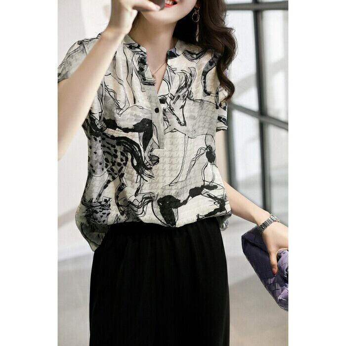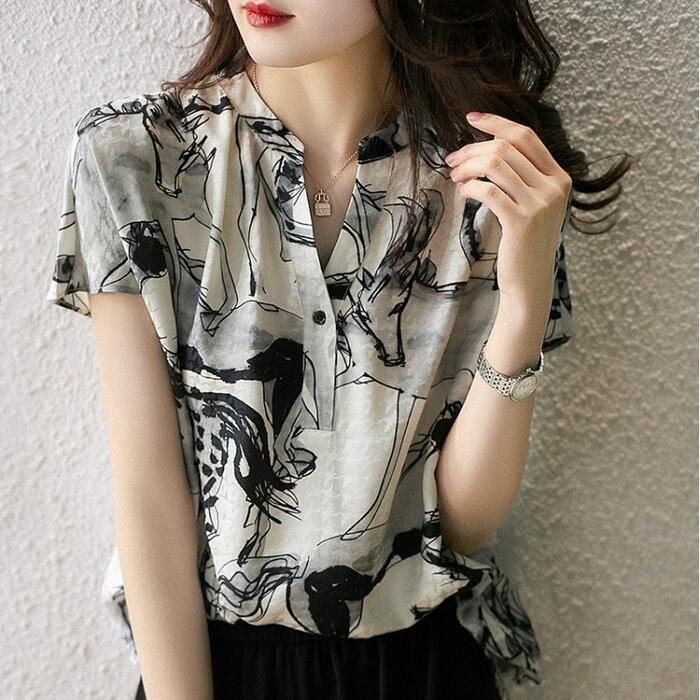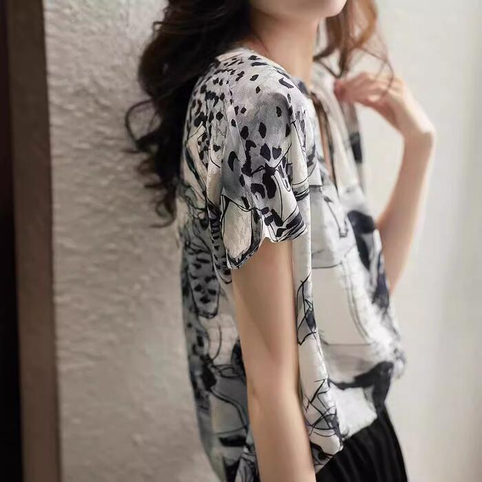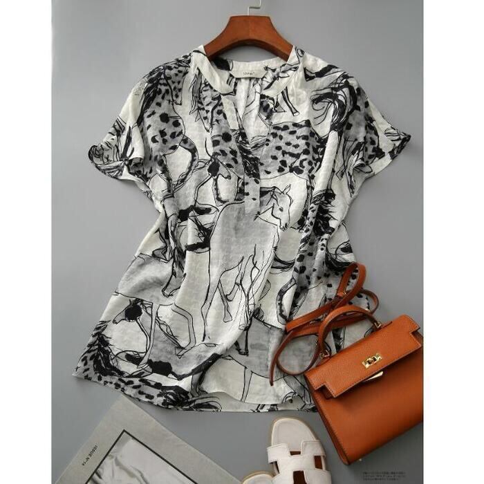 体型カバー トップス シャツ ブラウス プリント アニマル エレガント レディース 大人 可愛い きれいめ カジュアル フェミニン Vネック 半袖 ナチュラル シンプル おしゃれ 大きいサイズ ブラック 黒 春 秋 夏 20代 30代 40代 50代