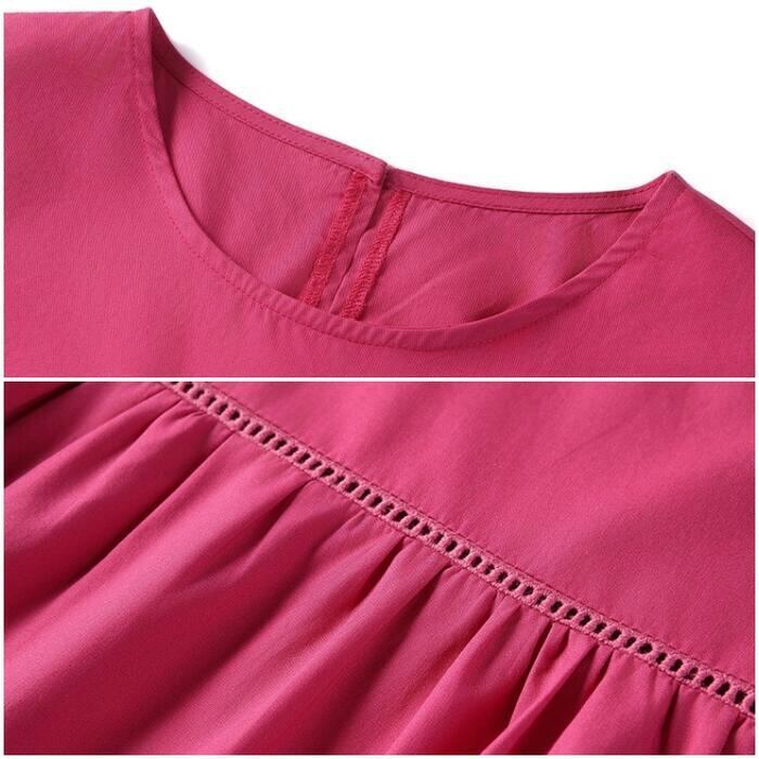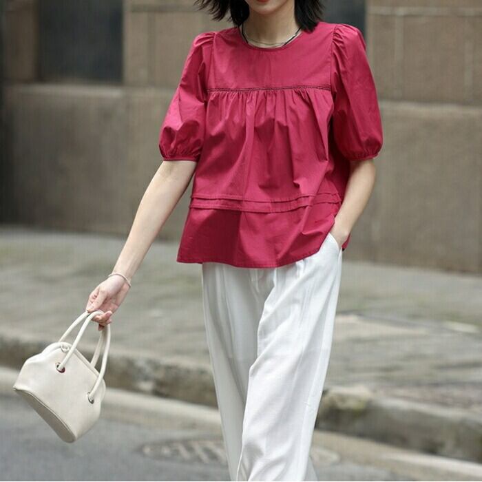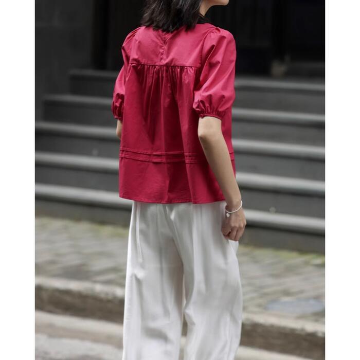 大きいサイズ 体型カバー トップス シャツ ブラウス パフスリーブ ギャザー エレガント レディース 大人 可愛い 半袖 五分袖 きれいめ カジュアル フェミニン プルオーバー シンプル 通勤 オフィス おしゃれ レッド 赤 春 秋 夏 20代 30代 40代 50代