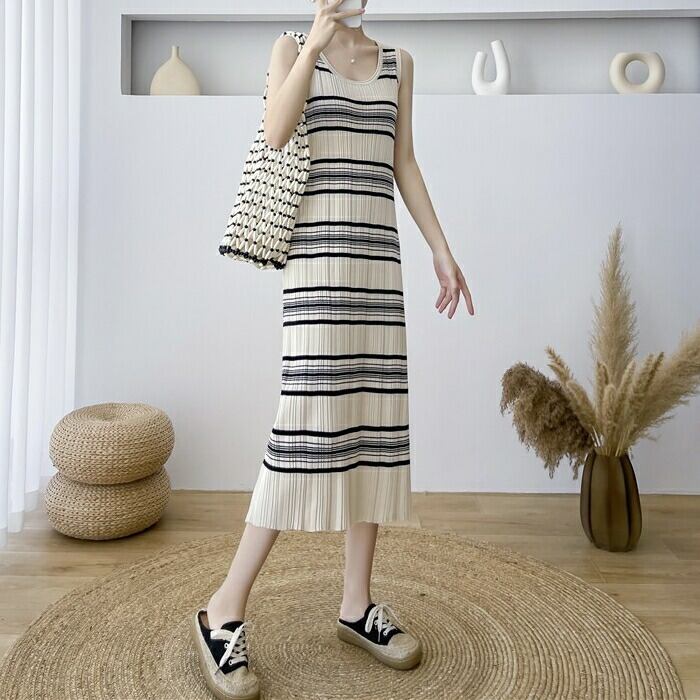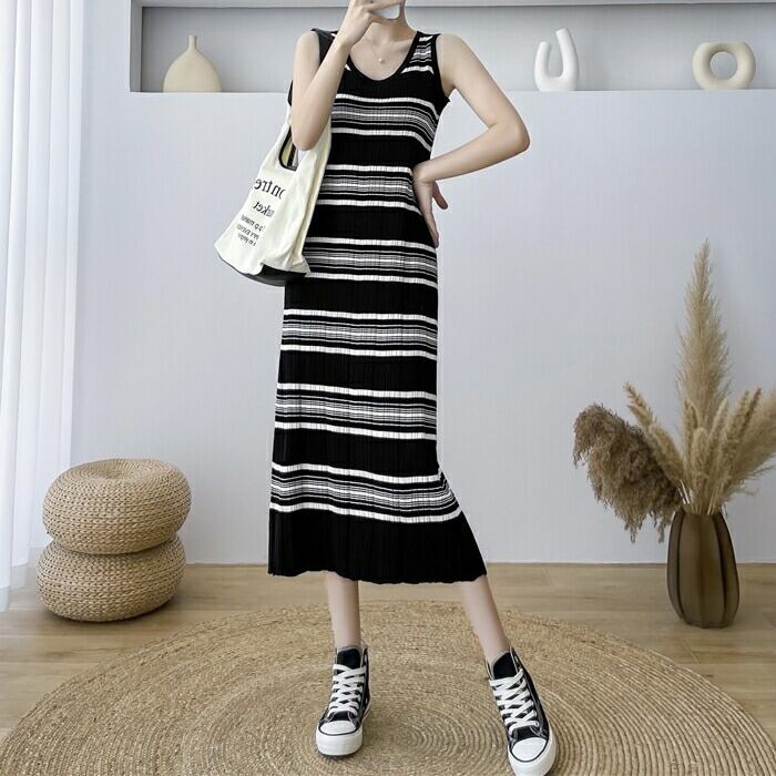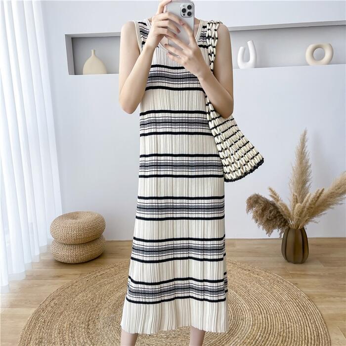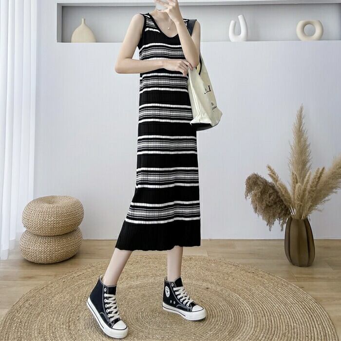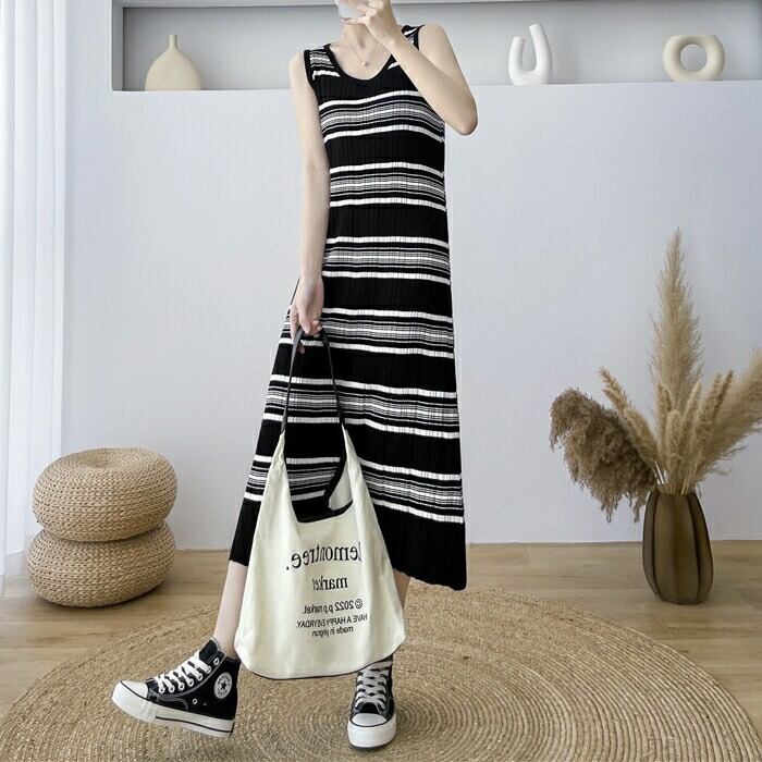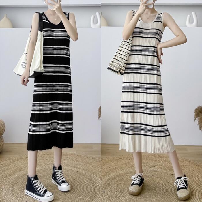 全2色 大きいサイズ ナチュラル フェミニン ワンピース ドレス ニット ボーダー ワンピ プルオーバー レディース エレガント きれいめ カジュアル ノースリーブ ミモレ丈 ロングワンピ 大人 可愛い おしゃれ シンプル 楽ちん リラックス ベージュ ブラック 黒 春 夏 秋 20代 30代 40代 50代