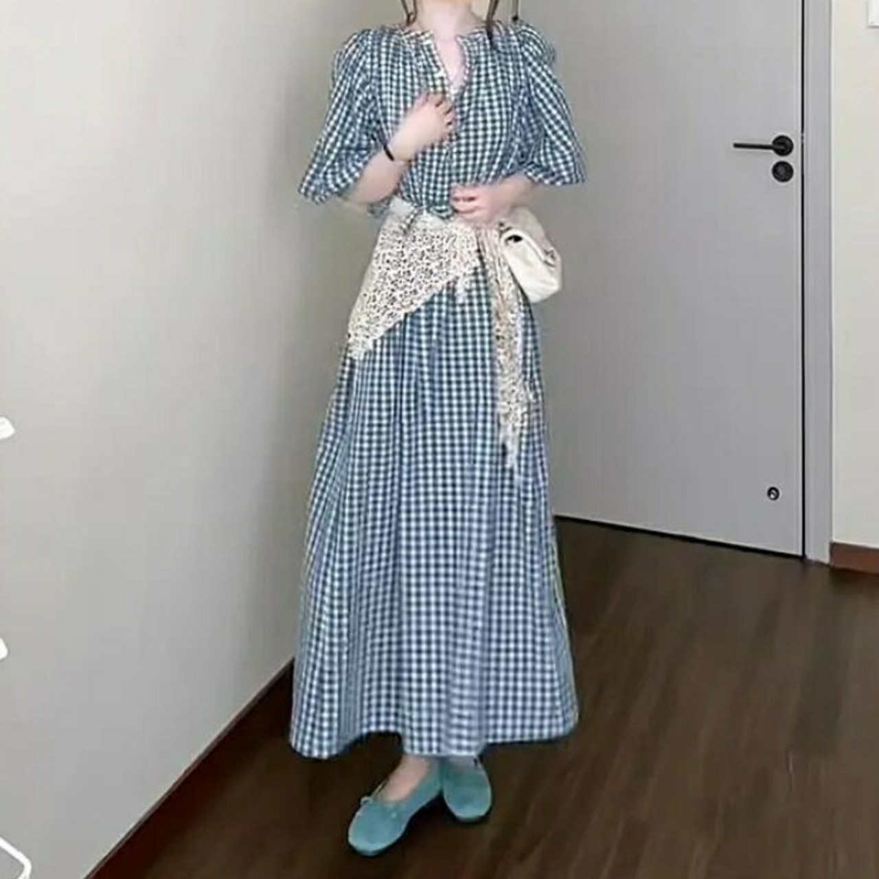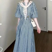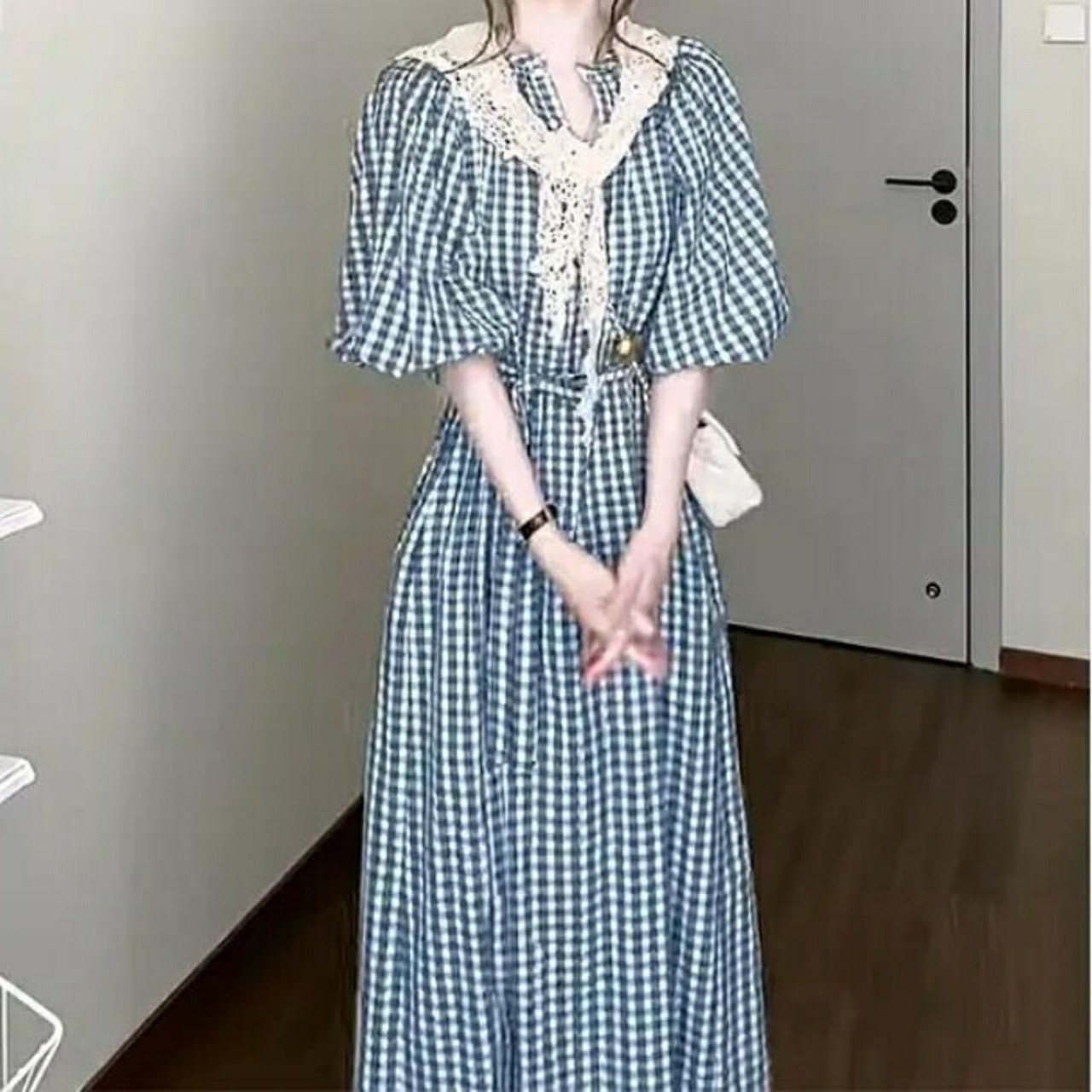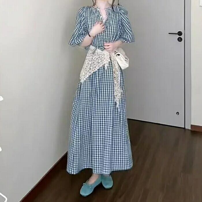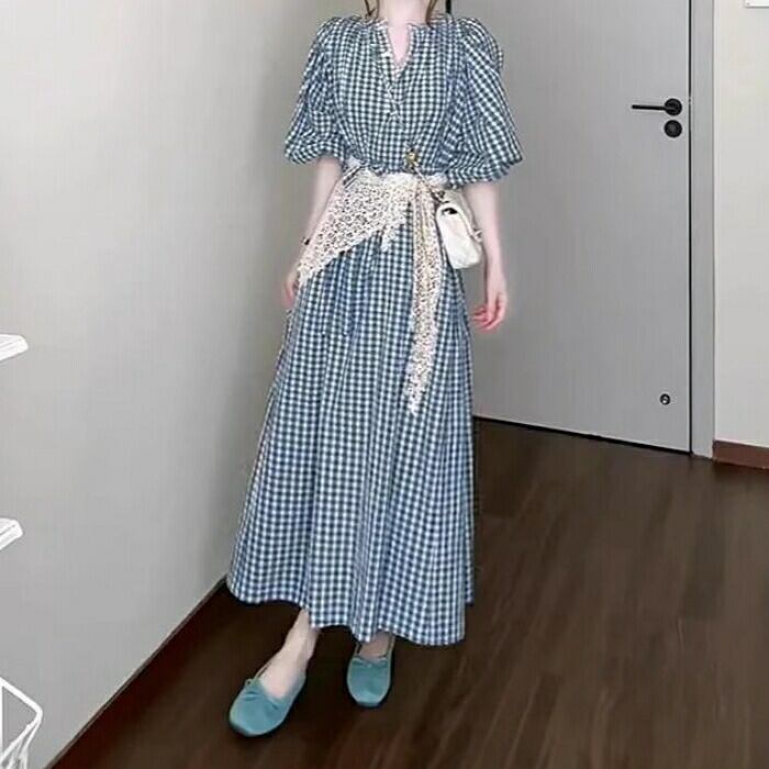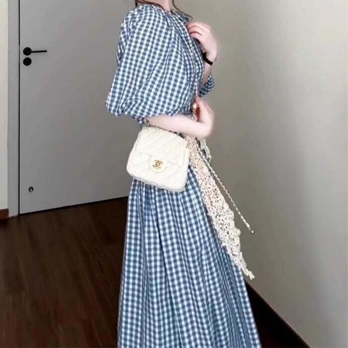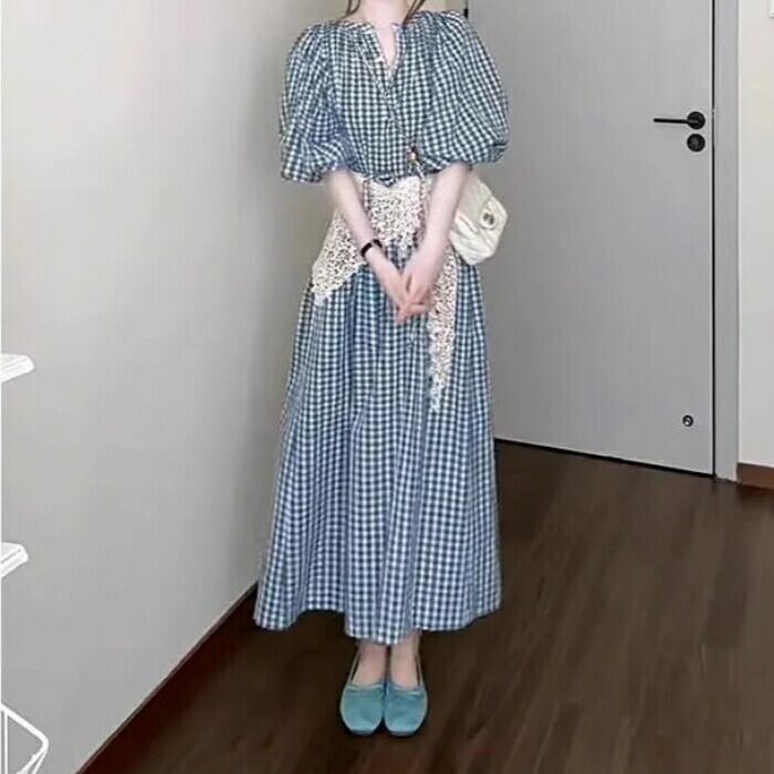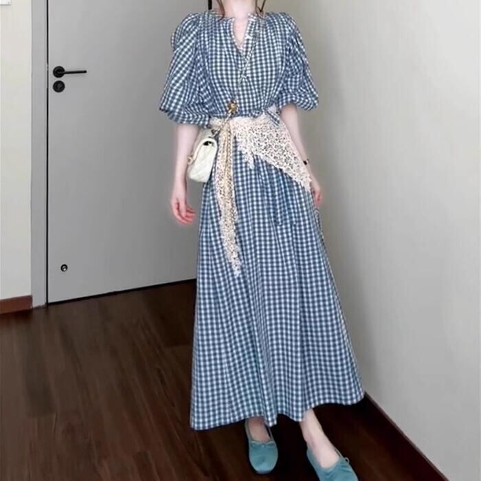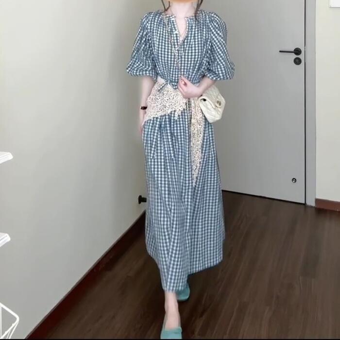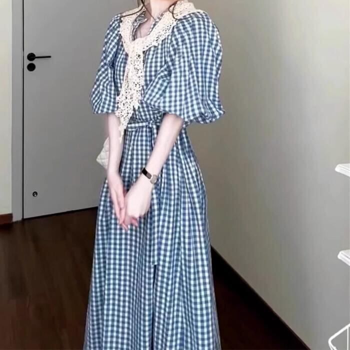 大きいサイズ ワンピース ドレス ランタンスリーブ ギンガムチェック ワンピ シャツワンピ レディース エレガント きれいめ カジュアル 五分袖 ミモレ丈 ロングワンピ 大人 可愛い おしゃれ フェミニン ナチュラル ブルー 青 春 夏 秋 20代 30代 40代 50代