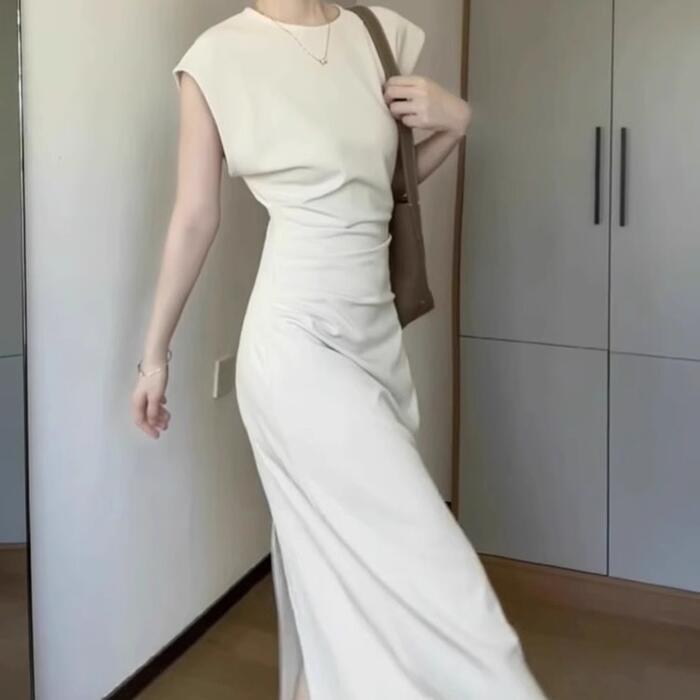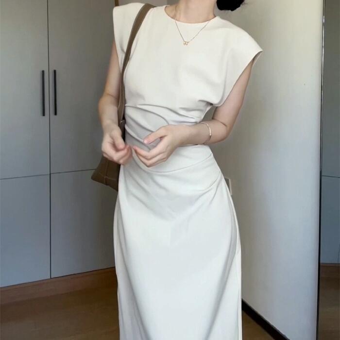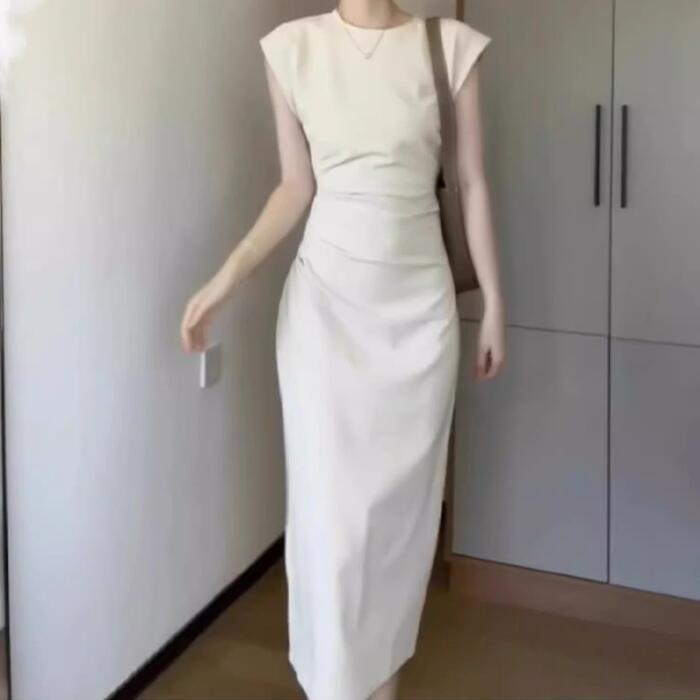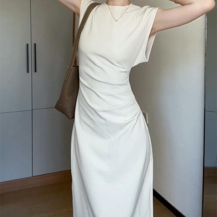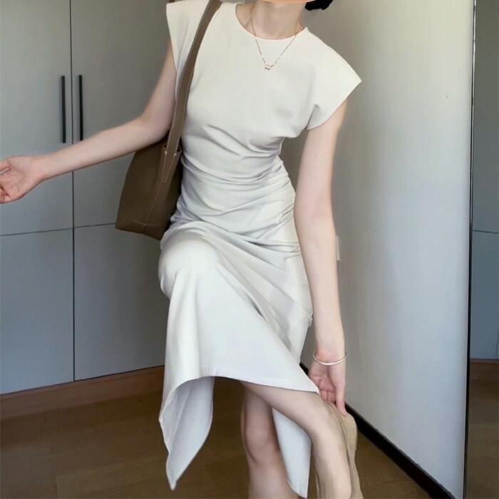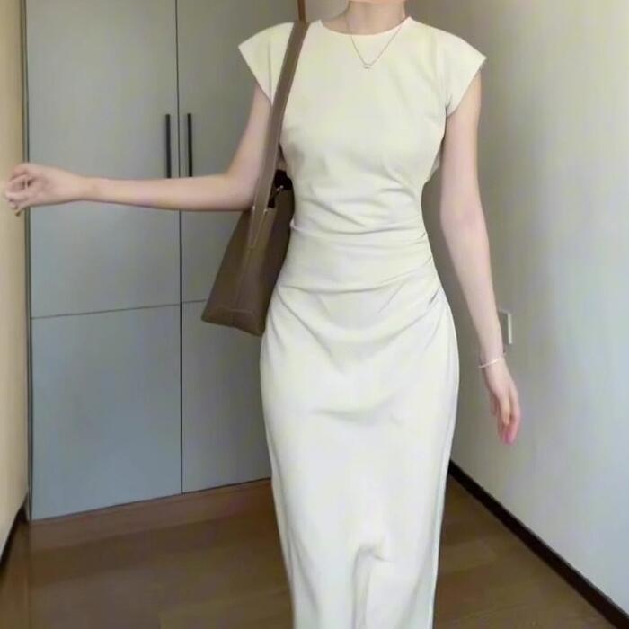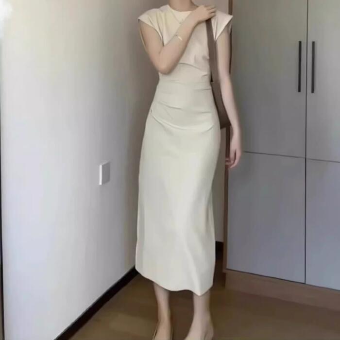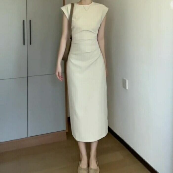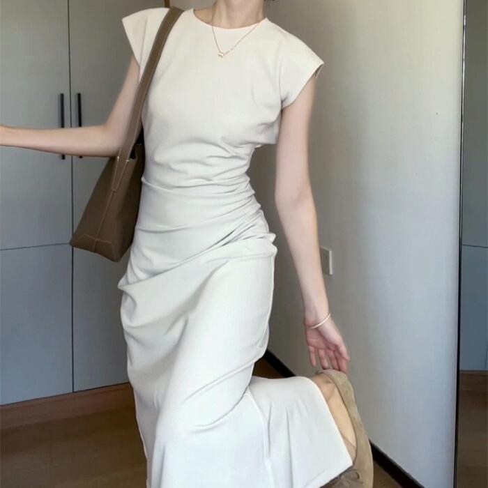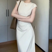 大きいサイズ 体型カバー スレンダー ワンピース ドレス フレンチスリーブ レディース エレガント きれいめ カジュアル 半袖 ミモレ丈 タイト 大人 可愛い おしゃれ フェミニン ナチュラル オケージョン パーティー お呼ばれ シンプル ホワイト 白 春 夏 秋 20代 30代 40代 50代