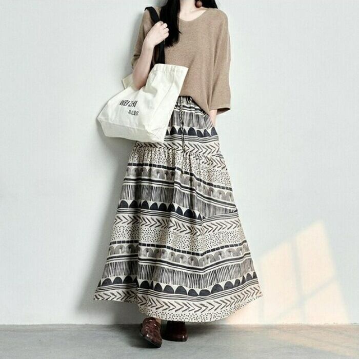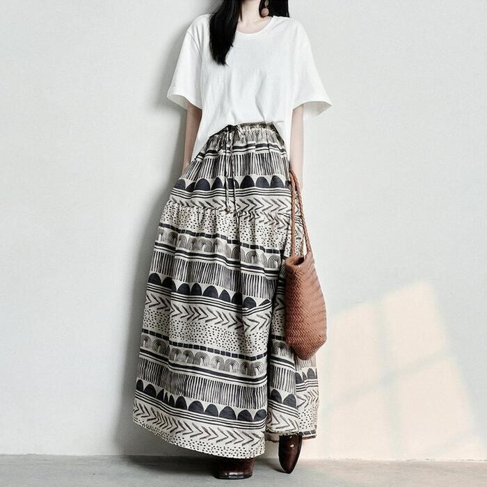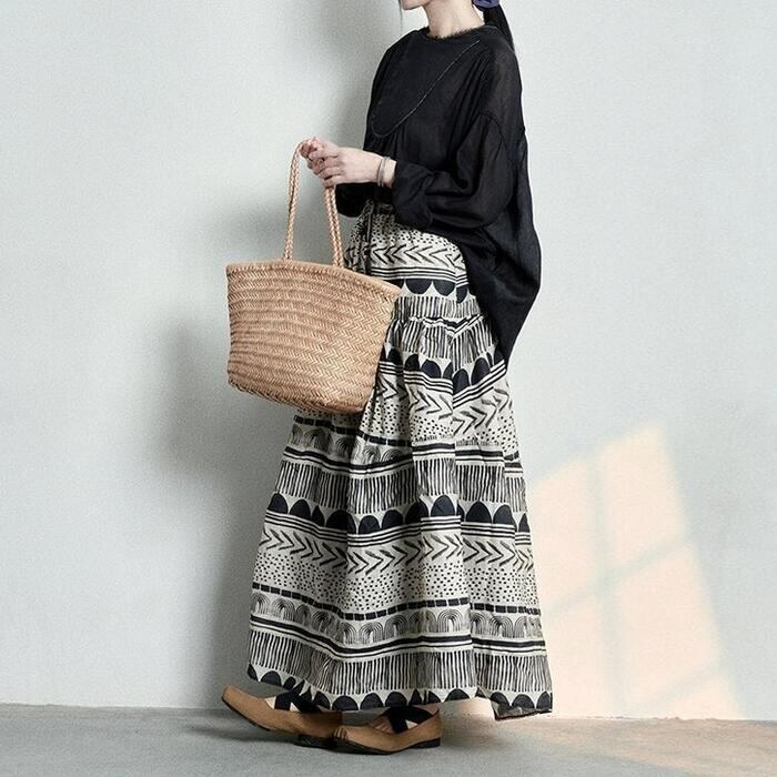 フレアシルエットと存在感あるプリントが、スタイリングを引き立ててくれます。