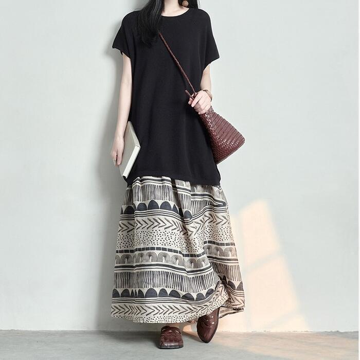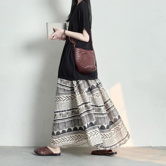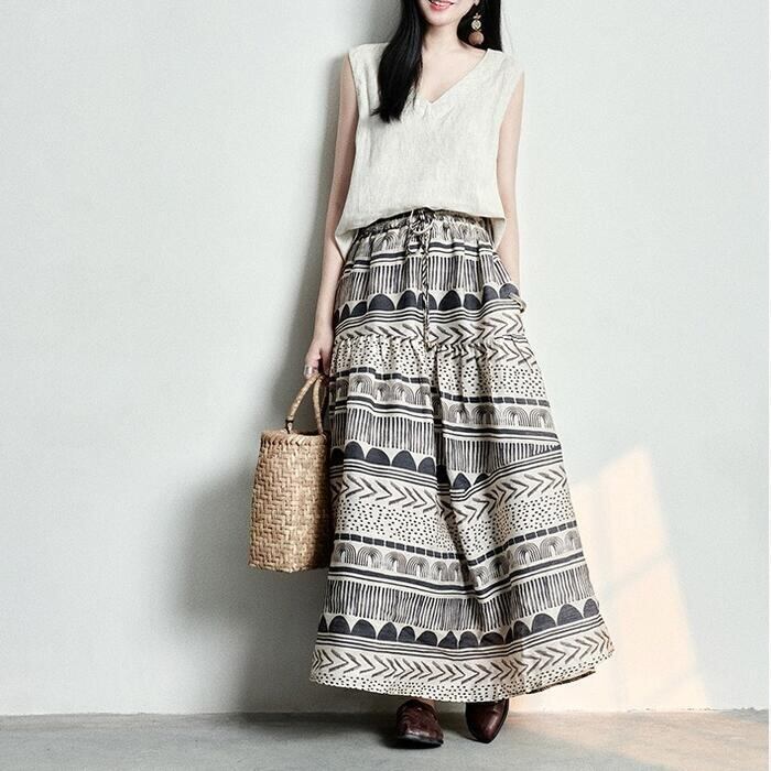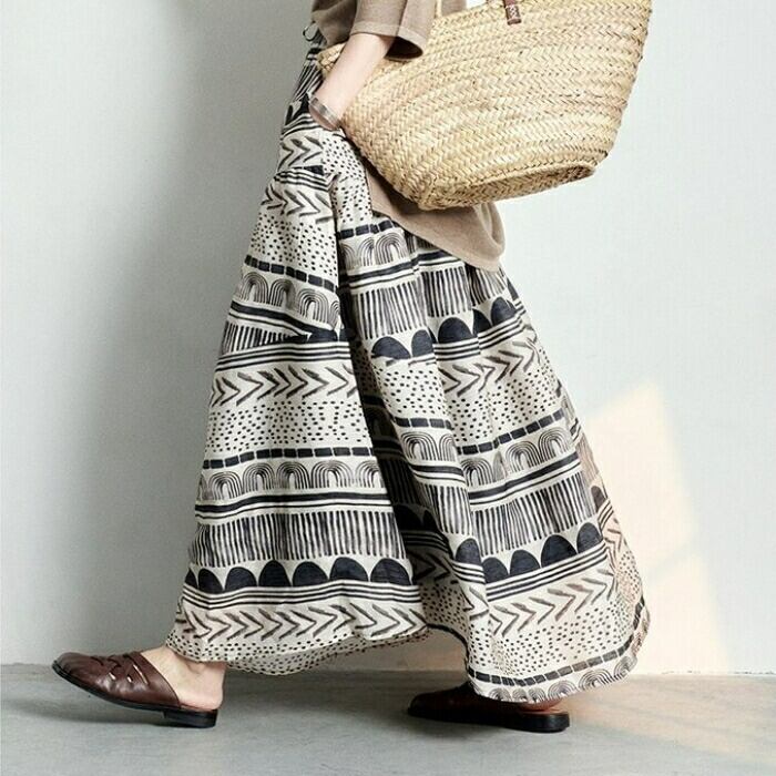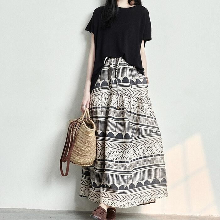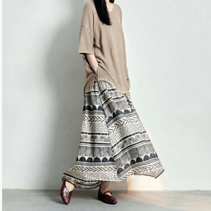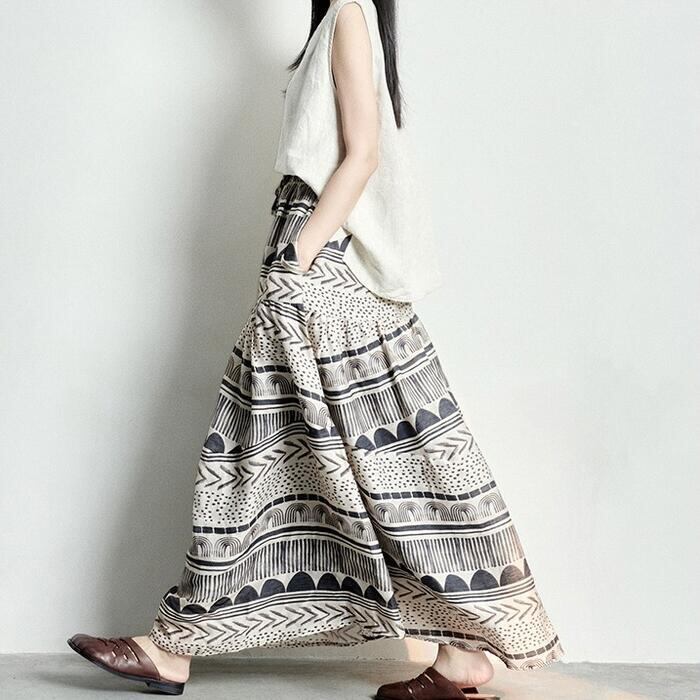 大きいサイズ 体型カバー ボトムス スカート 綿麻 コットン リネン プリント レディース エレガント きれいめ カジュアル ロング丈 大人 可愛い フェミニン おしゃれ フレアスカート ウエストゴム 楽ちん エスニック ナチュラル ベージュ 春 秋 夏 20代 30代 40代 50代