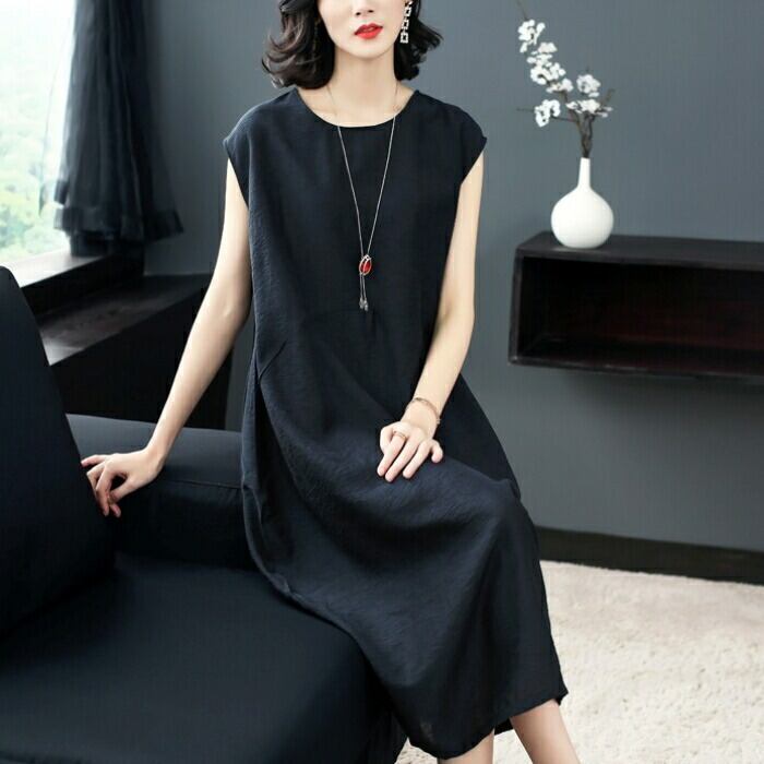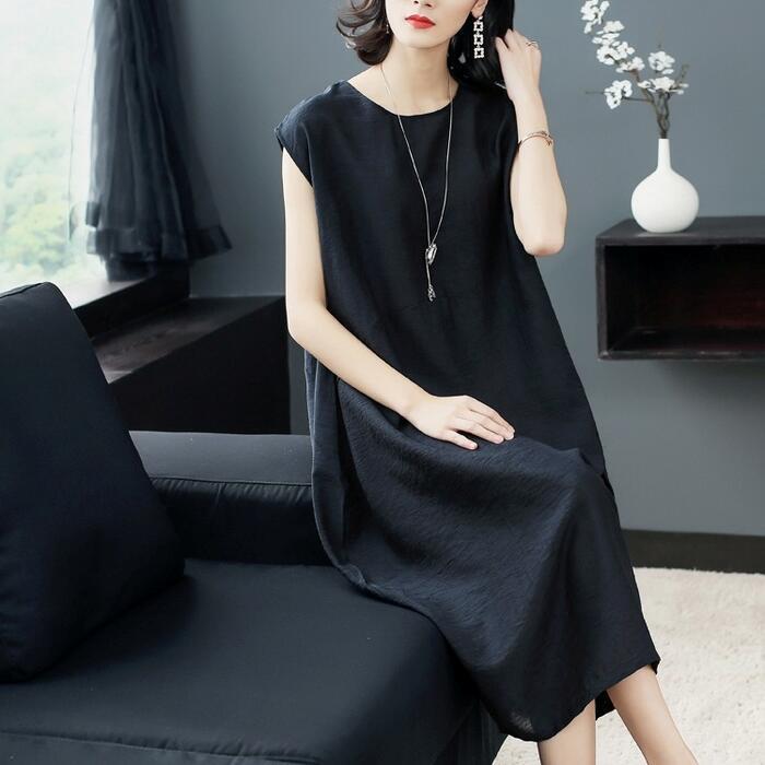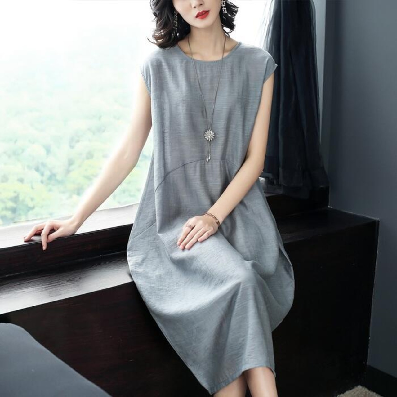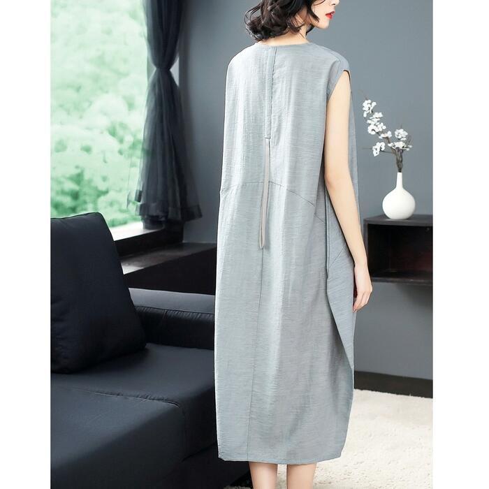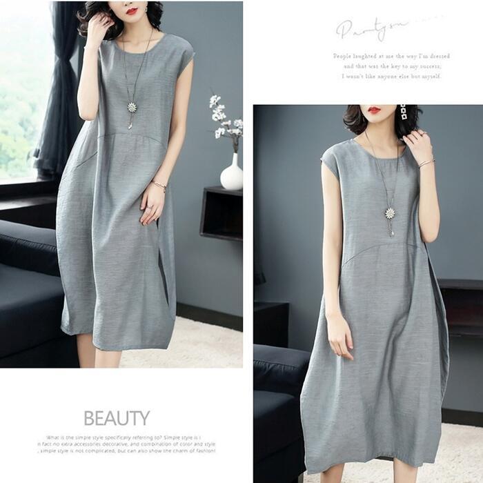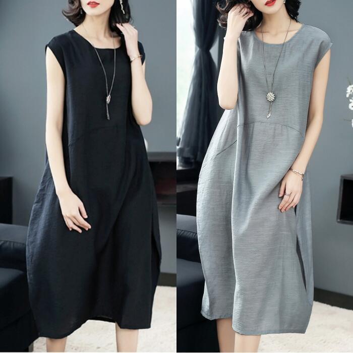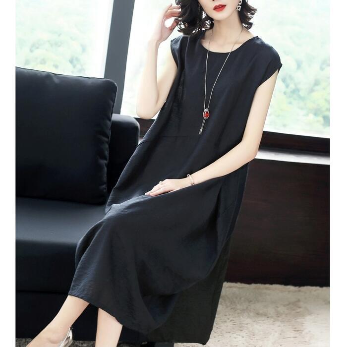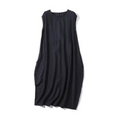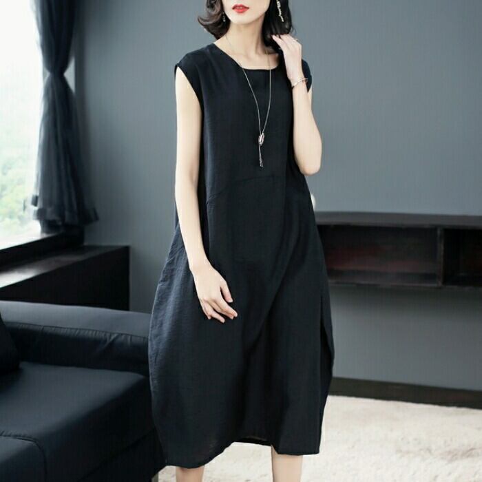 全2色 大きいサイズ 体型カバー ワンピース ドレス リネン プルオーバー バルーン レディース エレガント きれいめ カジュアル ノースリーブ ミディ丈 ひざ丈 大人 可愛い フェミニン ナチュラル 上品 シンプル おしゃれ ネイビー グレー 春 夏 秋 20代 30代 40代 50代