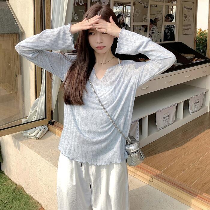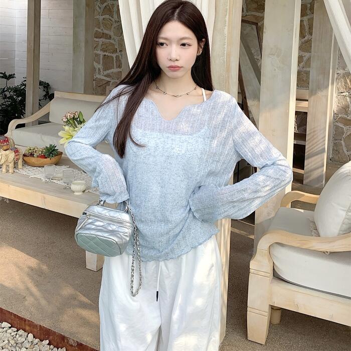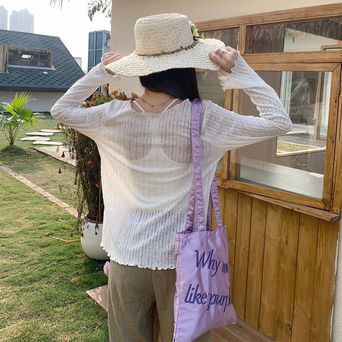 全2色 大きいサイズ 体型カバー トップス ニット カットソー プルオーバー Tシャツ エレガント レディース 大人 可愛い 長袖 きれいめ カジュアル フェミニン リブ 透け感 おしゃれ シンプル 薄手 インナー ブルー 青 ホワイト 白 春 秋 夏 20代 30代 40代 50代