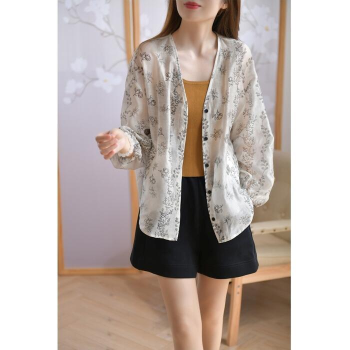 ノスタルジックなフラワープリントが可愛いVネックシャツ。