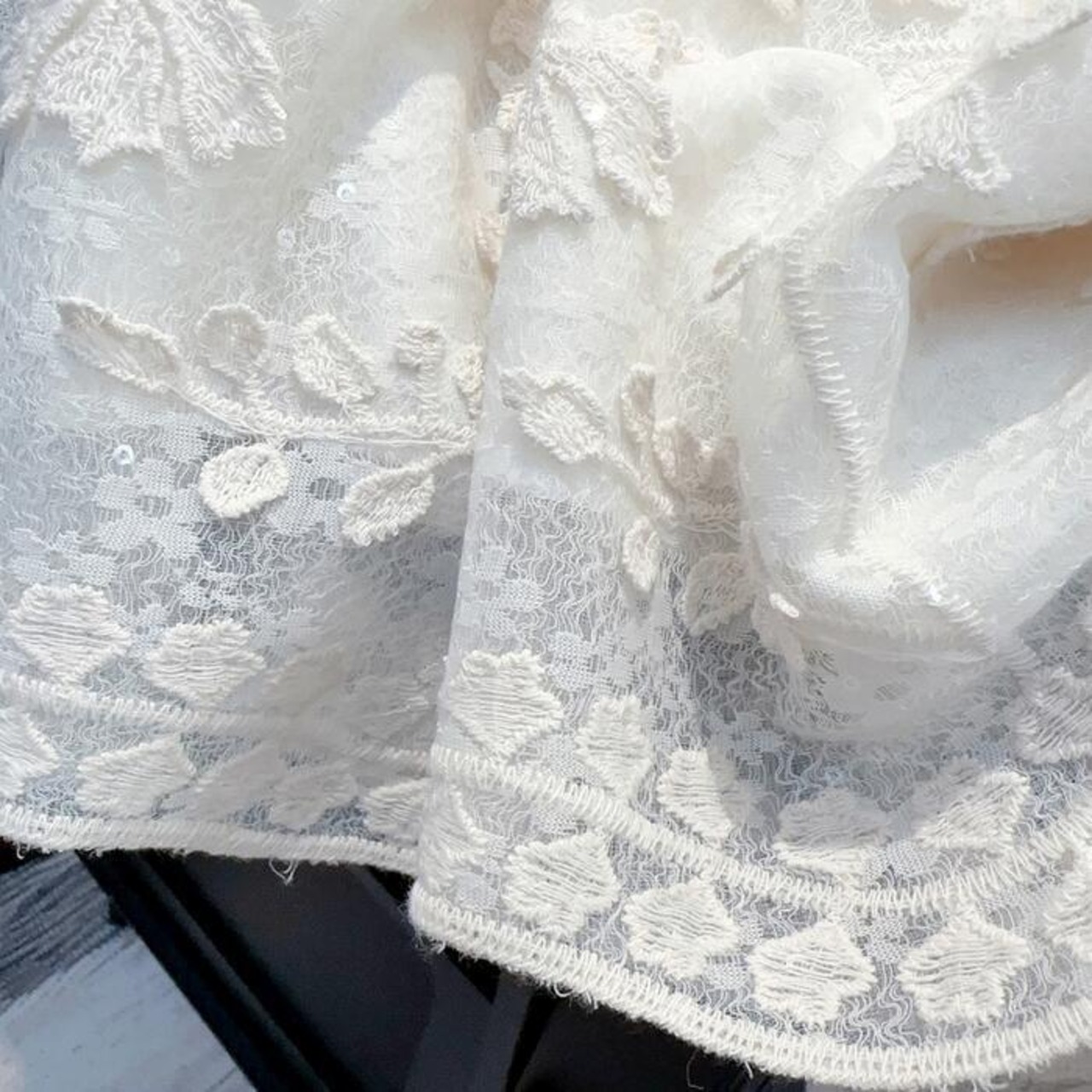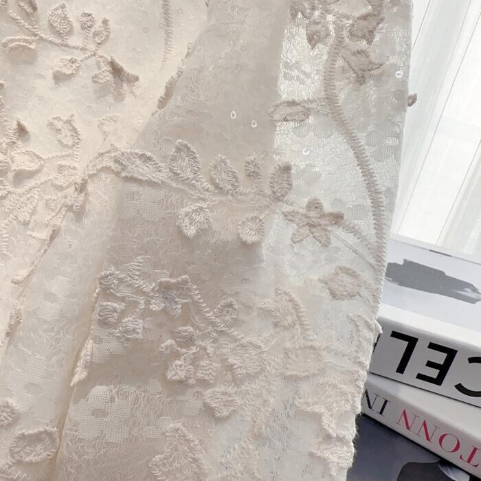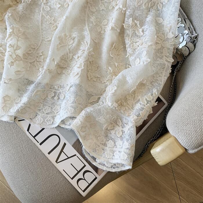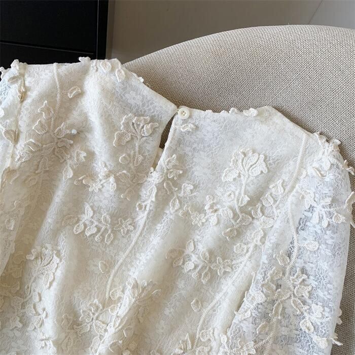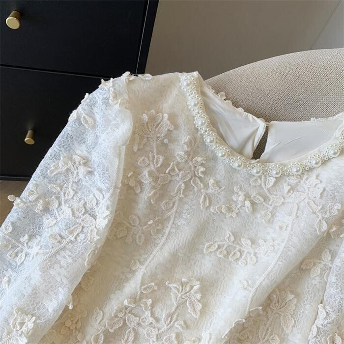 ジャガードレースが女性らしい印象のブラウス。