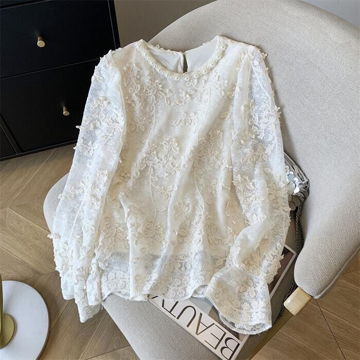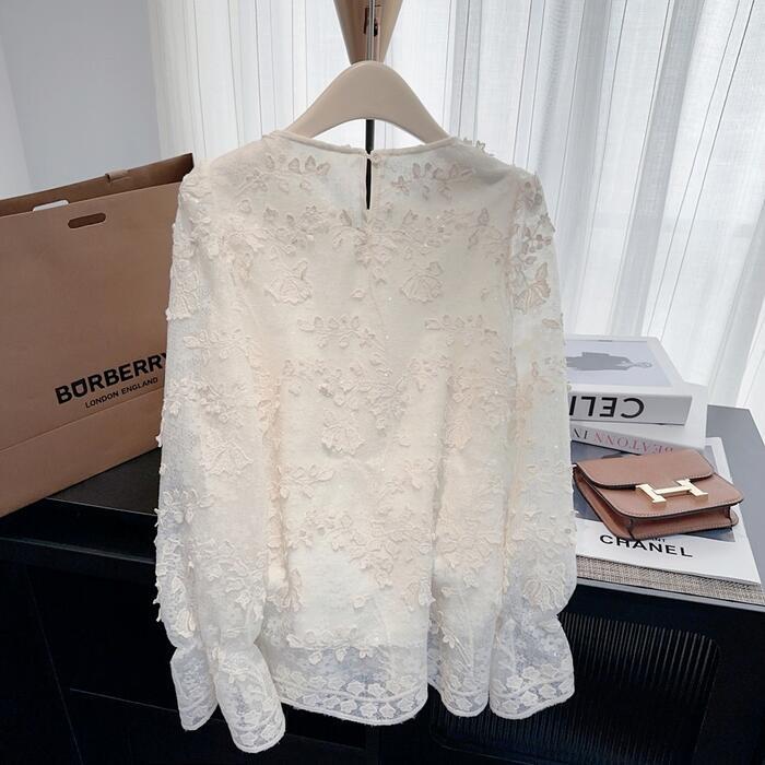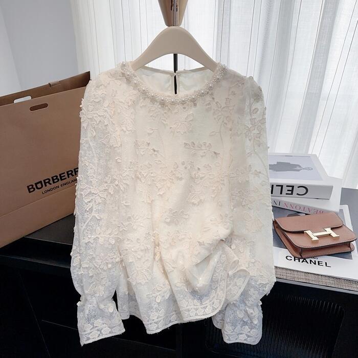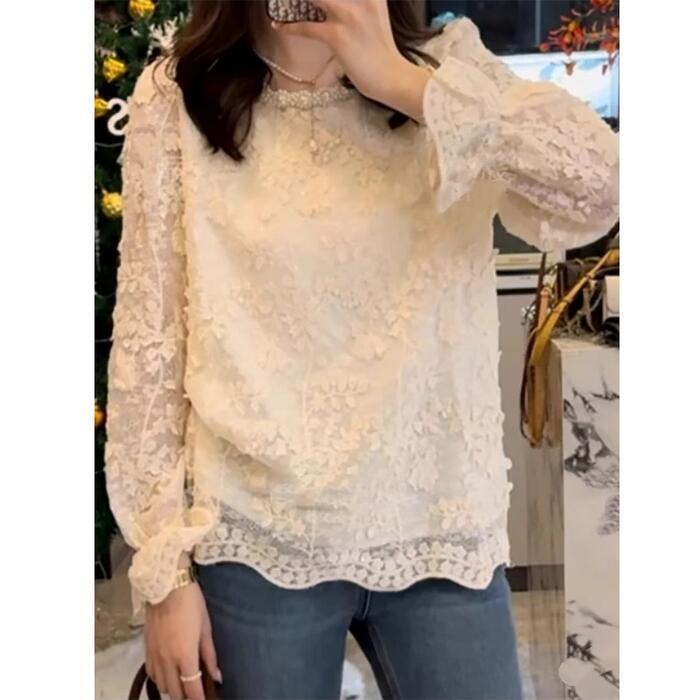 大きいサイズ 体型カバー トップス ブラウス シャツ Tシャツ カットソー プルオーバー レース パール ビジュー ジャガード エレガント レディース 大人 可愛い 長袖 きれいめ カジュアル フェミニン おしゃれ 透け感 上品 通勤 オフィス ベージュ 春 秋 冬 20代 30代 40代 50代