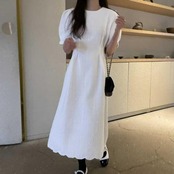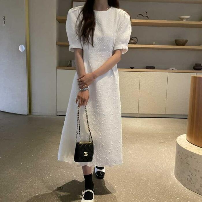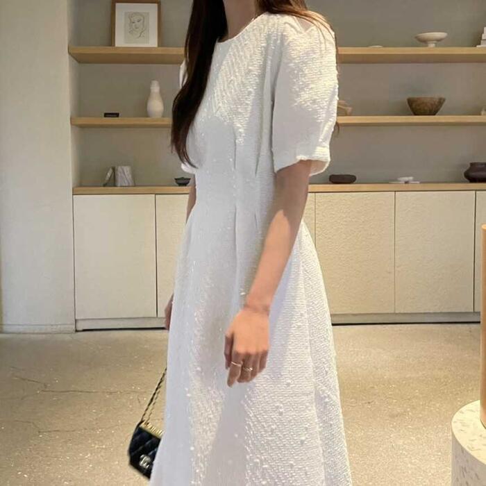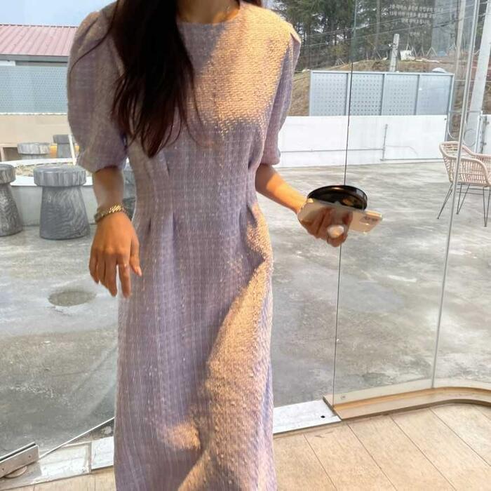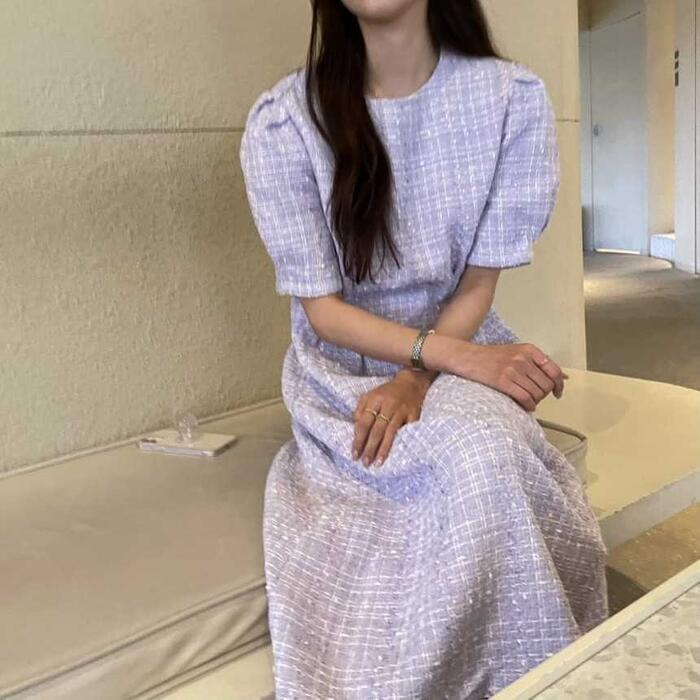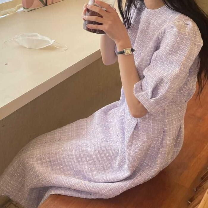 全2色 大きいサイズ 体型カバー ワンピース ドレス 袖あり レディース ツイード エレガント きれいめ カジュアル ミモレ丈 大人 可愛い おしゃれ 半袖 パフスリーブ フェミニン Aライン シンプル オフィス 上品 韓国 パープル ホワイト 白 春 夏 秋 20代 30代 40代 50代