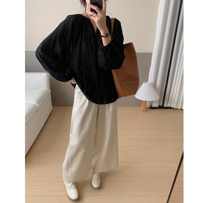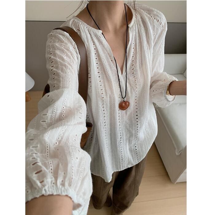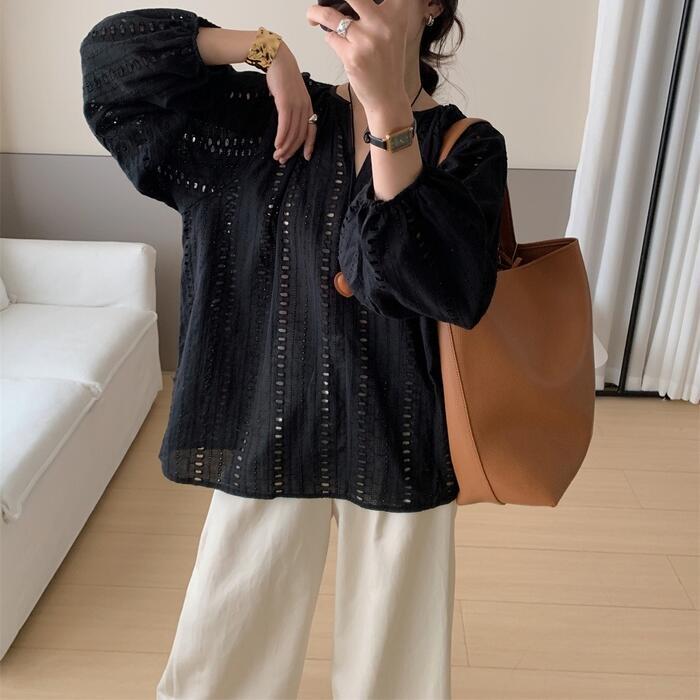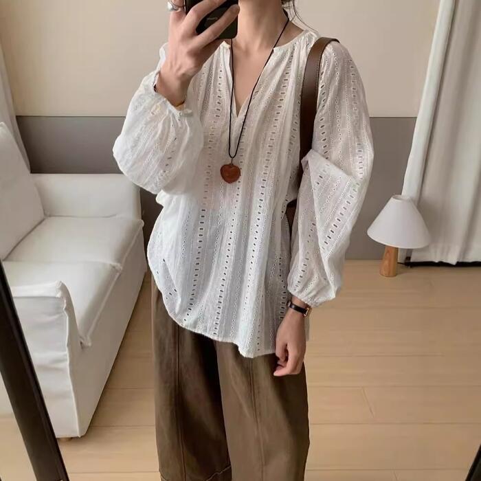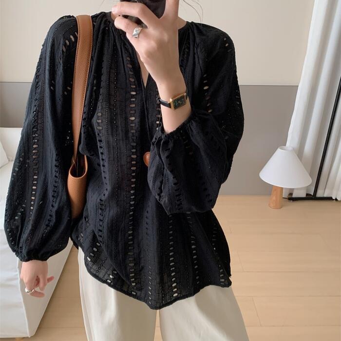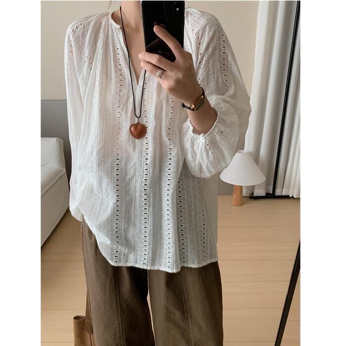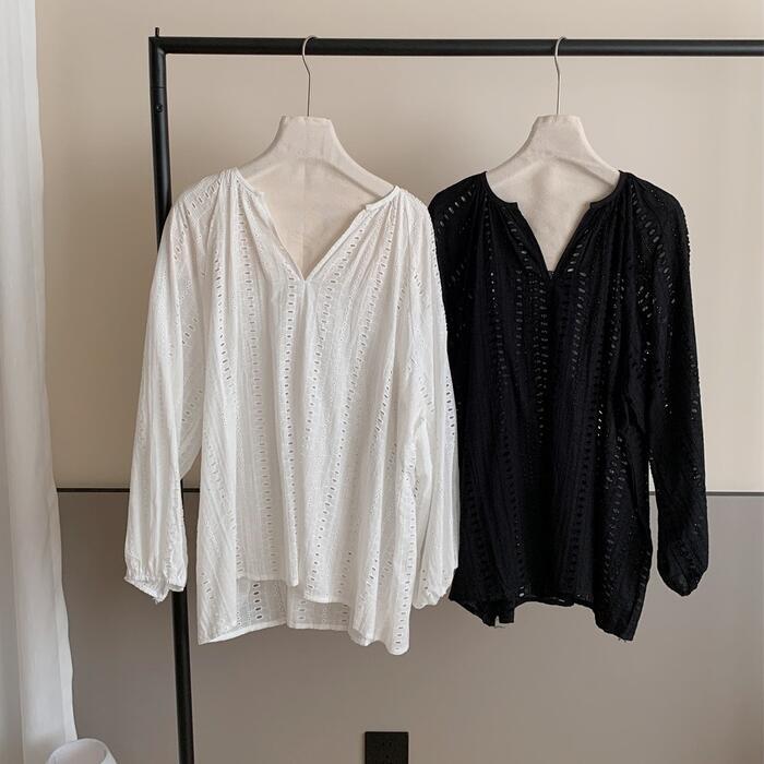 全2色 体型カバー Vネック トップス ブラウス シャツ プルオーバー レース スキッパー エレガント レディース 大人 可愛い 長袖 透け感 きれいめ カジュアル フェミニン おしゃれ ナチュラル ゆったり オーバーサイズ ホワイト 白 ブラック 黒 春 秋 夏 20代 30代 40代 50代