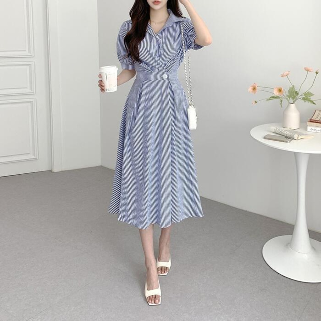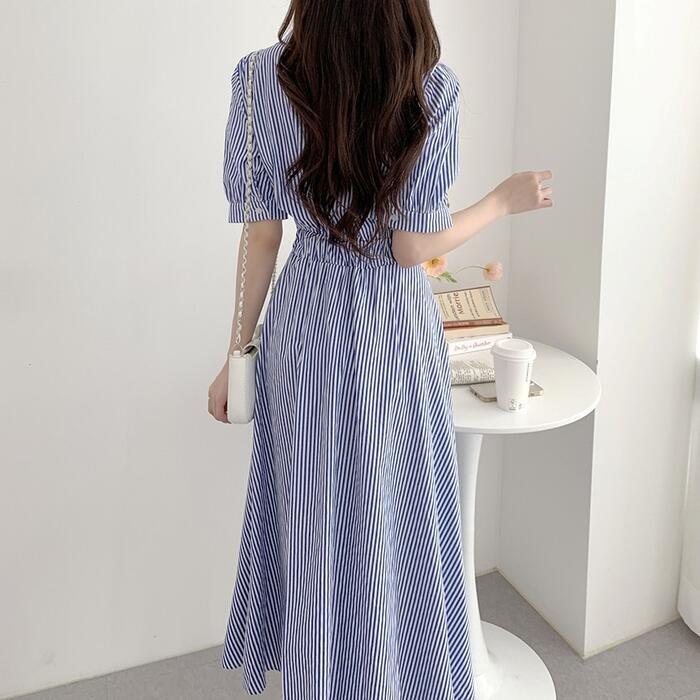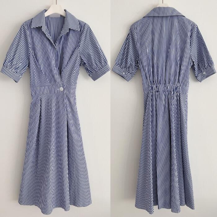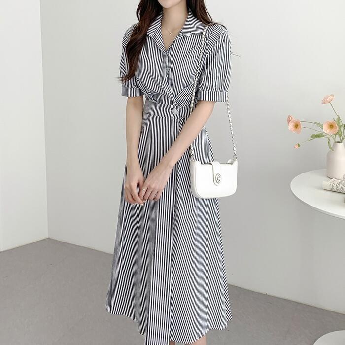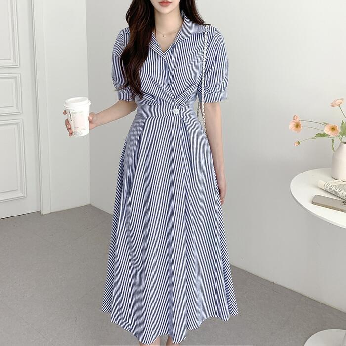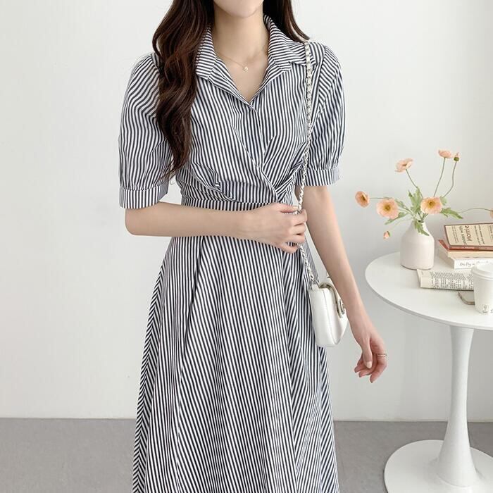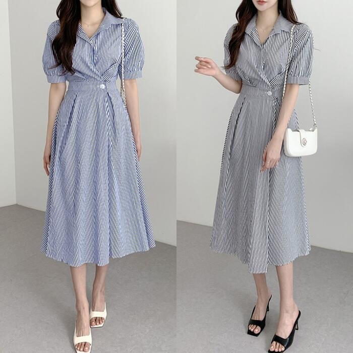 全2色 大きいサイズ 体型カバー ハイウエスト フェミニン ワンピース ドレス 袖あり ストライプ シャツワンピ レディース エレガント きれいめ カジュアル ミモレ丈 大人 可愛い おしゃれ 半袖 パフスリーブ Aライン シンプル オフィス 上品 韓国 ブルー 青 ブラック 黒 春 夏 秋 20代 30代 40代 50代
