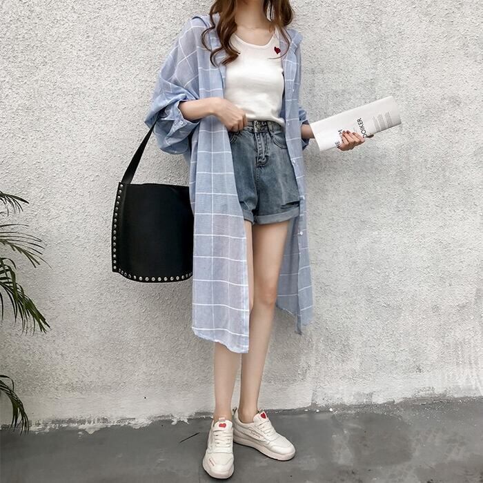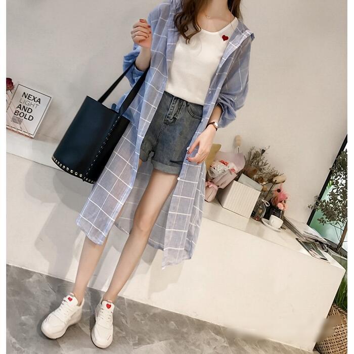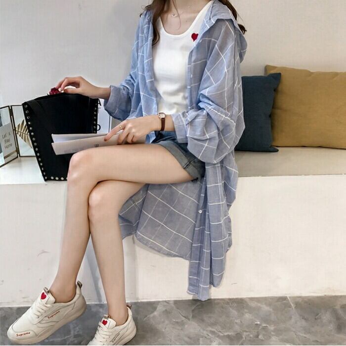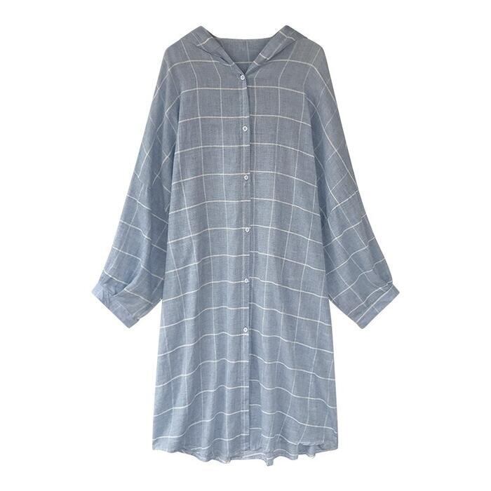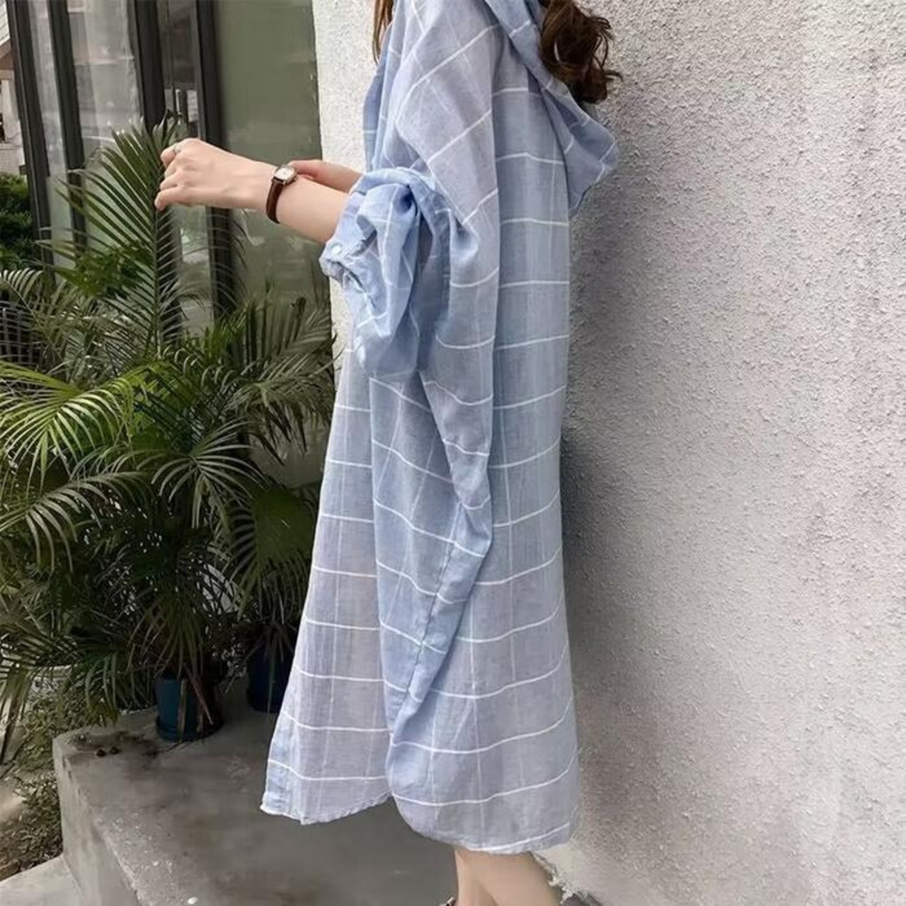 大きいサイズ 体型カバー シャツワンピ アウター カーディガン ジャケット 羽織り シャツ チェック フード パーカー ライトアウター エレガント レディース 大人 可愛い 七分袖 きれいめ カジュアル フェミニン おしゃれ 韓国 ゆったり 青 ブルー 春 秋 夏 20代 30代 40代 50代