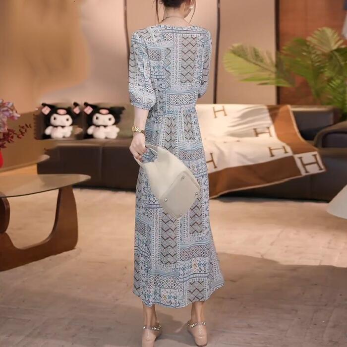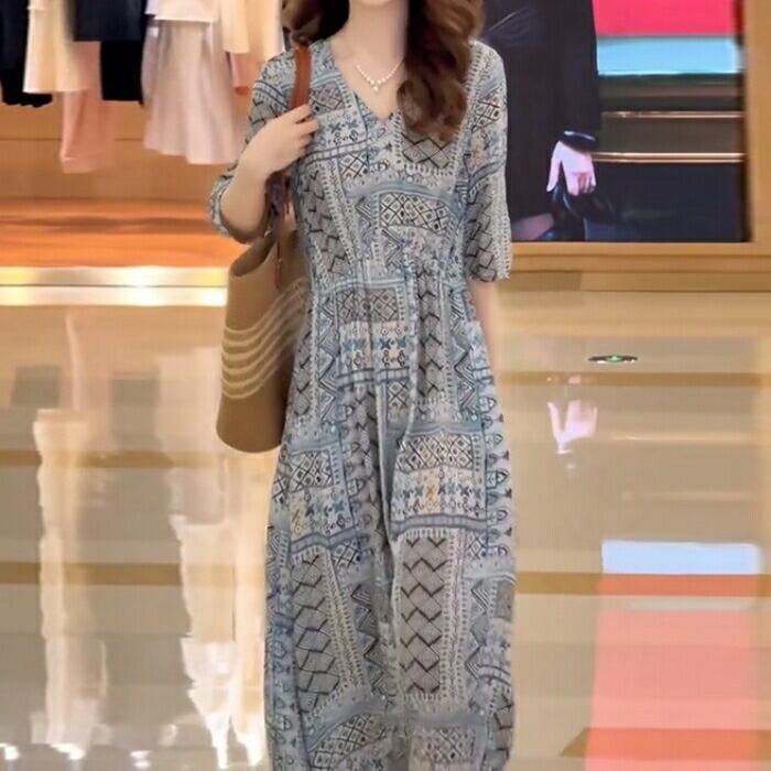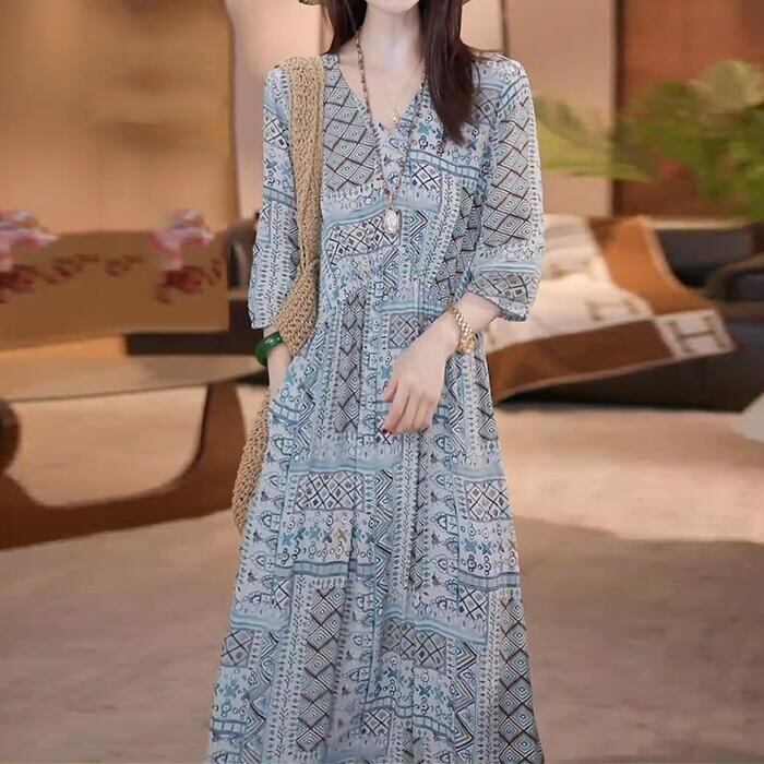 大きいサイズ 体型カバー ワンピース ワンピ ドレス プリント エスニック レディース エレガント きれいめ カジュアル 大人 可愛い フェミニン ロング丈 ロングワンピ Aライン 五分袖 幾何学 ゆったり 楽ちん リゾート 青 ブルー 春 夏 秋 20代 30代 40代 50代