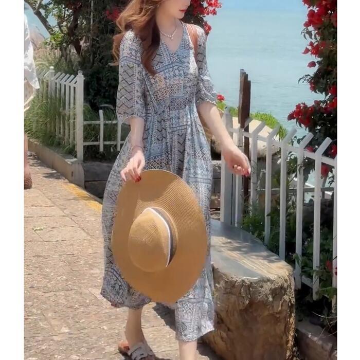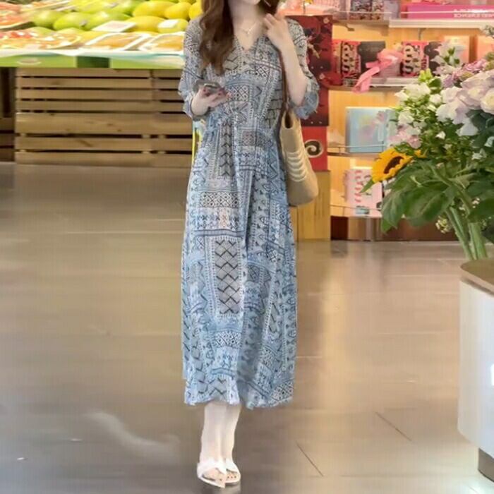 エスニックテイストなプリント柄が着映えるロングワンピース。