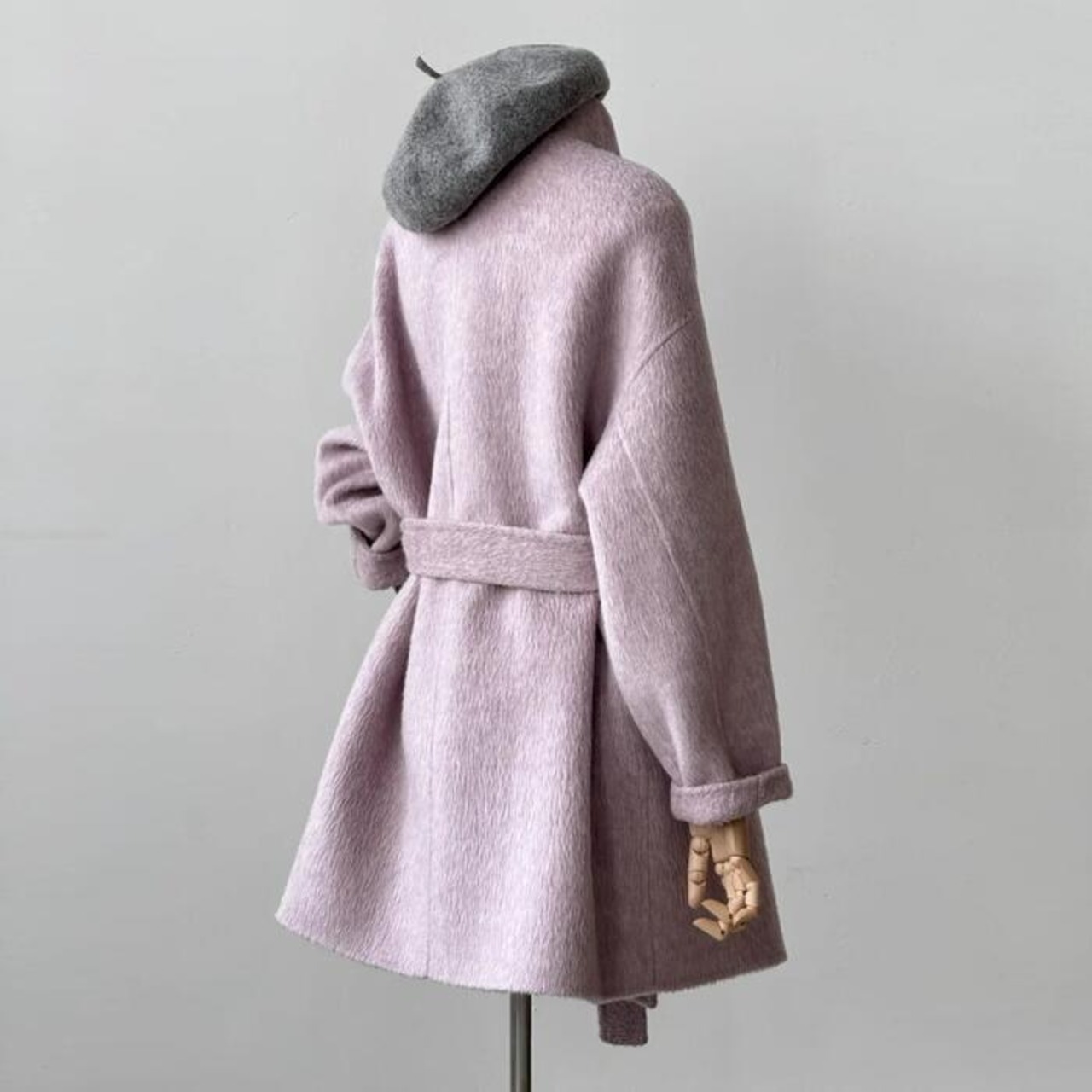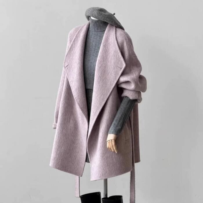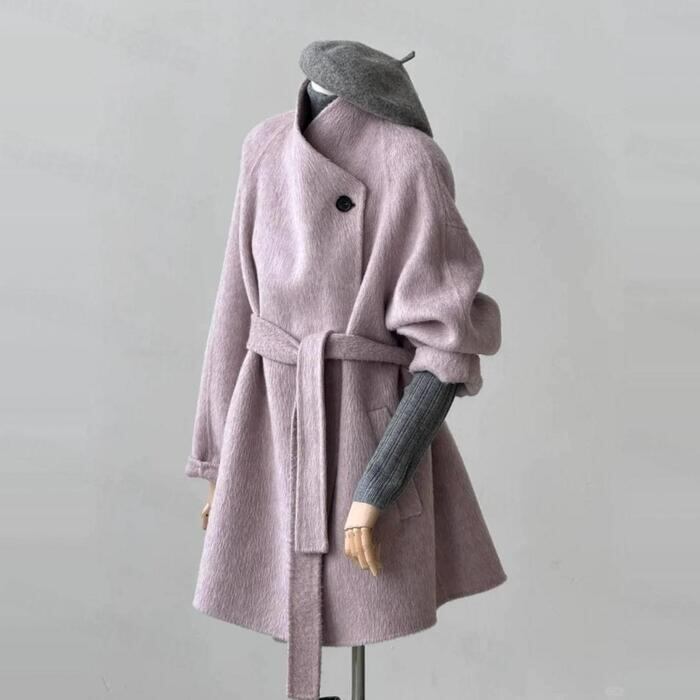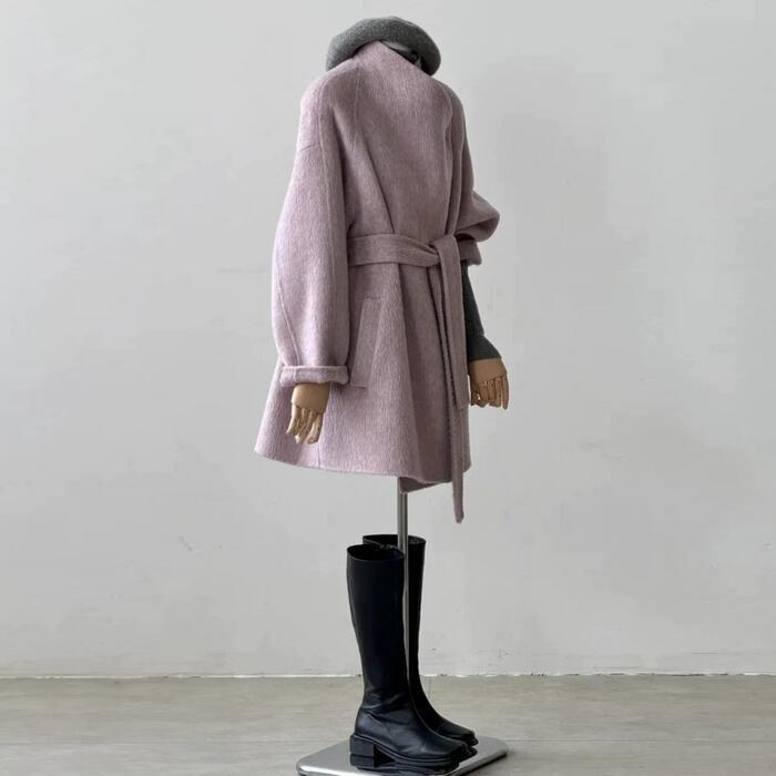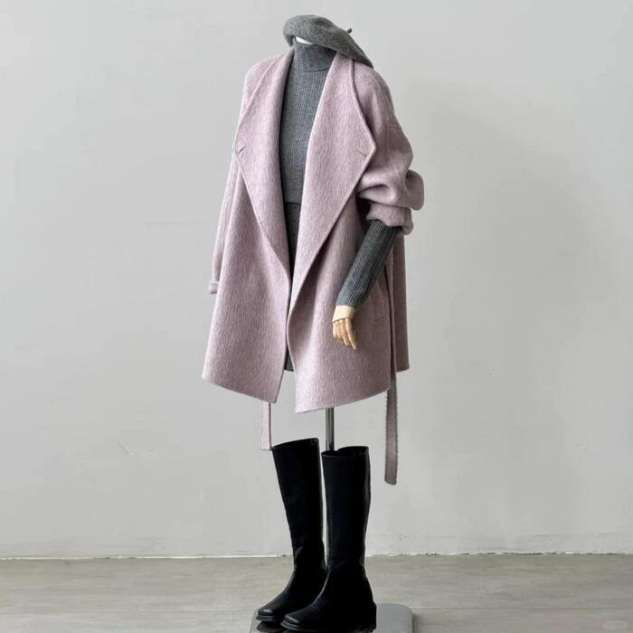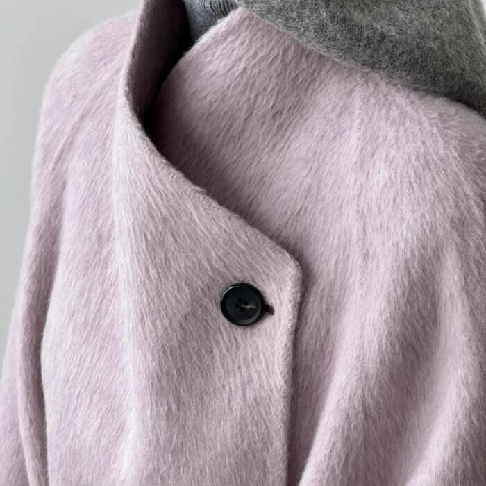 上品でリュクス感が漂う、ノーカラーのミディ丈コート。