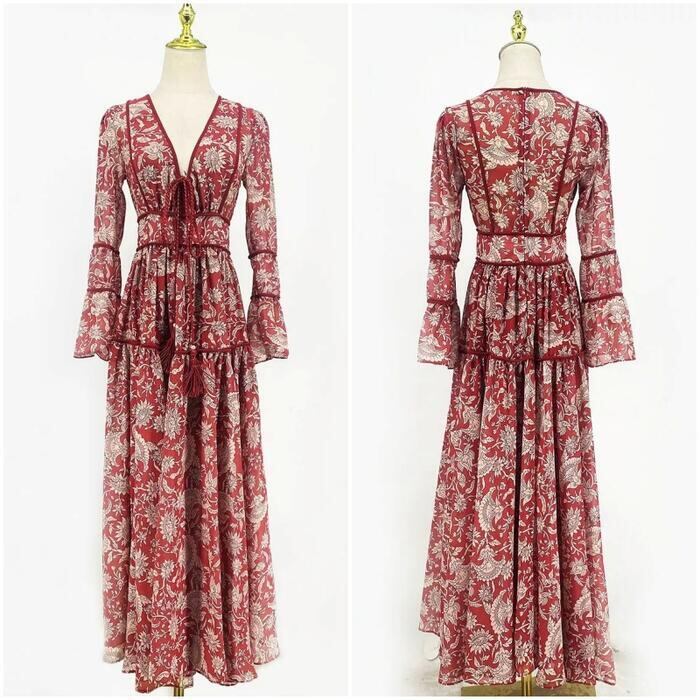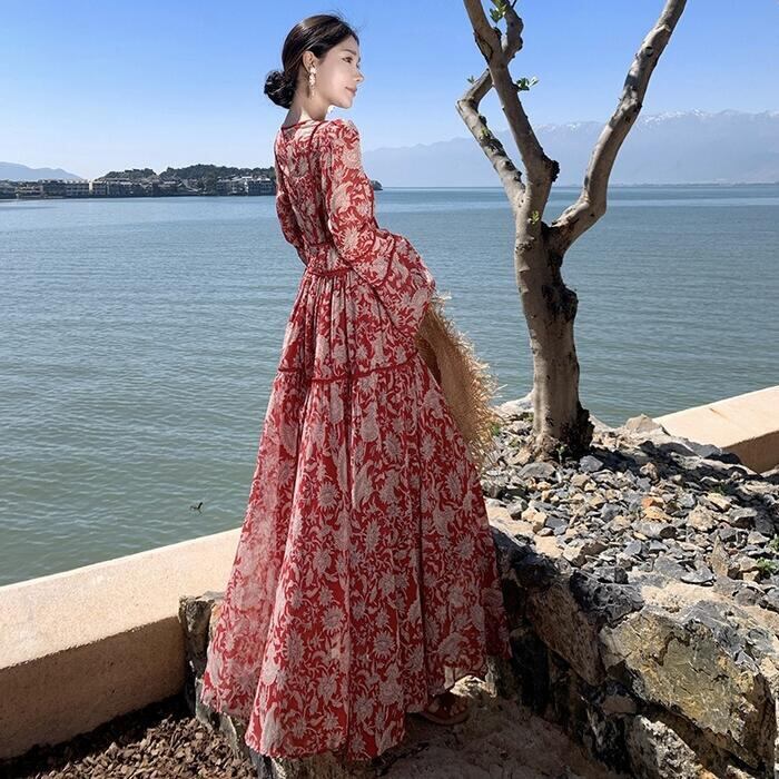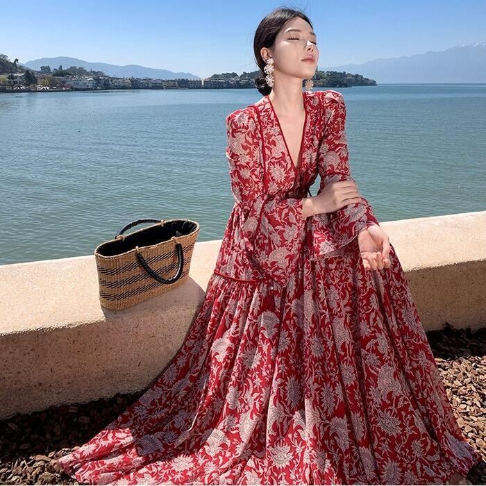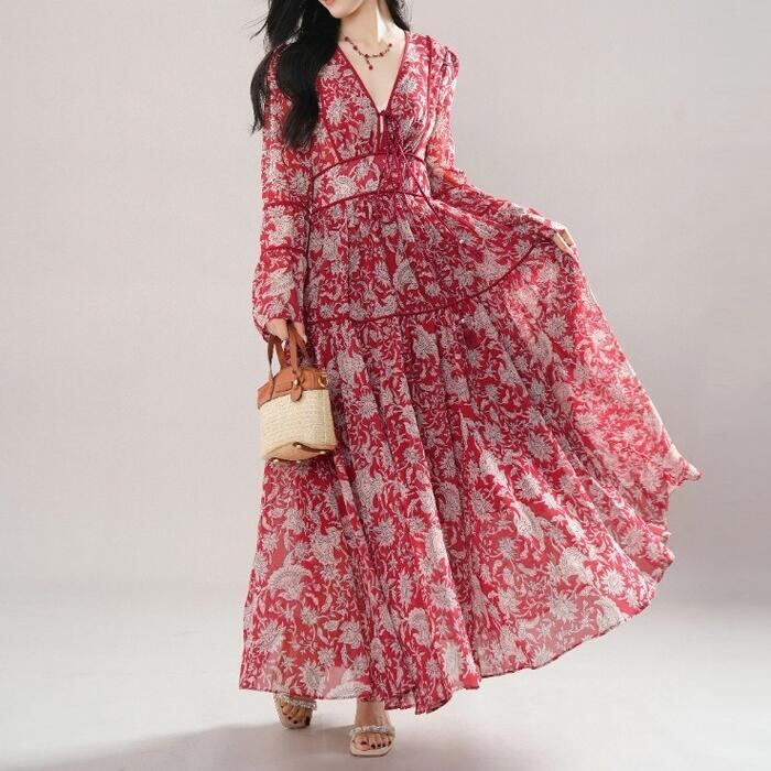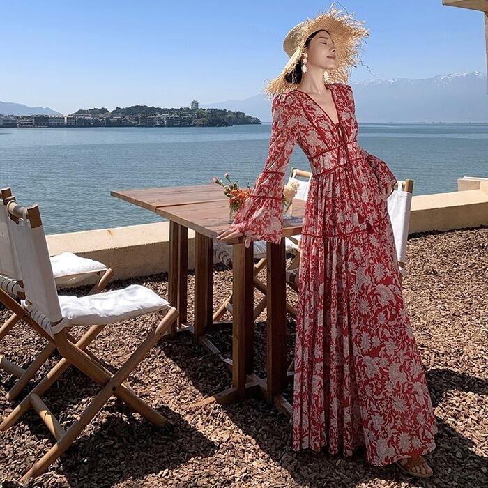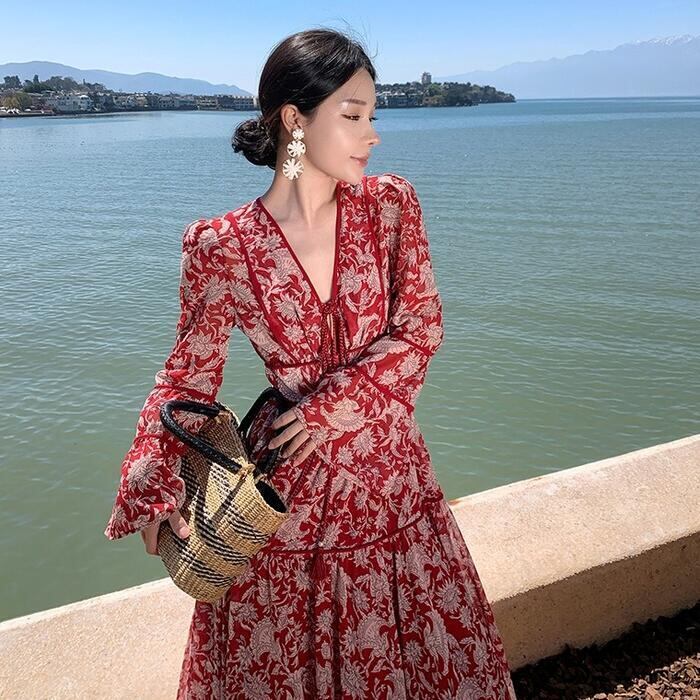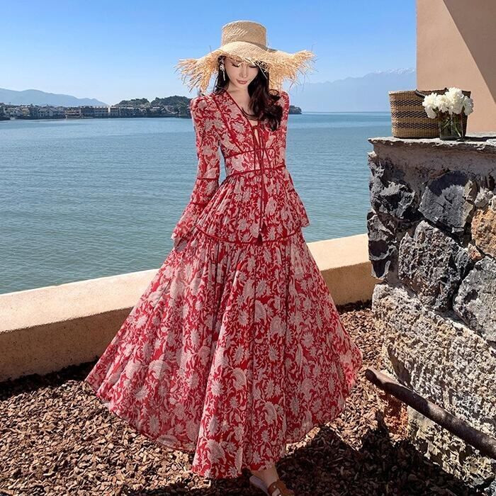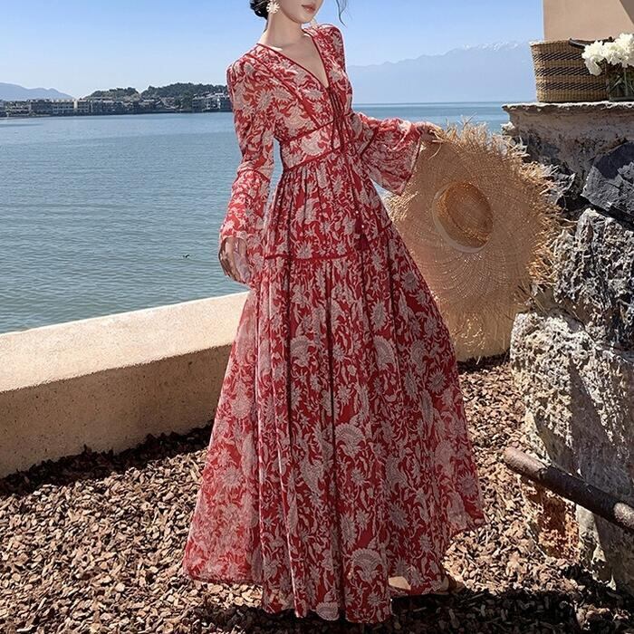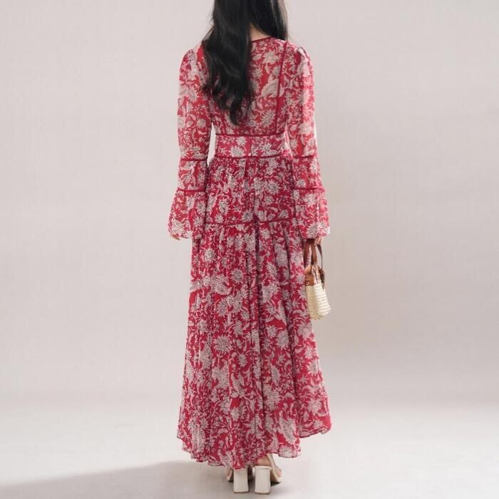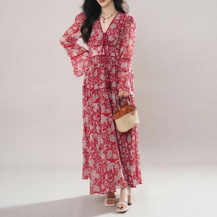 大きいサイズ 体型カバー リゾート ワンピース ワンピ ドレス プリント フラワー ボタニカル 花 レディース エレガント きれいめ カジュアル 大人 可愛い フェミニン ティアード Vネック ロング丈 マキシ丈 Aライン 長袖 ベルスリーブ レッド 赤 春 夏 秋 20代 30代 40代 50代