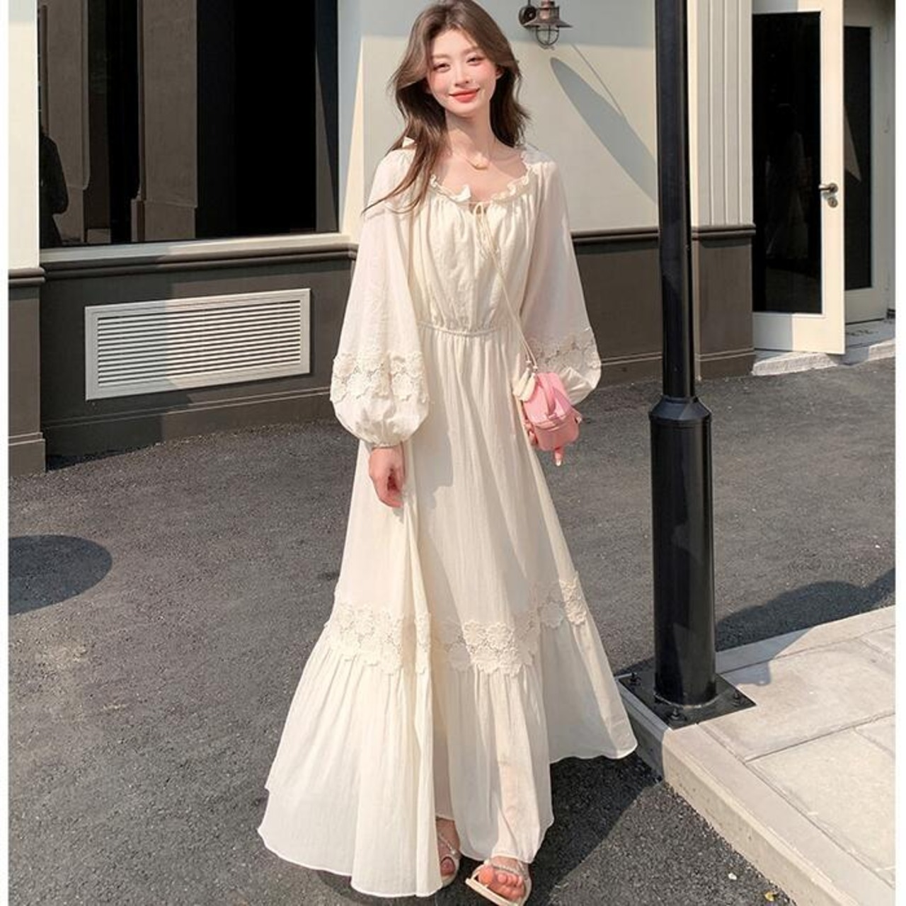 フラワーレースがポイントになったロングワンピース。