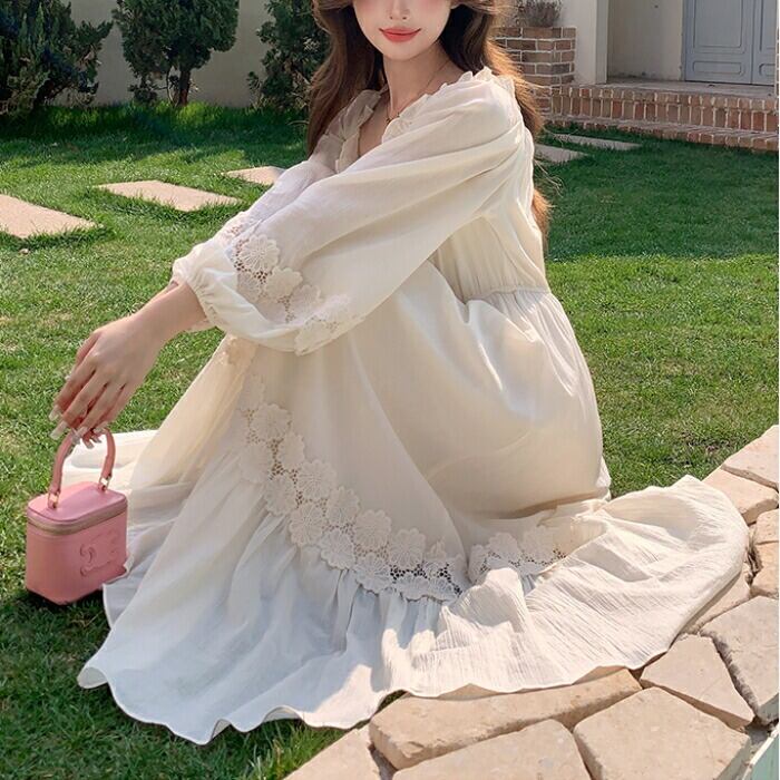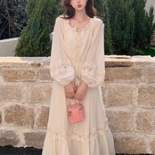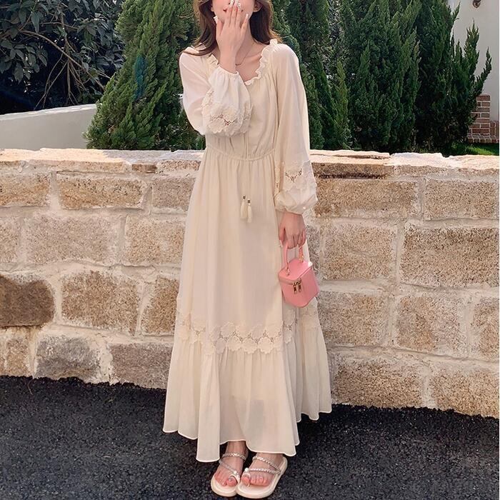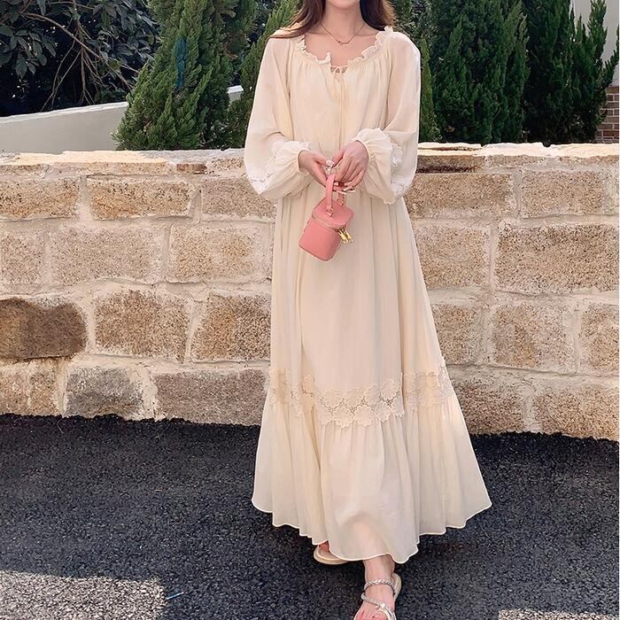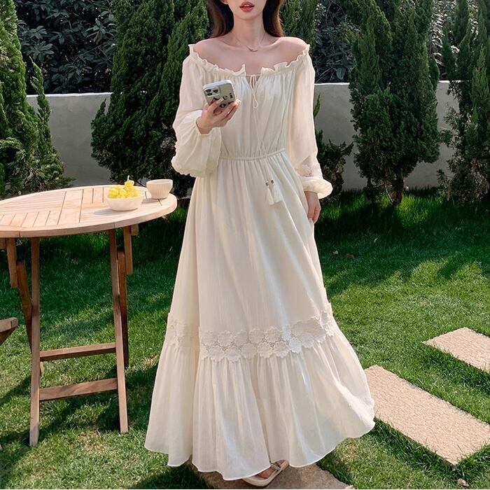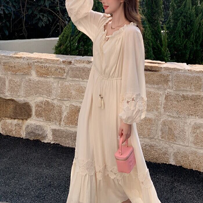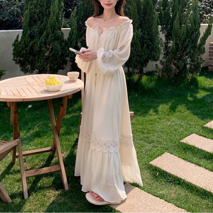 大きいサイズ 体型カバー ナチュラル ロング丈 Aライン ワンピース ワンピ ドレス ロングワンピ フラワー レース パフスリーブ フリル リボン タッセル レディース エレガント きれいめ カジュアル 大人 可愛い フェミニン 韓国 長袖 ゆったり 楽ちん オフショルダー ベージュ 春 夏 秋 20代 30代 40代 50代