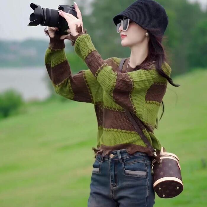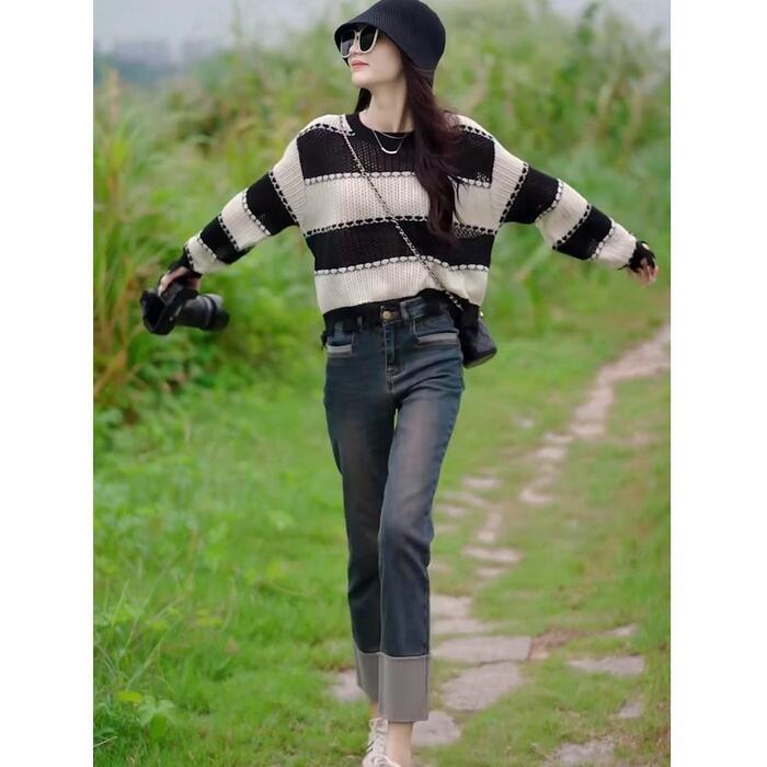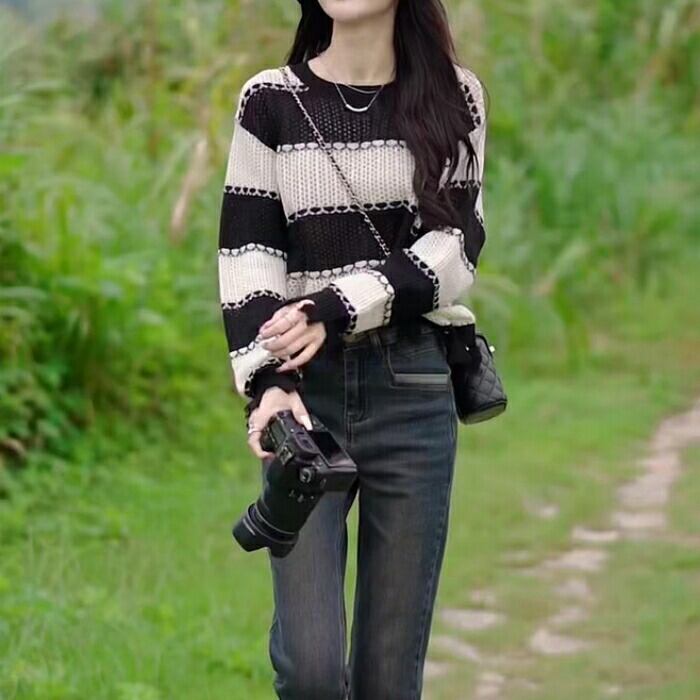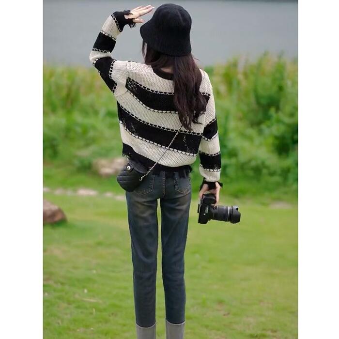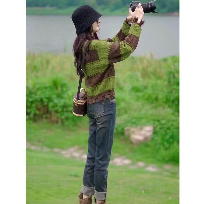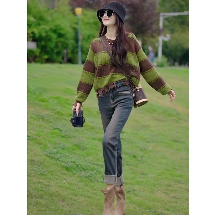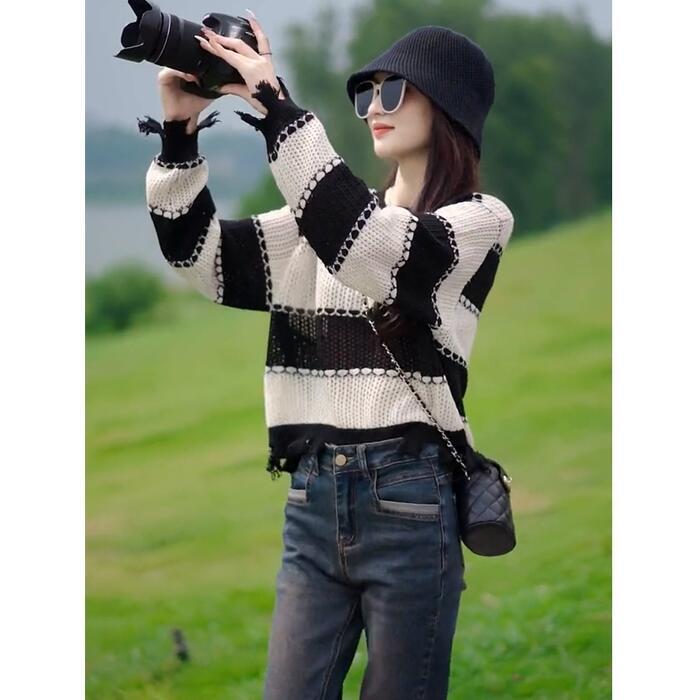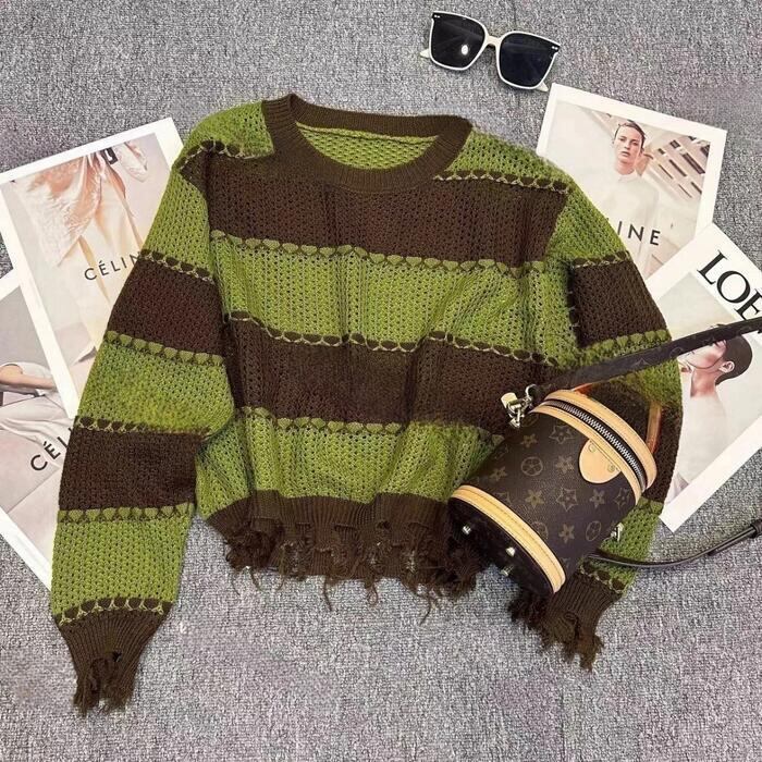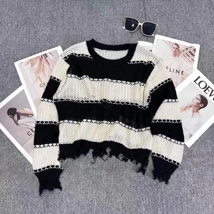 全2色 大きいサイズ 体型カバー トップス ボーダー カットソー ニット プルオーバー セーター ダメージ加工 エレガント レディース 大人 可愛い きれいめ カジュアル フェミニン 長袖 シンプル おしゃれ ショート丈 ブラック 黒 グリーン 緑 春 秋 冬 20代 30代 40代 50代