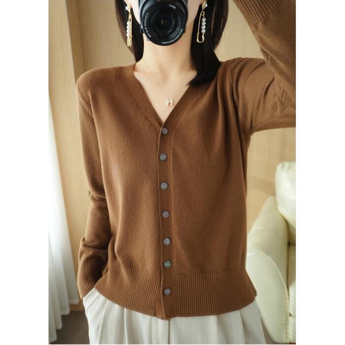顔周りをすっきりみせるVネックのニットカーディガン。