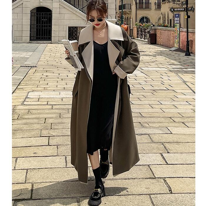 大きいサイズ 体型カバー オーバーサイズ ロング丈 ロングコート アウター コート ジャケット チェスター トレンチ バイカラー ビッグカラー レディース エレガント きれいめ カジュアル 大人 可愛い フェミニン おしゃれ ゆったり 羽織り かっこいい ウエストベルト グリーン 緑 春 秋 冬 20代 30代 40代 50代